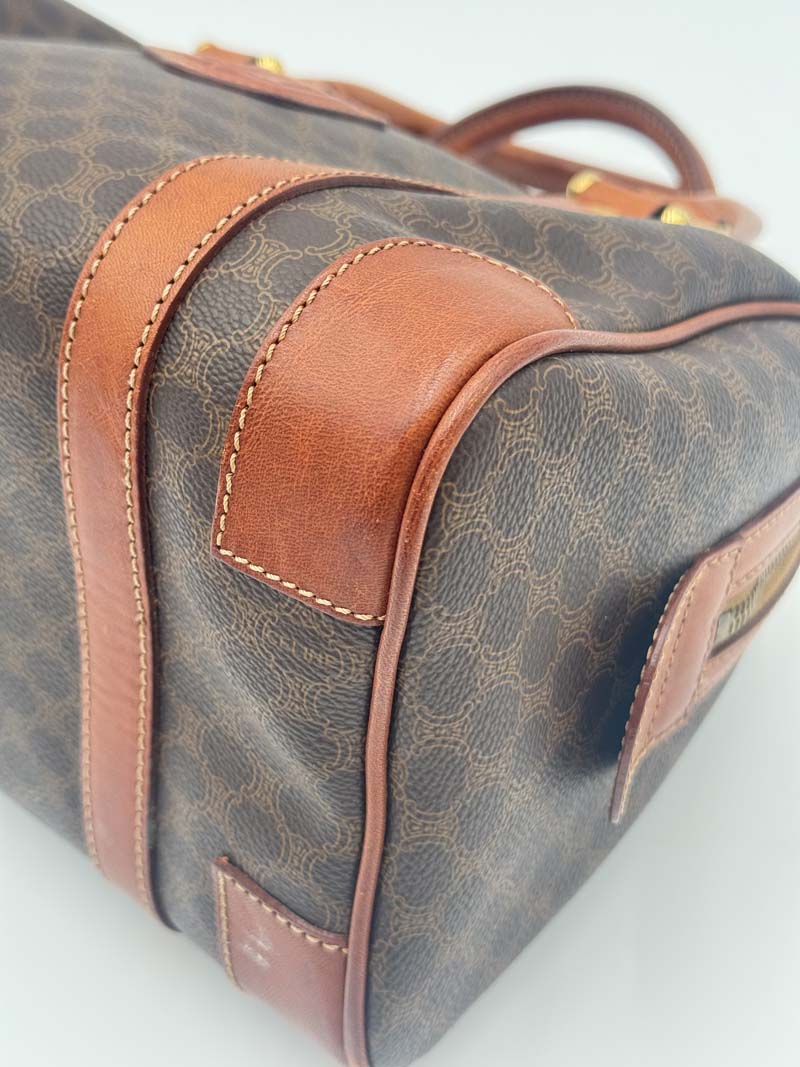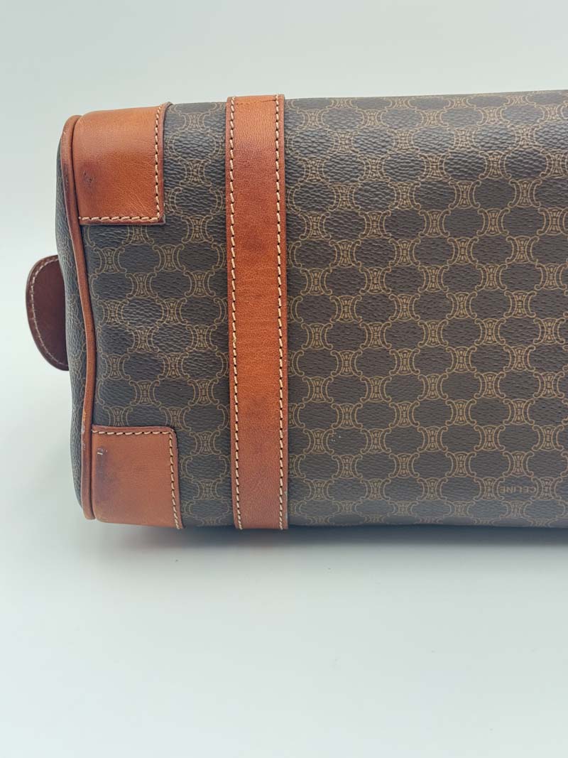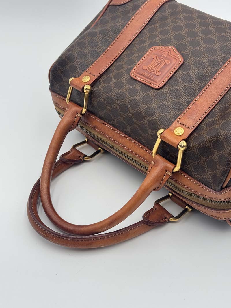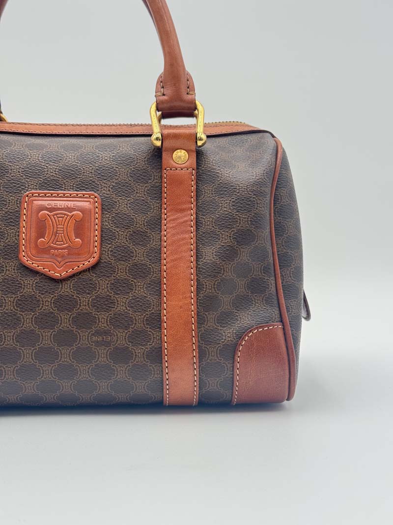 This vintage Celine Macadam Canvas Boston Bag is a handbag made from brown PVC canvas with gold hardware. The item shows some user signs but is still in a very good condition, with light imperfections and signs of use such as wear on the corners. The interior is clean and features one extra clean pocket, and the bag has a zipper closure that works properly. Dimensions: 24 x 20 x 14 cm. The bag has a well-formed shape.
