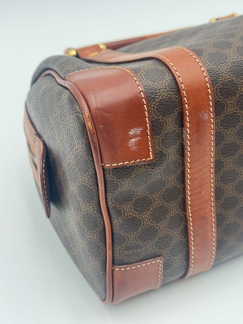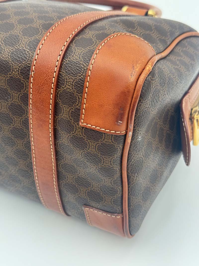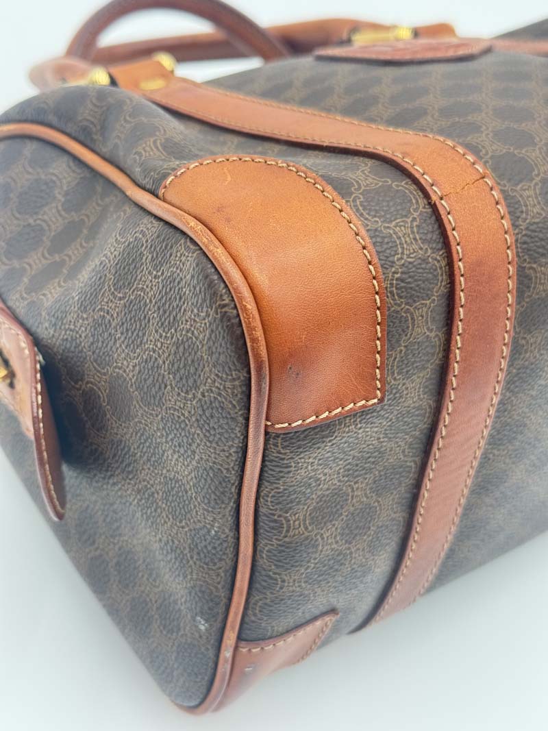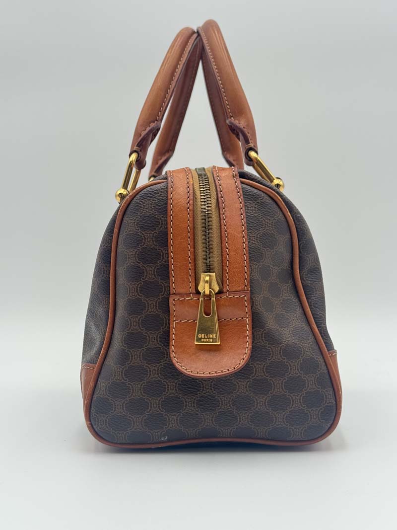 This vintage Celine Macadam Canvas Boston Bag is a handbag made from brown PVC canvas with gold hardware. The item shows some user signs but is still in a very good condition, with light imperfections and signs of use such as wear on the corners. The interior is clean and features one extra clean pocket, and the bag has a zipper closure that works properly. Dimensions: 24 x 20 x 14 cm. The bag has a well-formed shape.