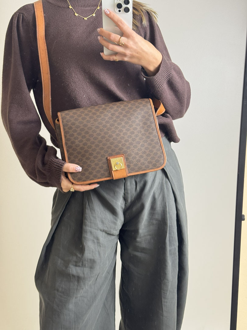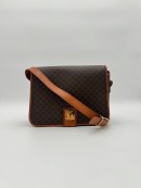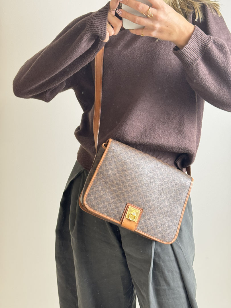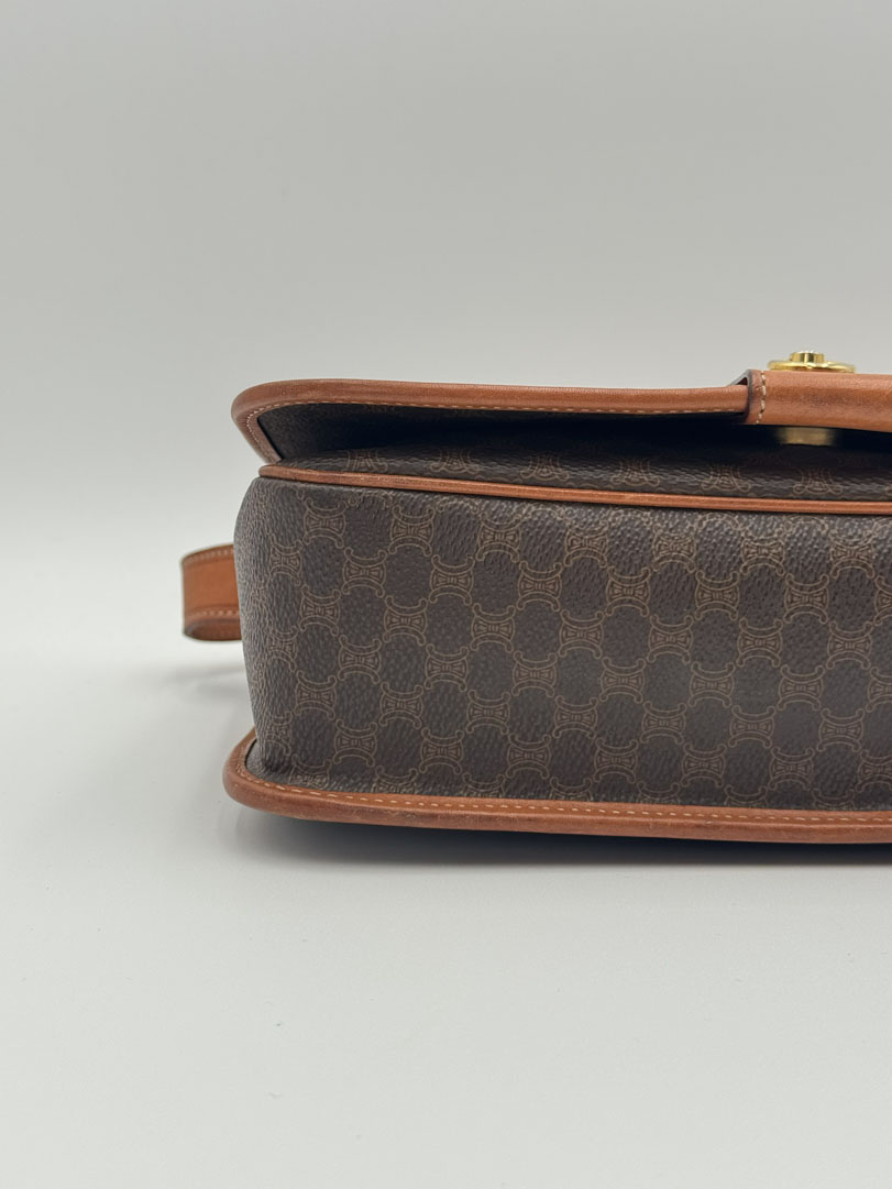 This vintage Celine Macadam Canvas Shoulder Bag is a shoulder bag made from dark brown PVC leather with gold-tone hardware. The item is in very good condition, showing some user signs such as wear on the corners. The interior is clean with an extra pocket, and the bag closes with a magnetic button. The strap is adjustable and shown on the longest setting in the photo. The dimensions are 27 x 21.5 x 7 cm.