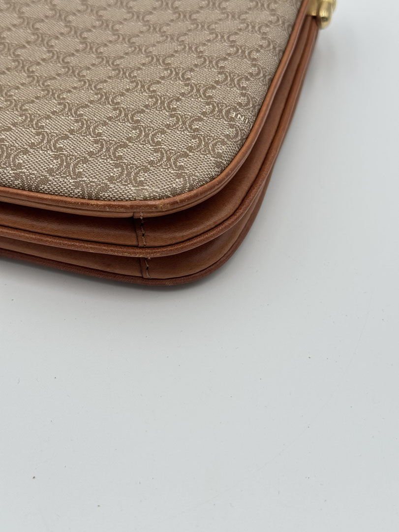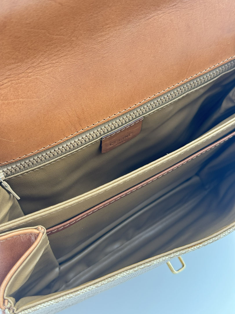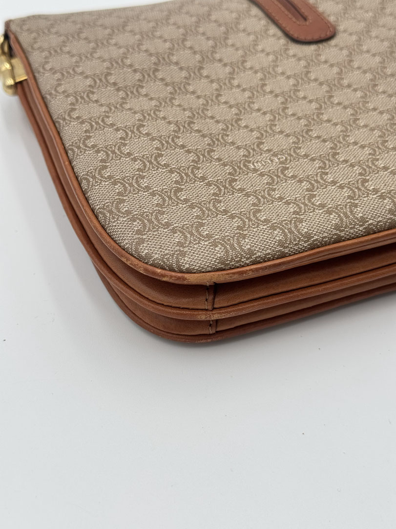 This vintage Celine Macadam Clutch is a clutch made from light brown PVC leather with gold-tone hardware. The item is in very good condition, showing some user signs. The interior is clean with an extra pocket. The strap for crossbody wear is not included, but the bag has the option to attach a strap to wear it over the shoulder or crossbody.