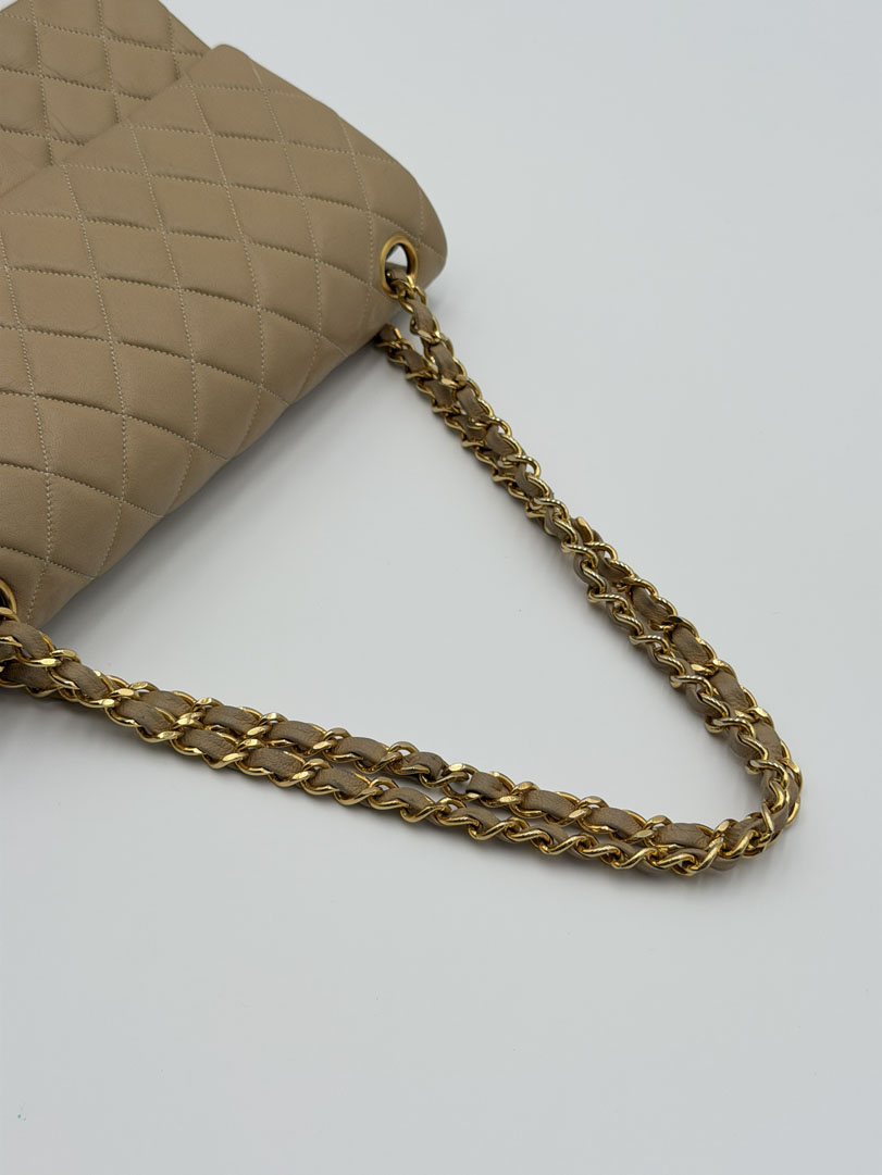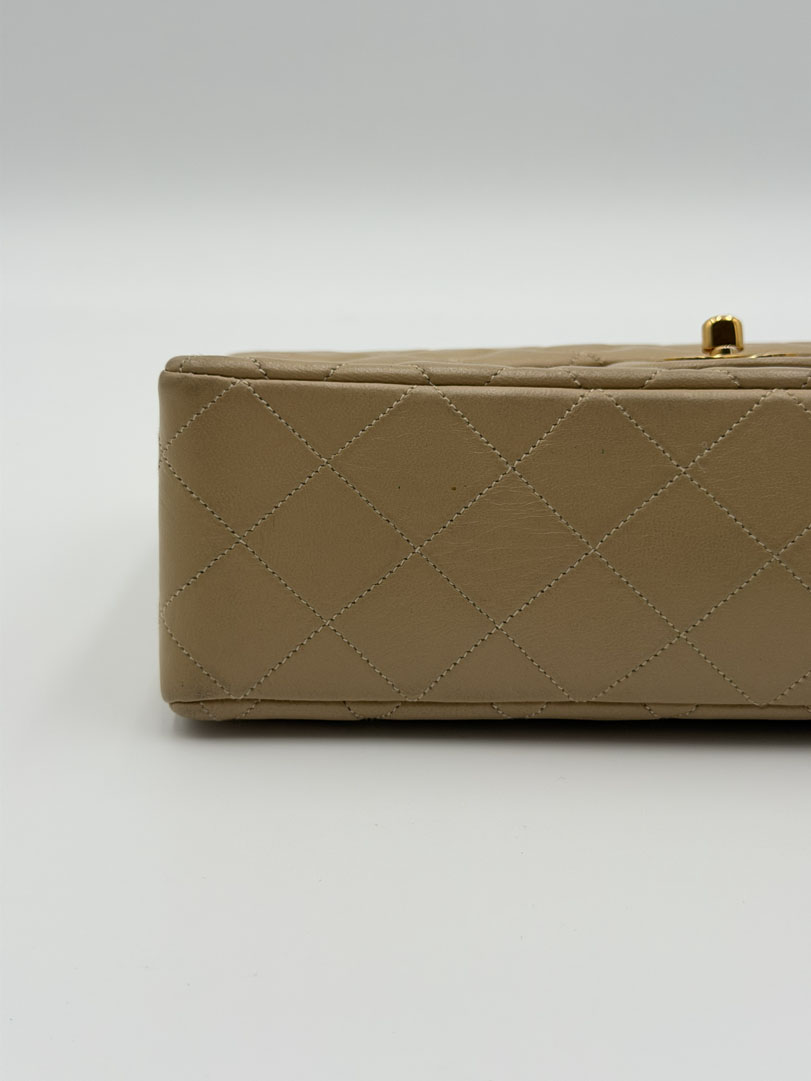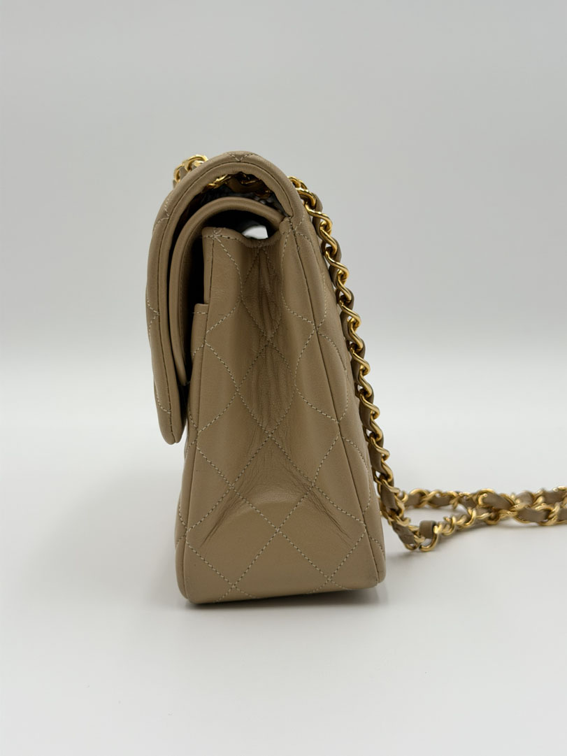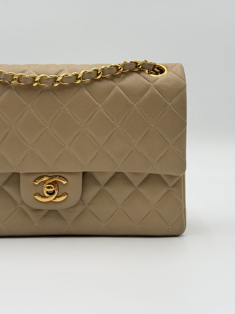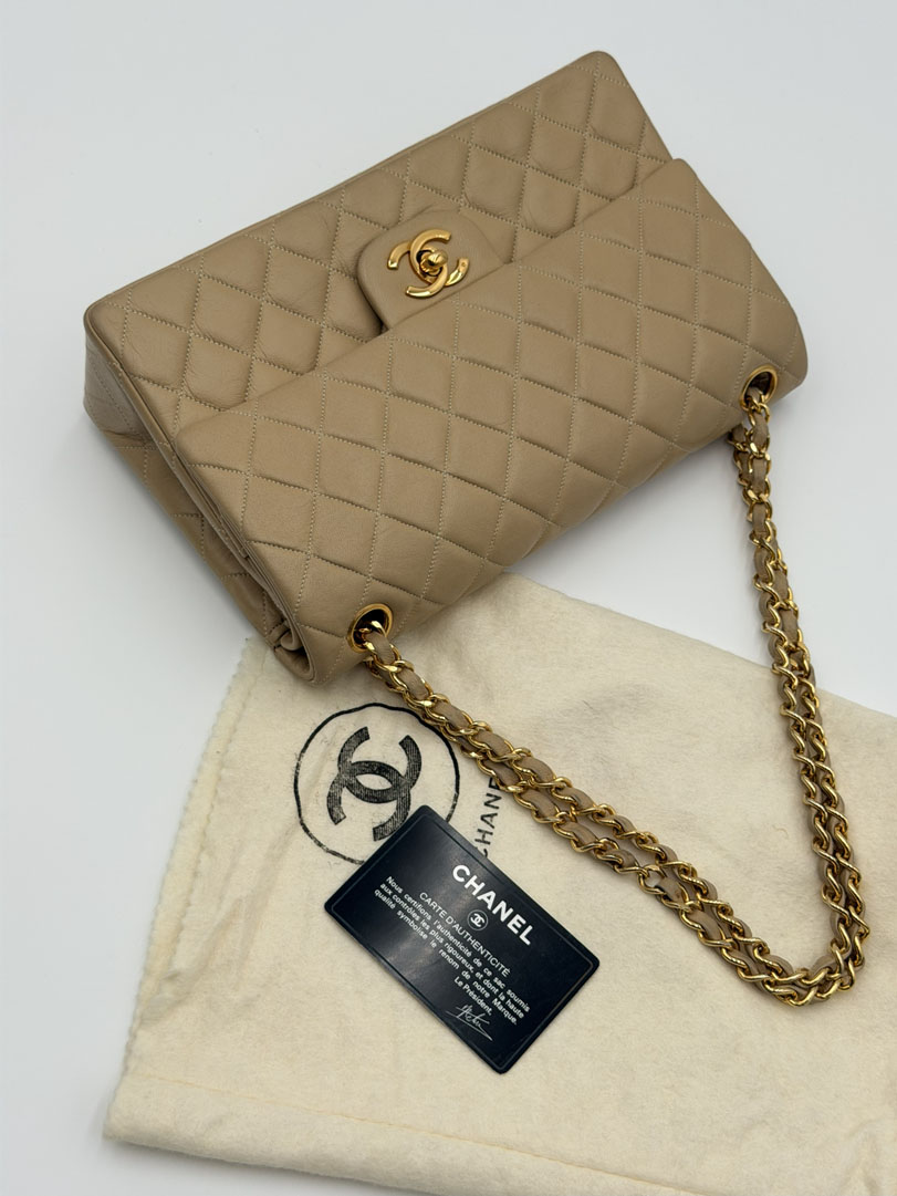 This vintage Chanel Double Flap Bag Medium is a shoulder bag crafted from beige lambskin leather with 24k gold-plated hardware. It is in very good condition, with some light dents on the back while the hardware still shines beautifully. The leather remains buttery soft, and the interior is clean with extra pockets. This classic double flap design can be worn short or long over the shoulder. It comes with a dustbag and authenticity card. The serial number is 116559, dating from 1989–1991. Dimensions: 25.5 x 16 x 6.5 cm.