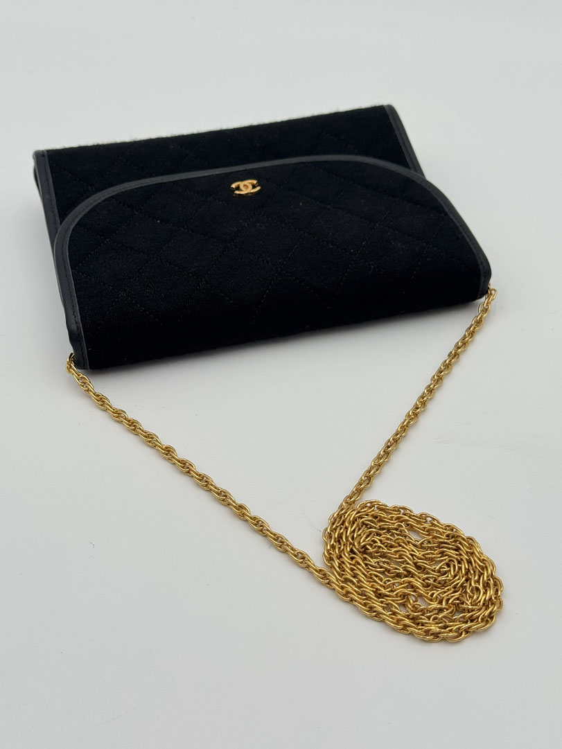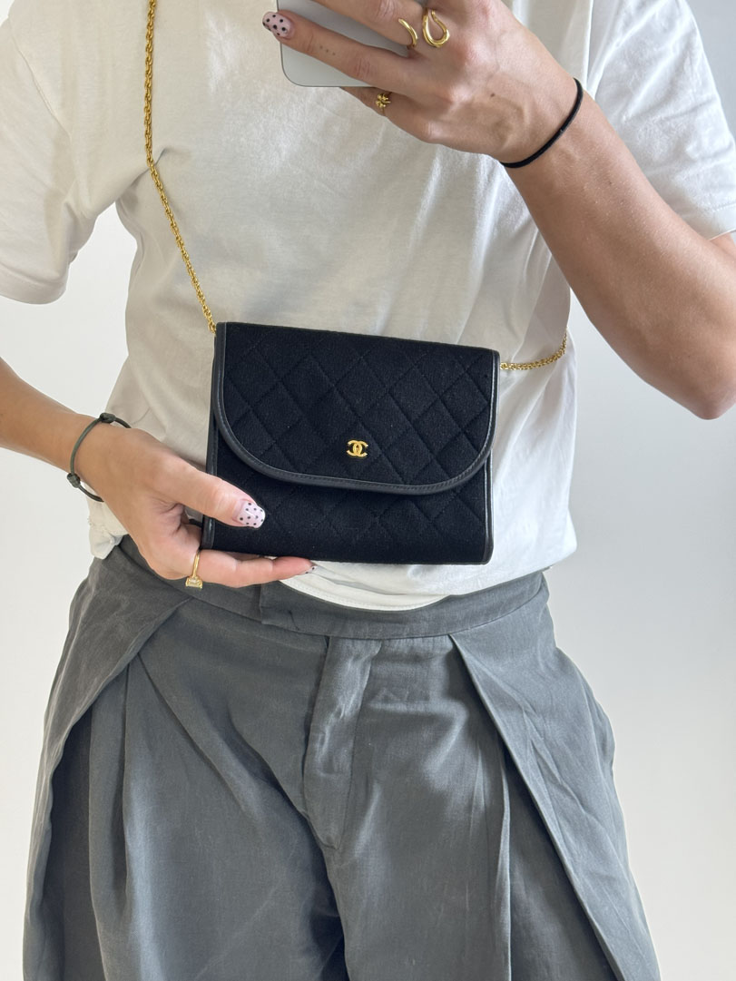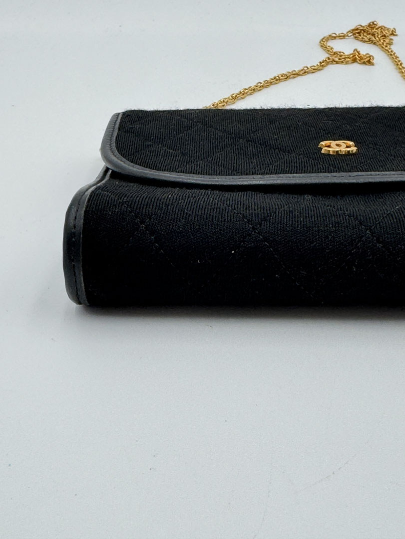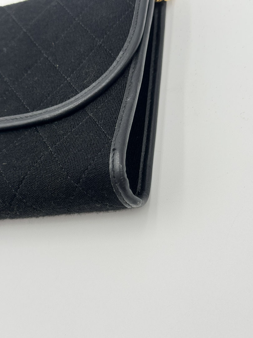 This vintage Chanel Matelassé Mini Crossbody is a crossbody bag made from black fabric with 24k gold-plated hardware. The item is in excellent condition, lightly used with almost no noticeable flaws. The interior is clean, and the bag closes with a snap button that works properly. The chain can be worn crossbody or doubled to wear over the shoulder. The dimensions are 17 x 13 x 2 cm.