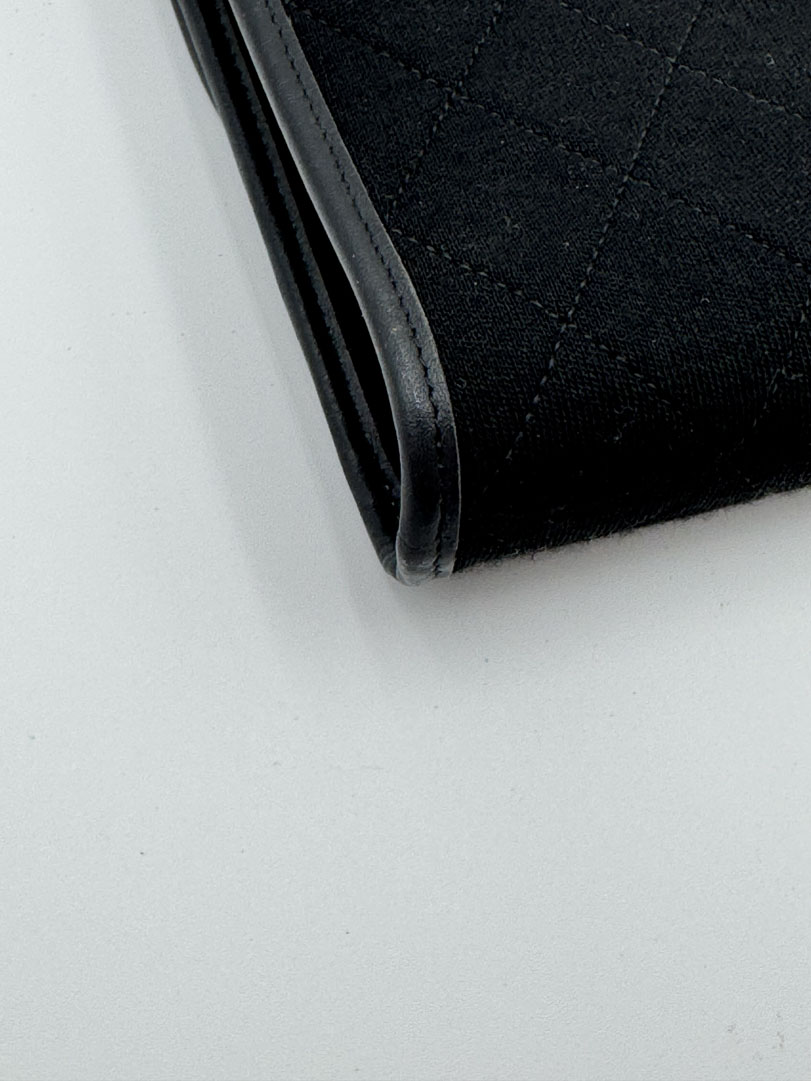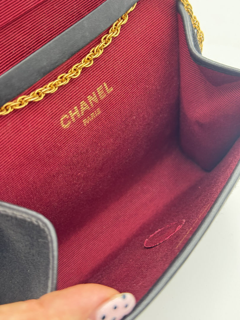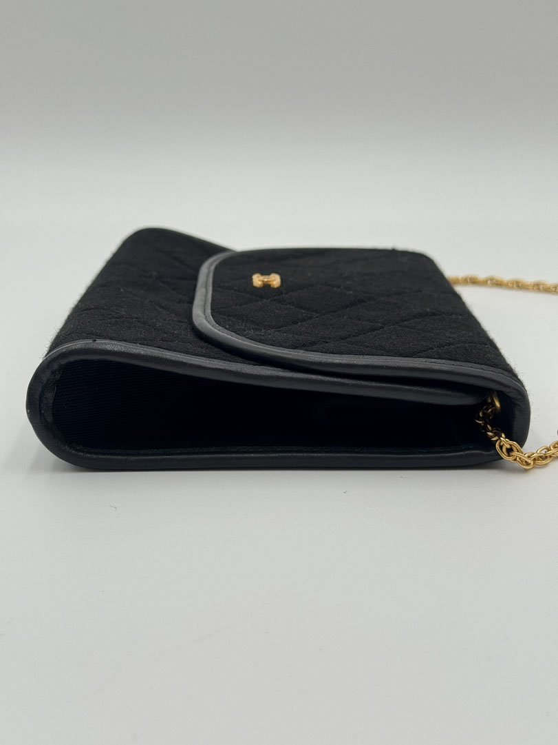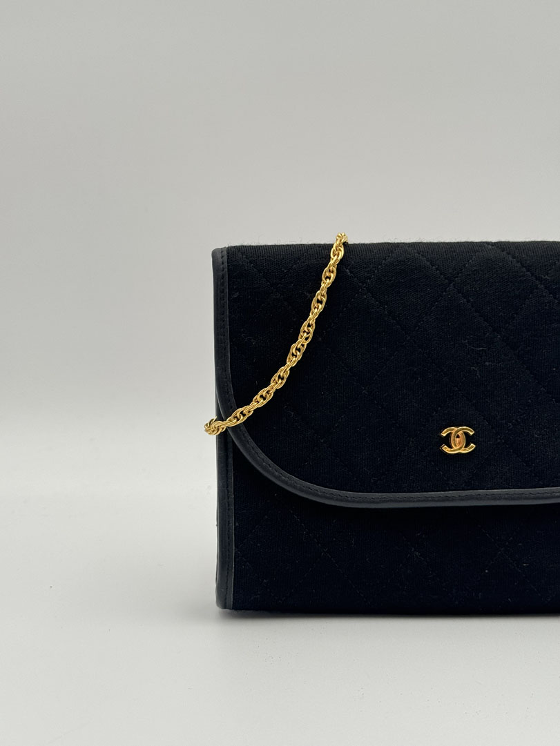 This vintage Chanel Matelassé Mini Crossbody is a crossbody bag made from black fabric with 24k gold-plated hardware. The item is in excellent condition, lightly used with almost no noticeable flaws. The interior is clean, and the bag closes with a snap button that works properly. The chain can be worn crossbody or doubled to wear over the shoulder. The dimensions are 17 x 13 x 2 cm.