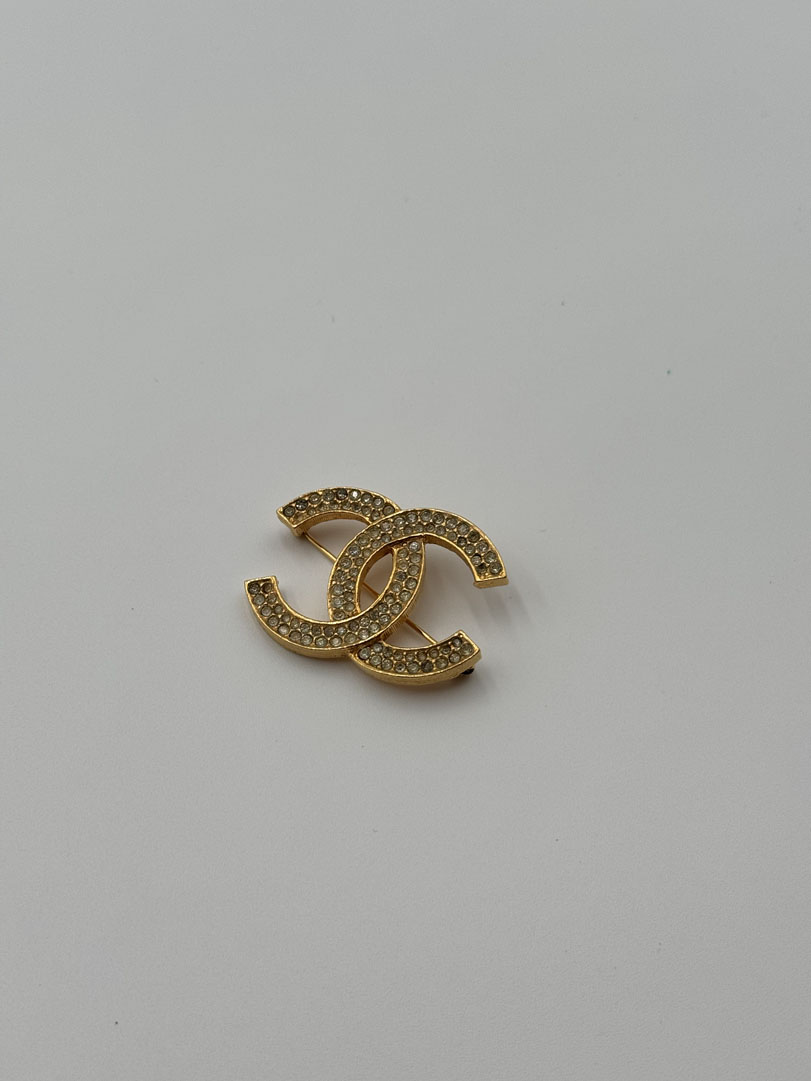 This vintage Chanel Rhinestone CC Brooch is crafted from gold-plated metal with 24k gold-plated hardware and rhinestone details. It is in excellent condition, lightly used with almost no noticeable flaws and only small imperfections such as fine scratches. The pin closure functions well, and the brooch can be worn on a blazer or styled on trousers for added detail. It comes with its box. Dimensions: 4 x 3 cm.