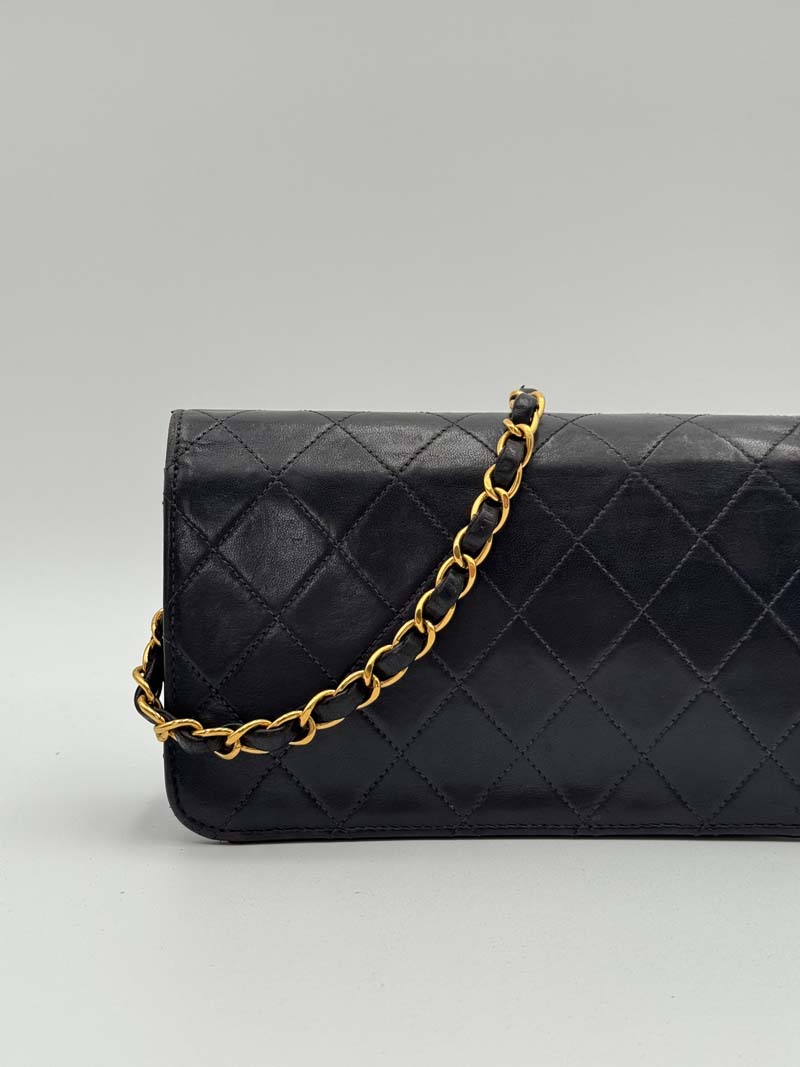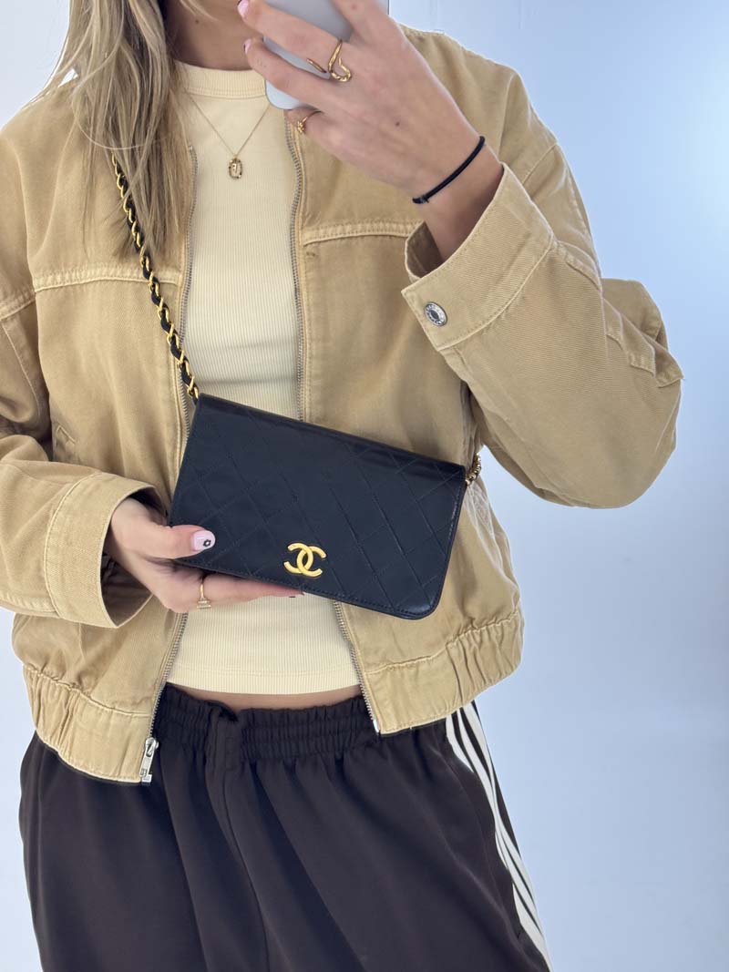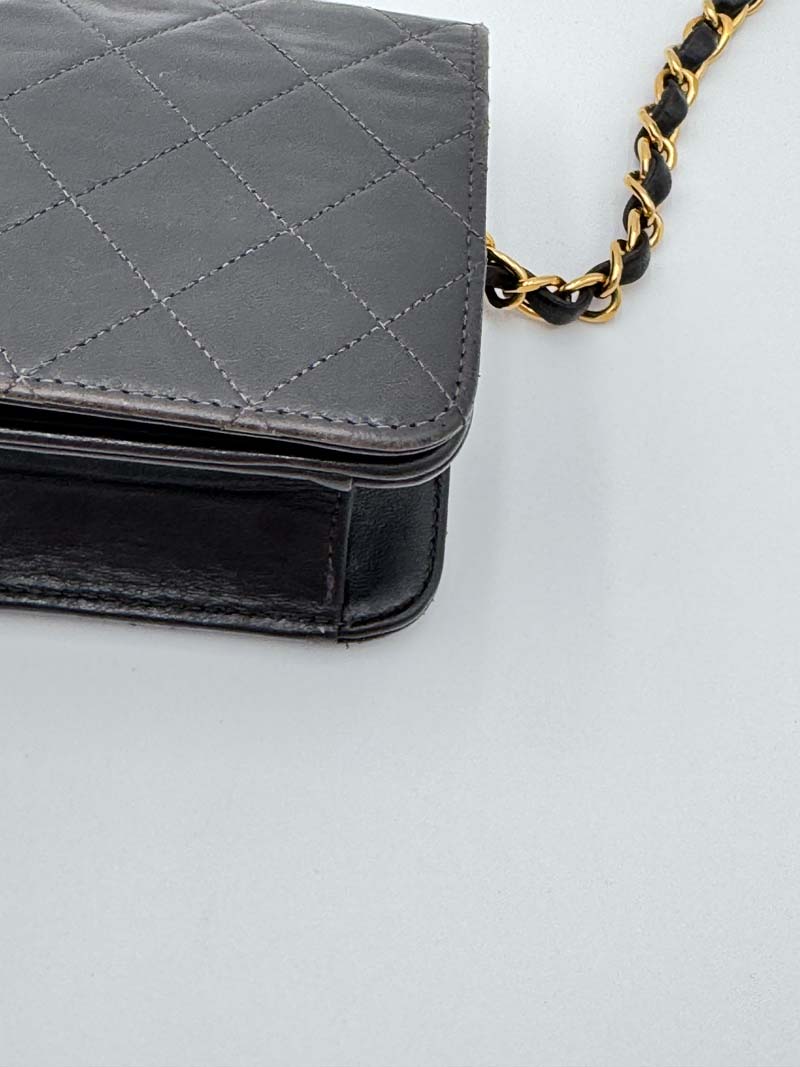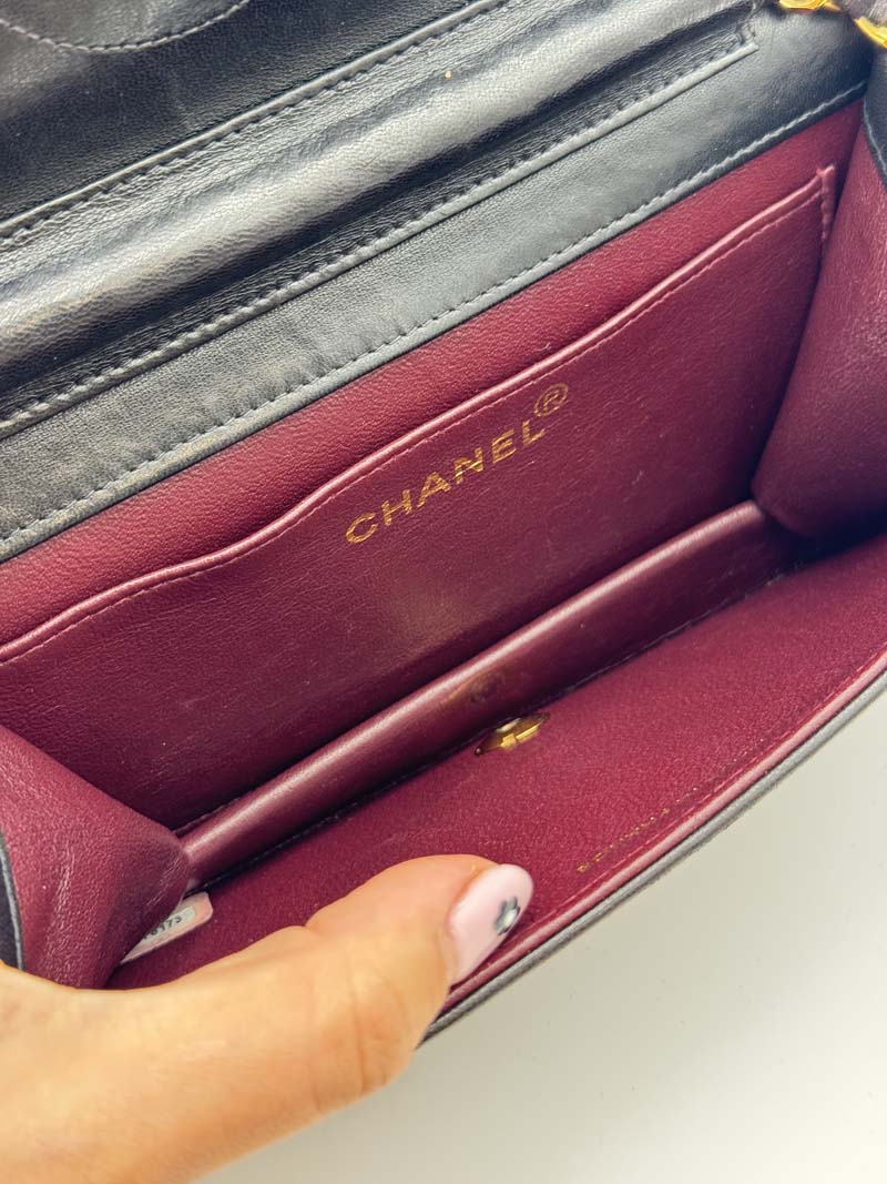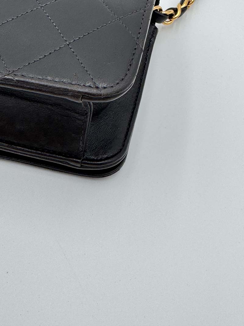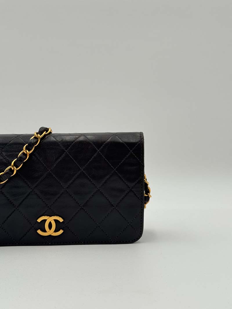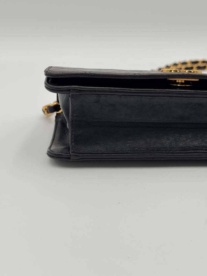 This vintage Chanel Wallet On Chain is a crossbody bag made from black lambskin leather with 24K gold-plated hardware. The item is lightly used with almost no noticeable flaws, with light signs of use such as small scratches on the hardware. The interior is clean and features an extra clean pocket, and the bag has a snap button closure. Dimensions: 19 x 11 x 2 cm. The serial number is 5378173. The sticker is still present and the hardware remains shiny.