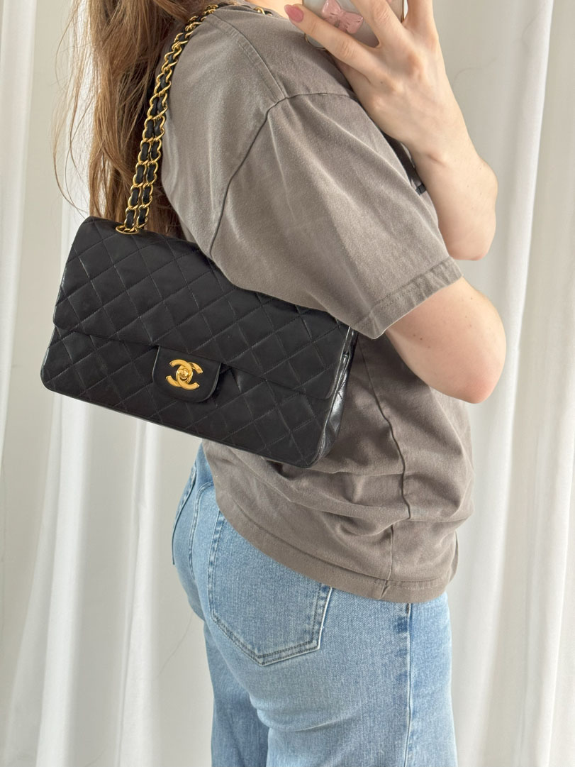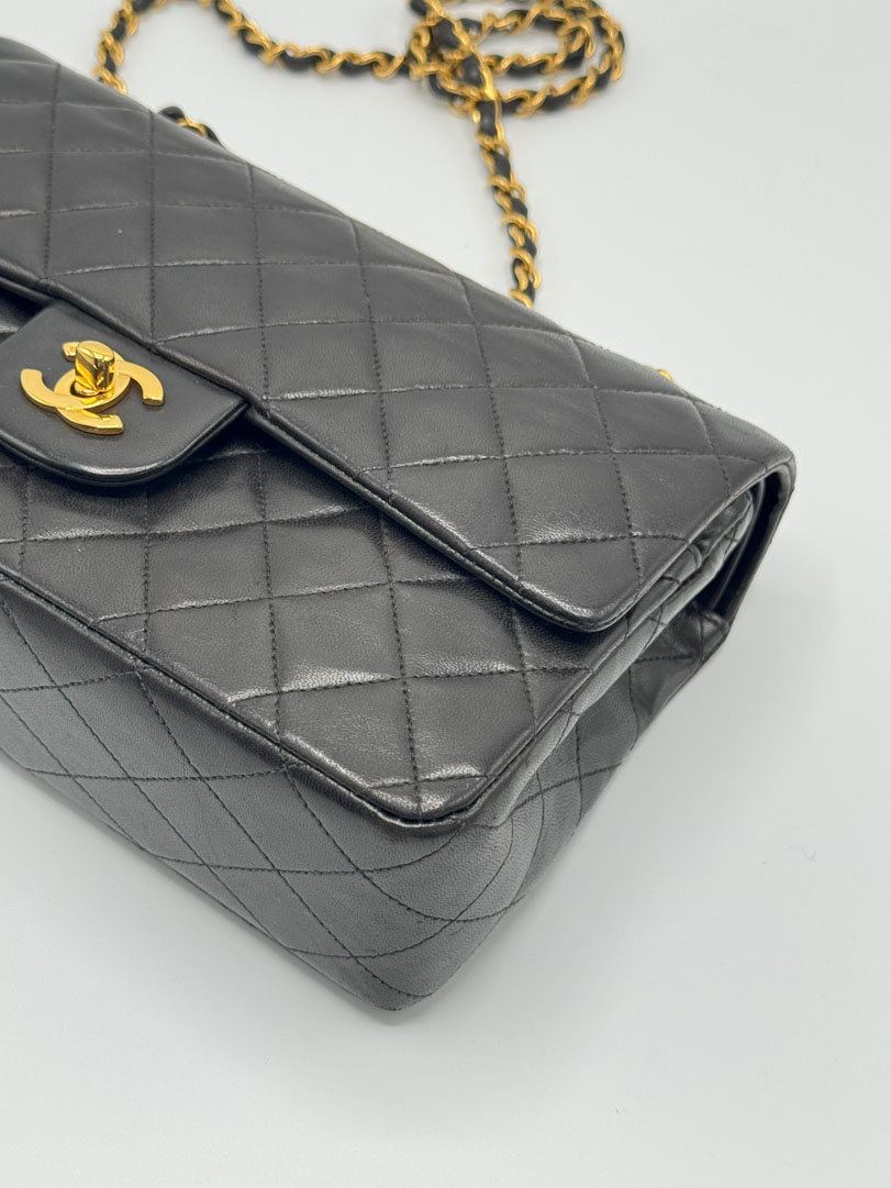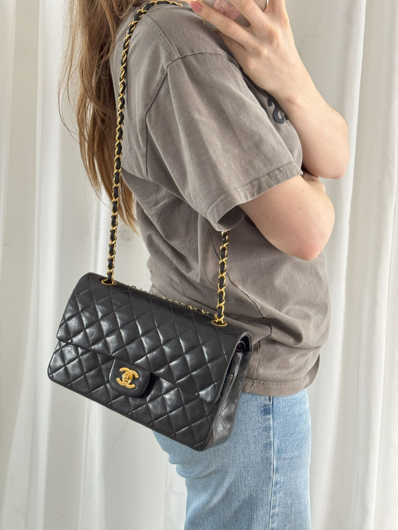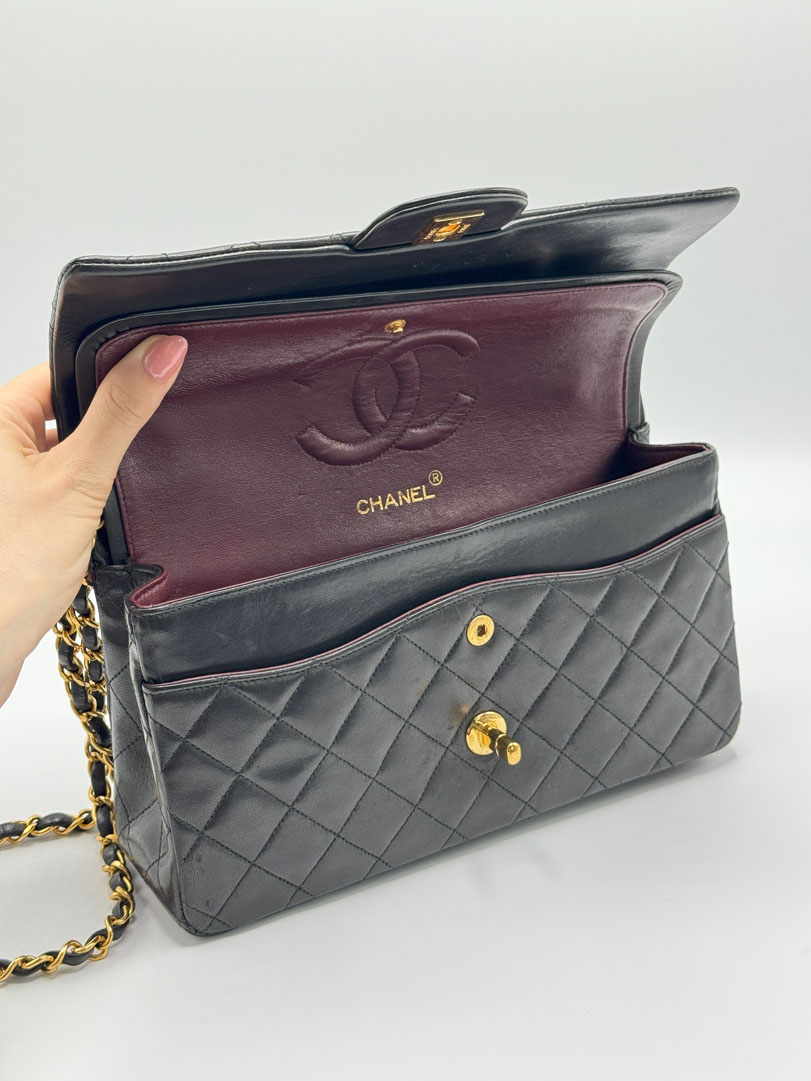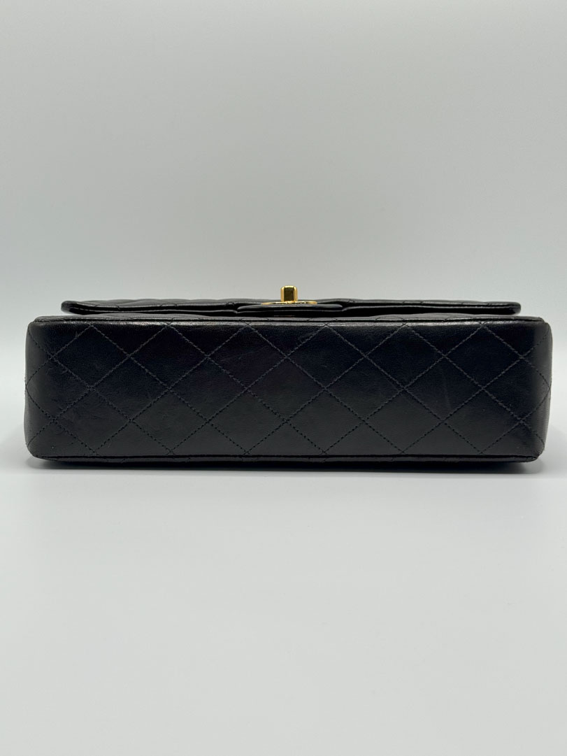 This vintage Chanel Double Flap Bag Medium is a shoulder bag crafted from black lambskin leather with 24k gold-plated hardware. It is somewhere between very good and excellent vintage condition. with buttery and puffy leather that still shows beautiful quilting. The bag displays minimal imperfections and remains in an impressive vintage state. The inside of the bag is completely clean. The chain drop is 41 cm and may allow crossbody wear depending on height. It comes with a dustbag and authenticity card. Series 3. Dimensions: 25.5 x 16 x 6.5 cm.