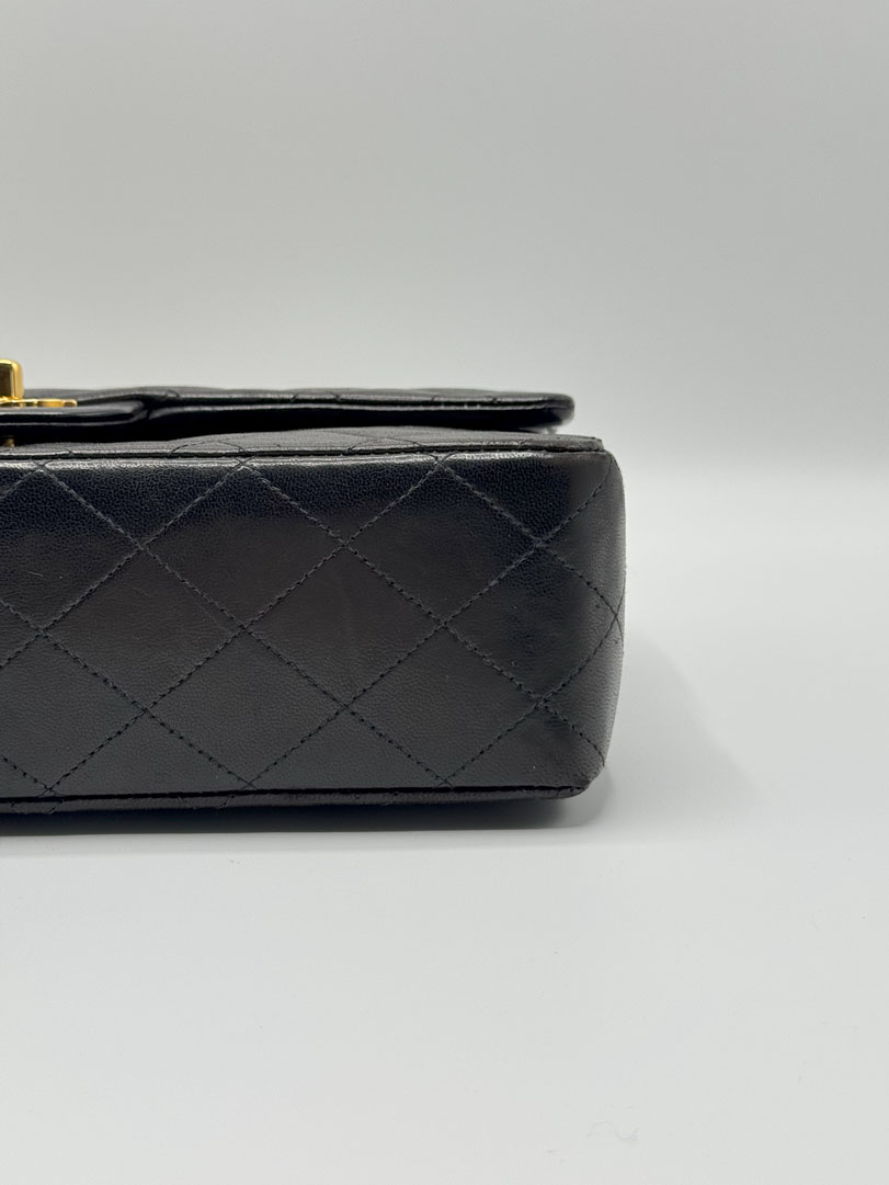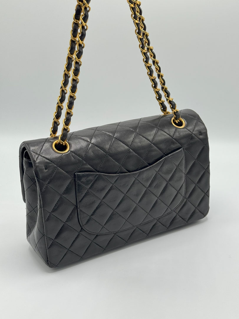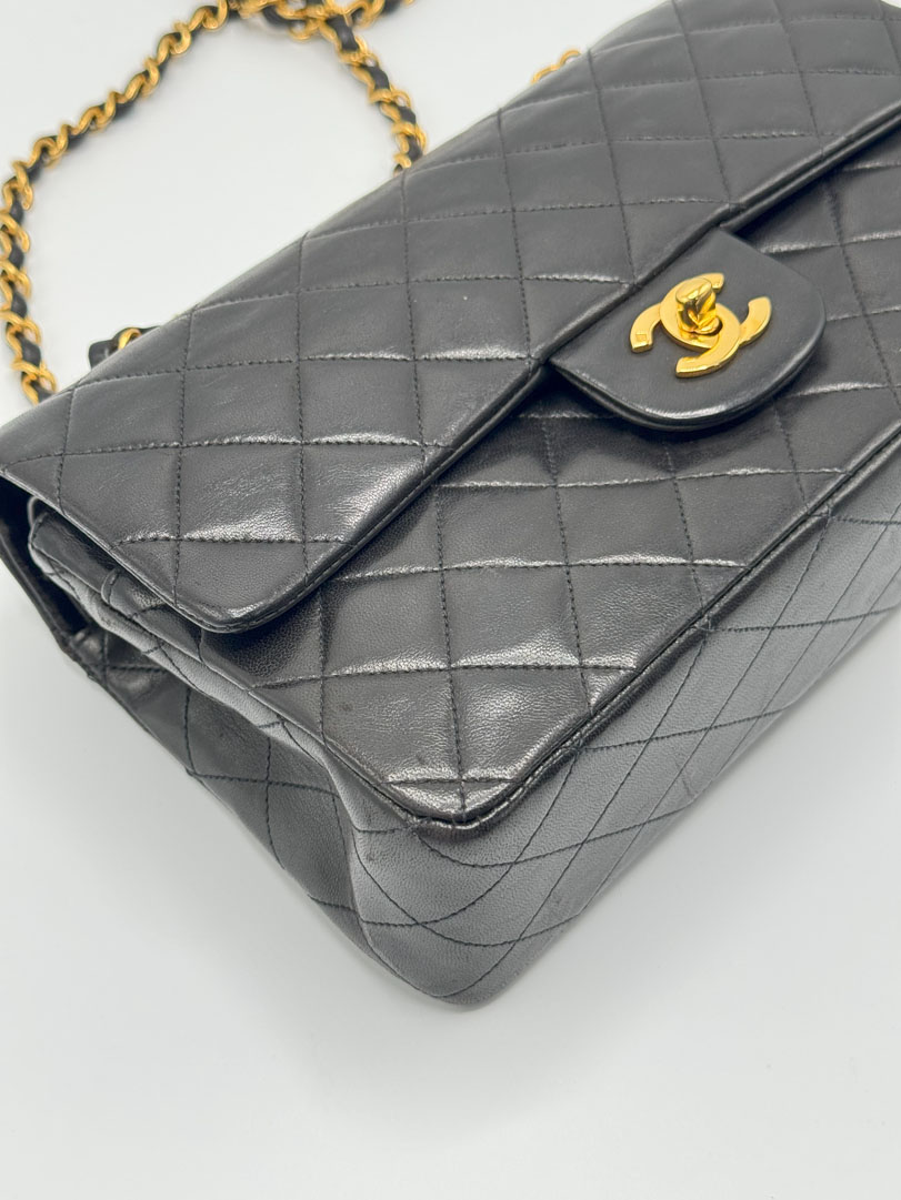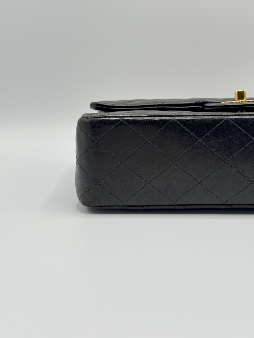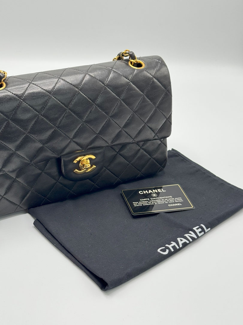 This vintage Chanel Double Flap Bag Medium is a shoulder bag crafted from black lambskin leather with 24k gold-plated hardware. It is somewhere between very good and excellent vintage condition. with buttery and puffy leather that still shows beautiful quilting. The bag displays minimal imperfections and remains in an impressive vintage state. The inside of the bag is completely clean. The chain drop is 41 cm and may allow crossbody wear depending on height. It comes with a dustbag and authenticity card. Series 3. Dimensions: 25.5 x 16 x 6.5 cm.