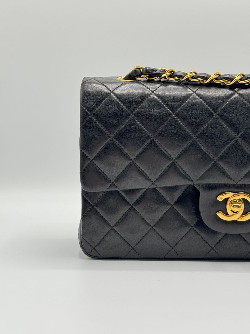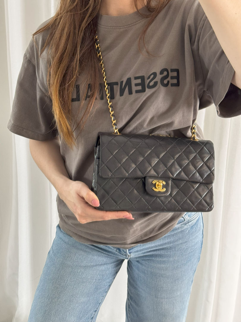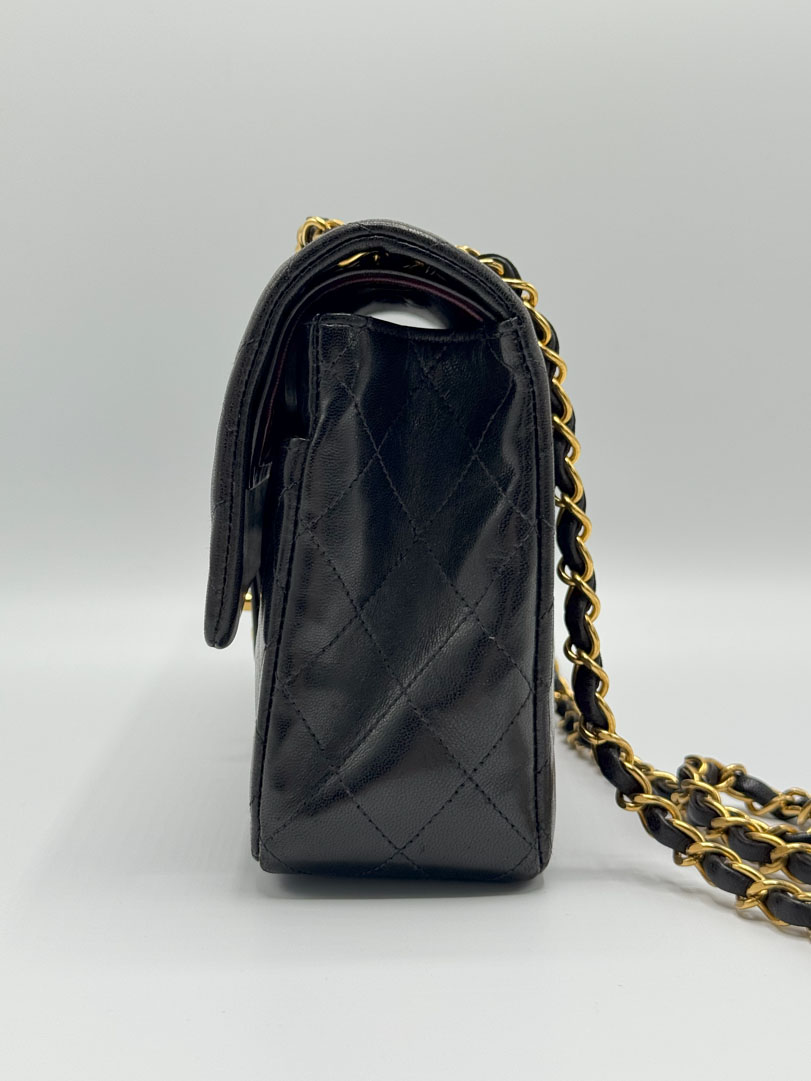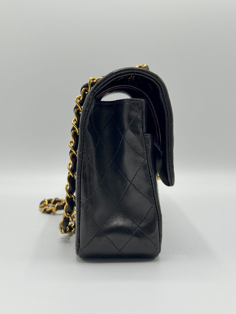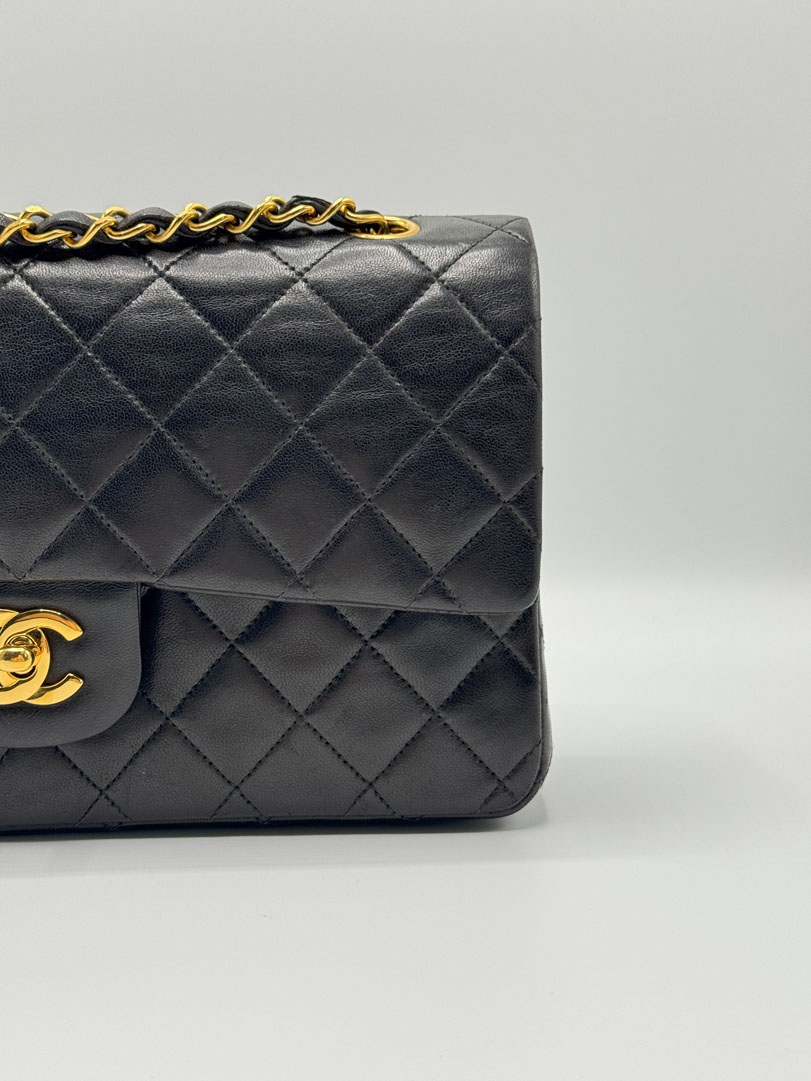 This vintage Chanel Double Flap Bag Medium is a shoulder bag crafted from black lambskin leather with 24k gold-plated hardware. It is somewhere between very good and excellent vintage condition. with buttery and puffy leather that still shows beautiful quilting. The bag displays minimal imperfections and remains in an impressive vintage state. The inside of the bag is completely clean. The chain drop is 41 cm and may allow crossbody wear depending on height. It comes with a dustbag and authenticity card. Series 3. Dimensions: 25.5 x 16 x 6.5 cm.
