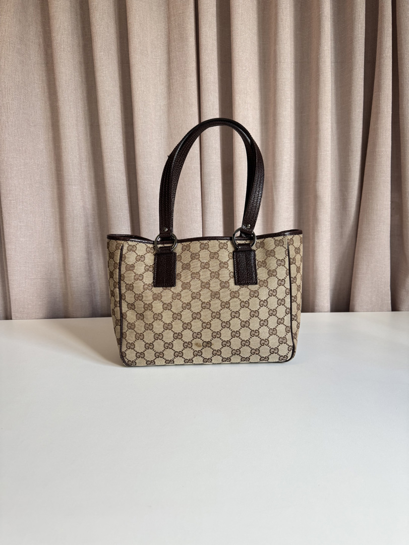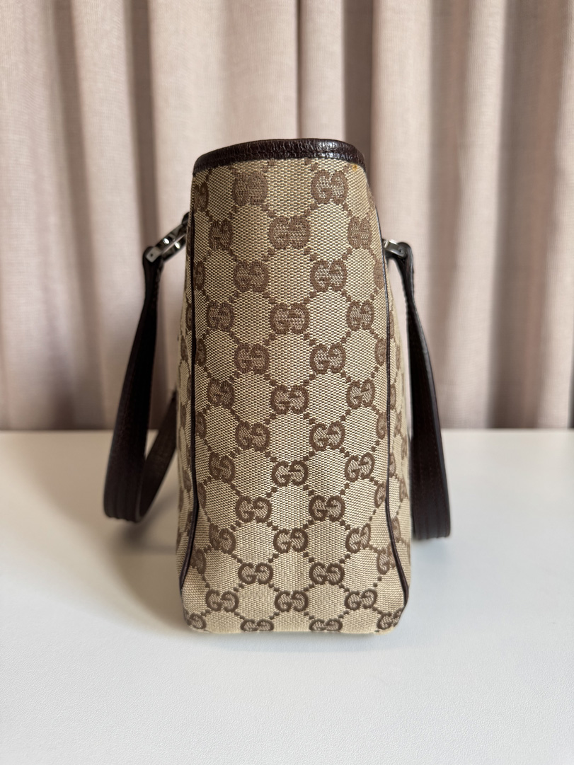 This vintage Gucci Canvas Shoulder Tote is a stylish shoulder bag crafted from brown GG canvas with dark brown leather and silver-tone hardware. It is in very good condition, with only a few small marks on the canvas but otherwise in fantastic shape. The corners are still smooth, and the interior is clean with an additional zippered pocket. This is an open-top bag without a zipper, making it an easy and practical choice for daily use. The serial number is 118019203998. Dimensions: 28 x 21 x 10 cm.