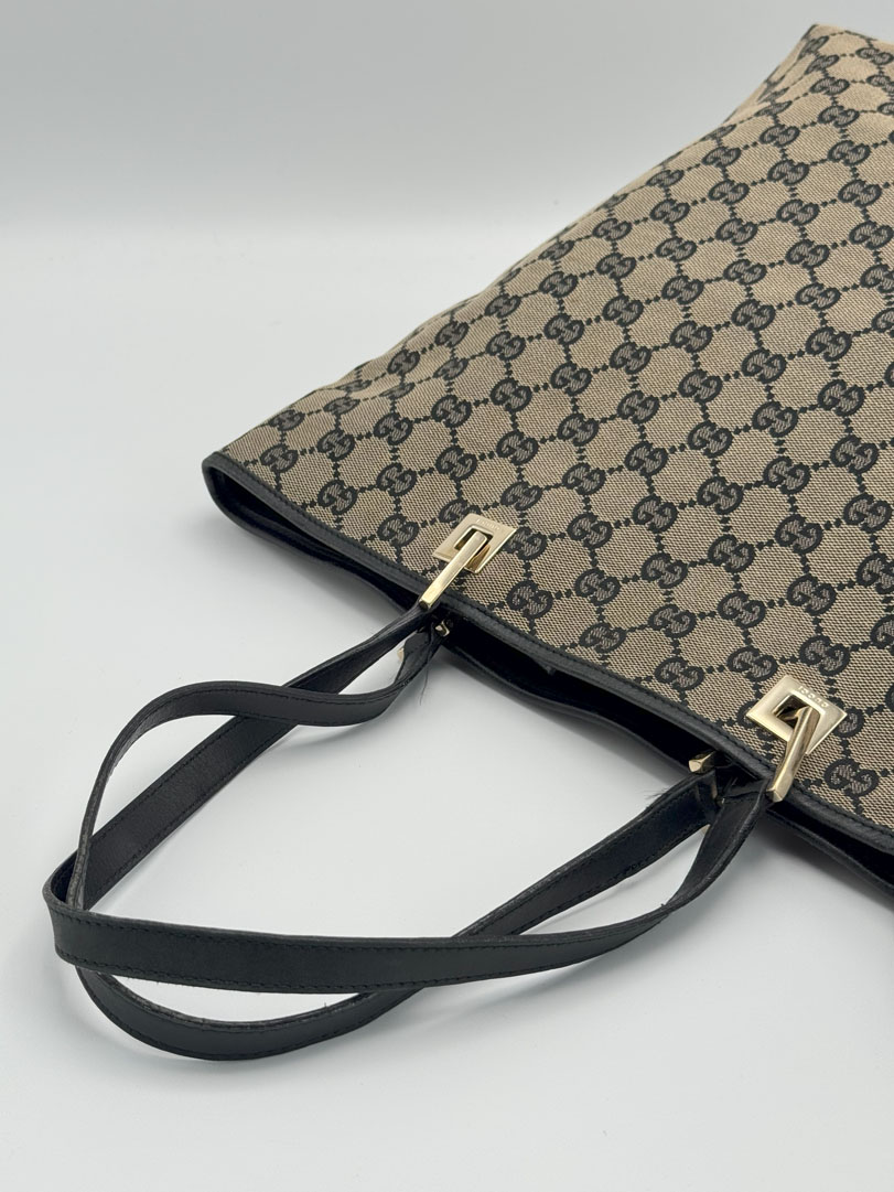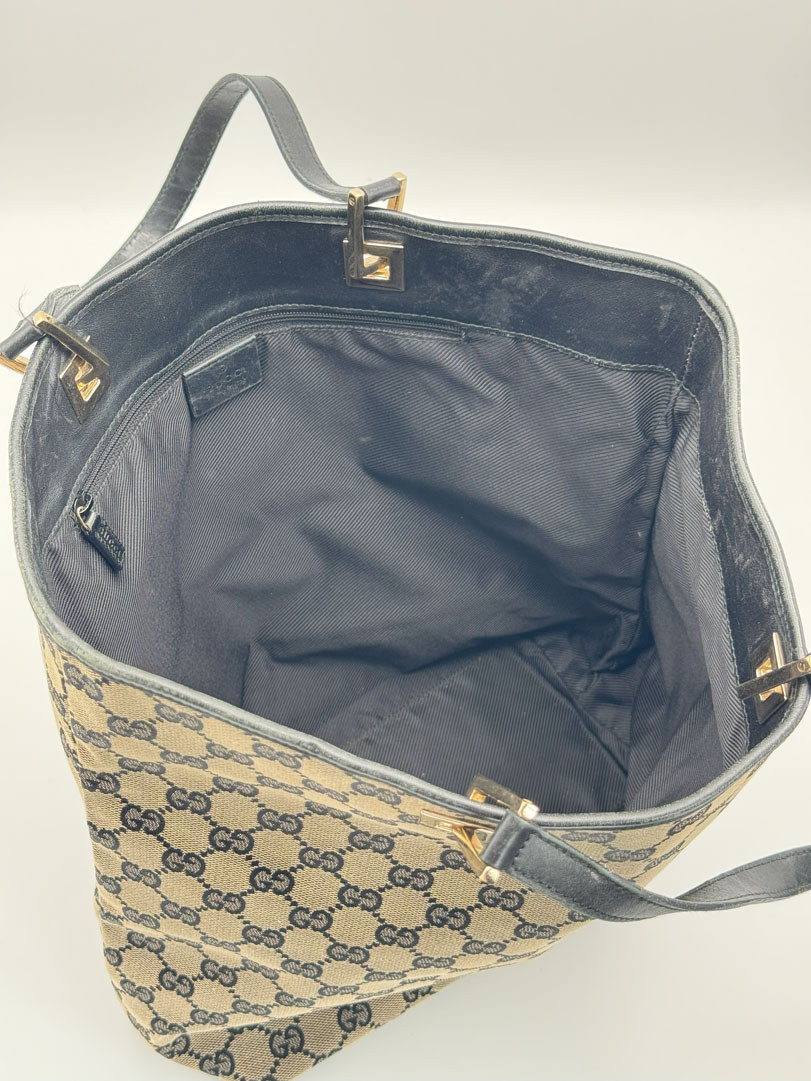 This vintage Gucci Canvas Tote is made from GG canvas with black leather and champagne-tone hardware. It’s in very good condition, with minimal signs of use and some light wear on the leather. The interior is clean and includes a zipped pocket. Serial number: 210983444. Dimensions: 24 x 31 x 11 cm.