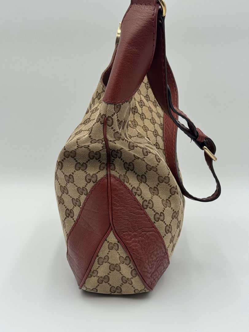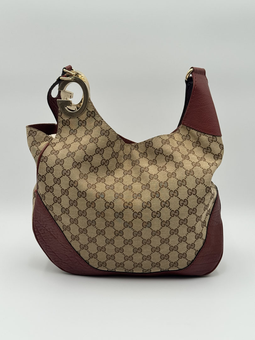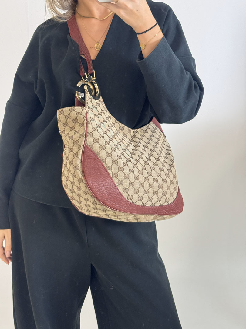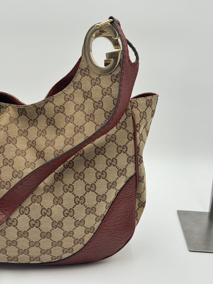 This vintage Gucci Charlotte Hobo Bag is a shoulder bag crafted from brown GG canvas with dark red leather details and silver-tone hardware. It is in very good condition, showing only minimal imperfections such as very fine scratches on the hardware. The interior is clean and features an extra pocket. This is a spacious bag and can also be worn as a high crossbody. It comes with a dustbag. The serial number is 203503000926. Dimensions are 30 x 20 x 6 cm.