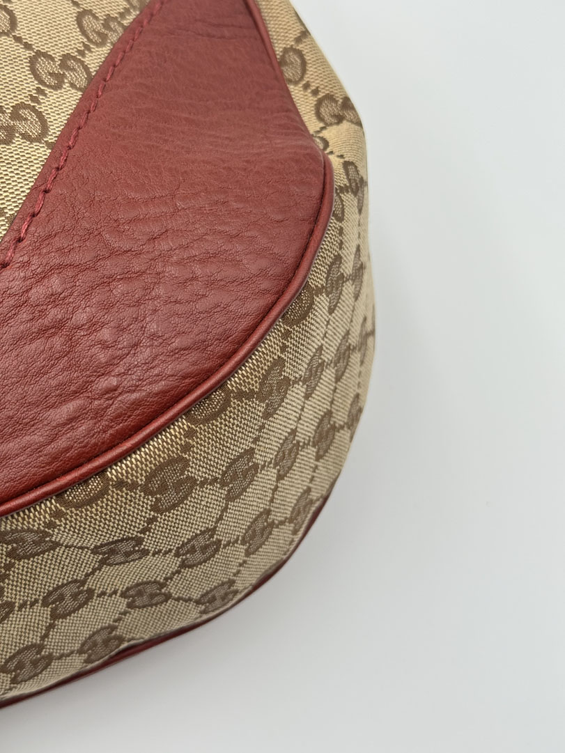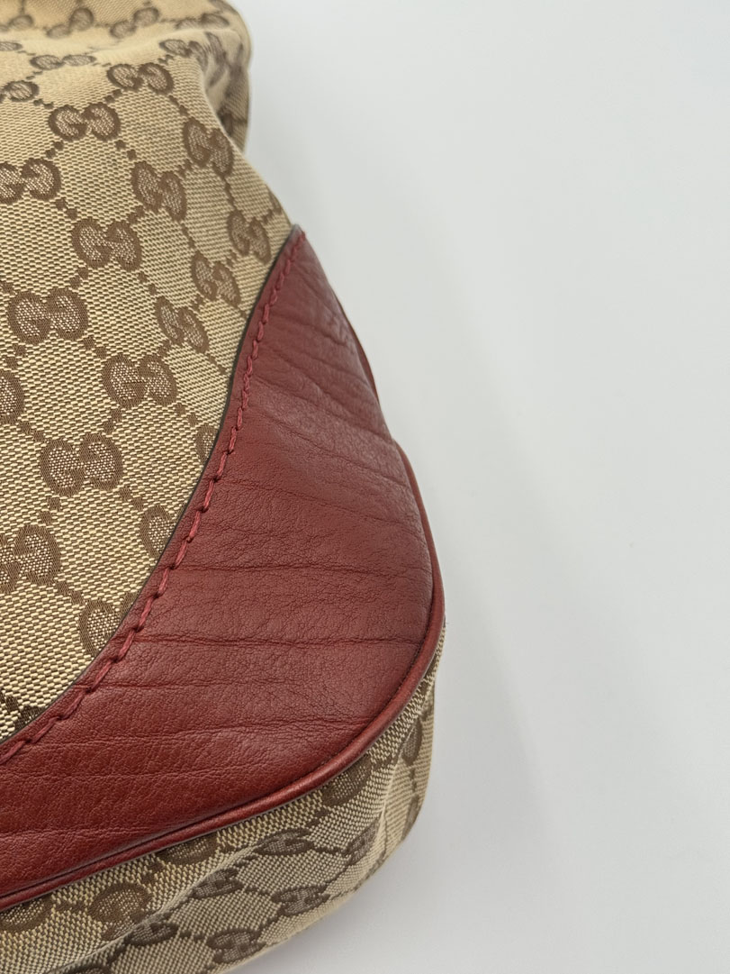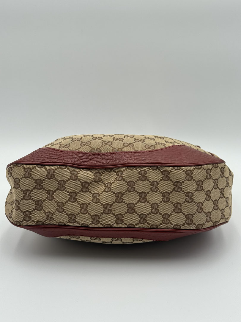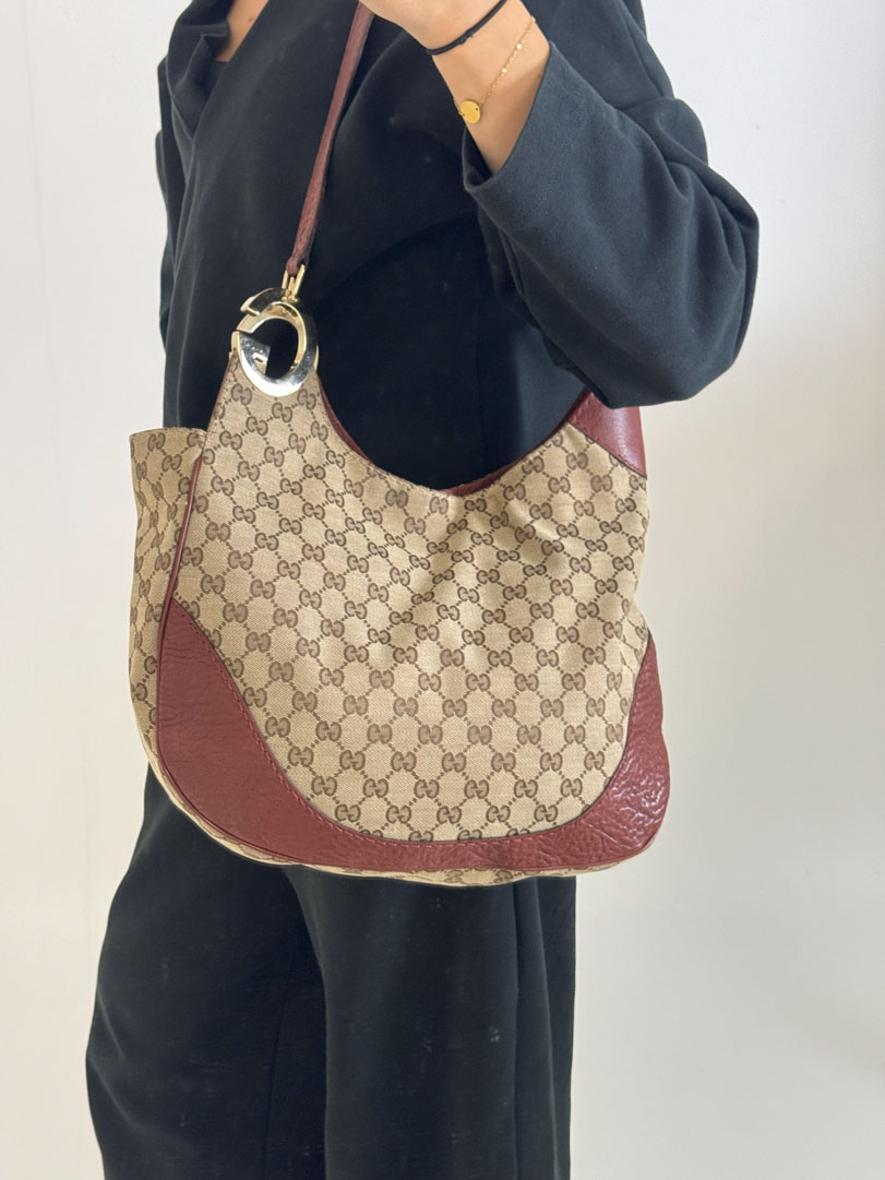 This vintage Gucci Charlotte Hobo Bag is a shoulder bag crafted from brown GG canvas with dark red leather details and silver-tone hardware. It is in very good condition, showing only minimal imperfections such as very fine scratches on the hardware. The interior is clean and features an extra pocket. This is a spacious bag and can also be worn as a high crossbody. It comes with a dustbag. The serial number is 203503000926. Dimensions are 30 x 20 x 6 cm.