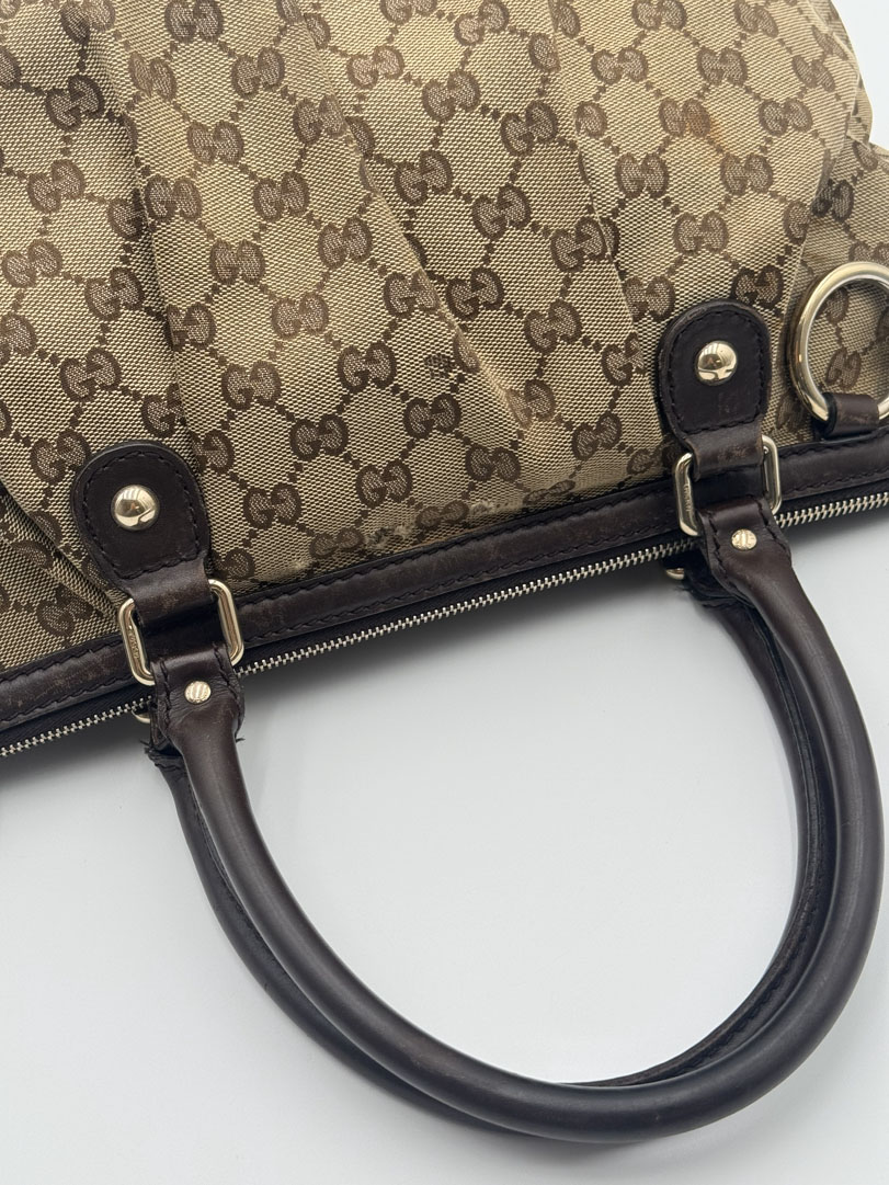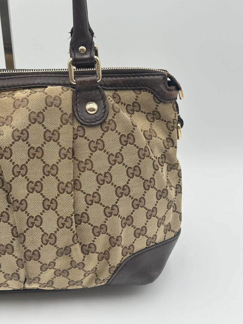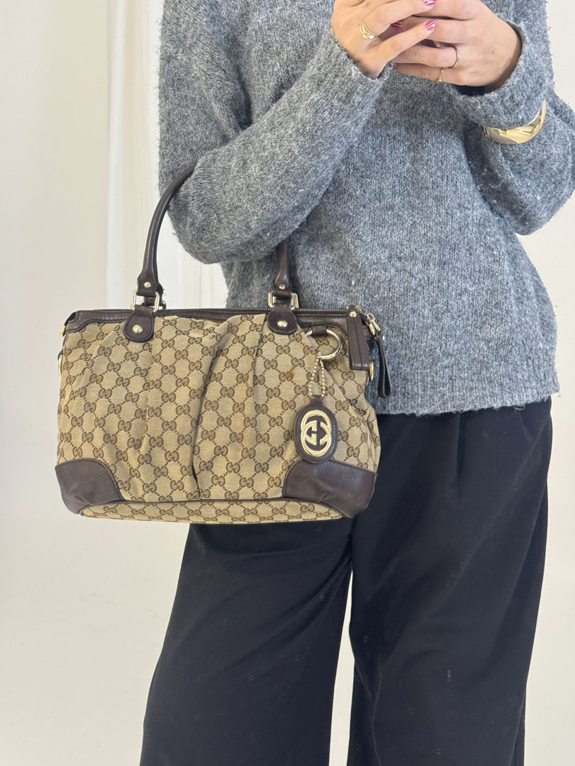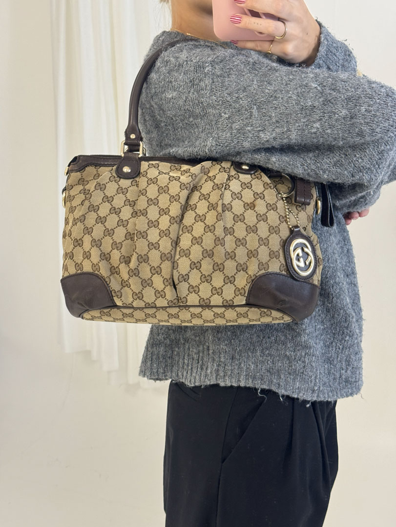 This vintage Gucci GG Canvas Sukey Bag is a shoulder bag made from brown GG canvas with champagne-tone hardware. The item is in very good condition, showing some user signs such as wear on the corners and signs of use on the top and bottom of the bag. The interior is clean and features an extra pocket. Dimensions are 34 x 22 x 12 cm. The serial number is 247902 001998. The bag has rings on the sides that allow a strap to be attached for crossbody wear.
