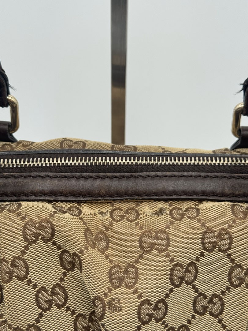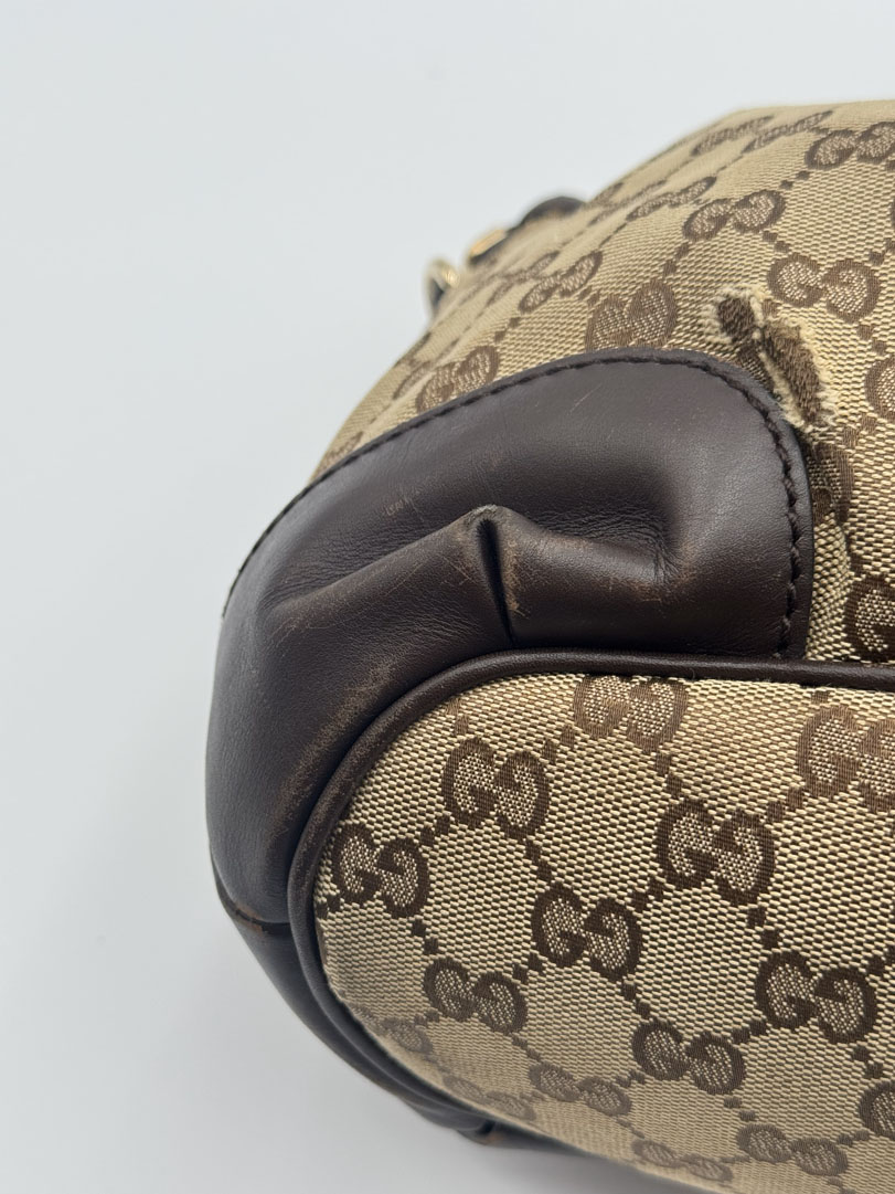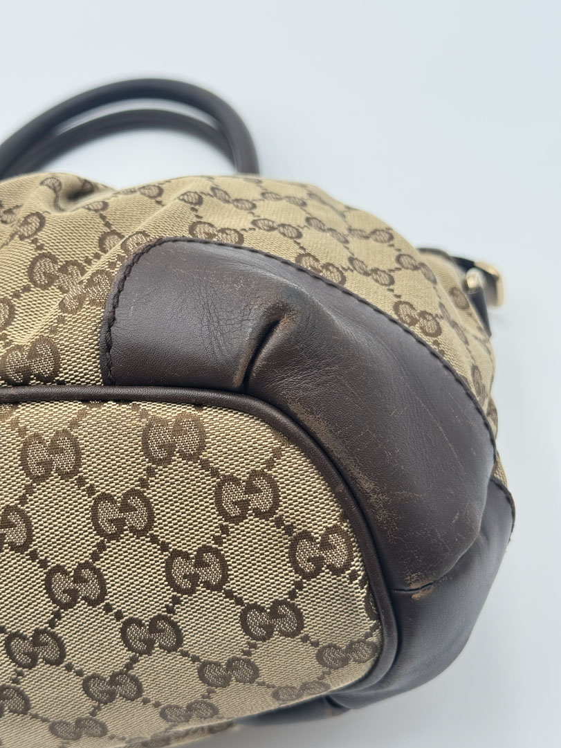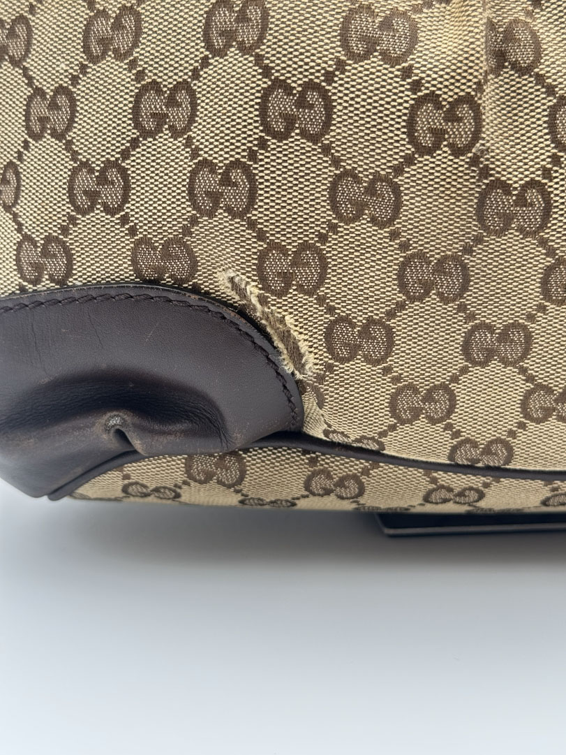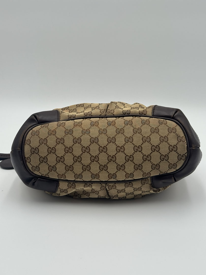 This vintage Gucci GG Canvas Sukey Bag is a shoulder bag made from brown GG canvas with champagne-tone hardware. The item is in very good condition, showing some user signs such as wear on the corners and signs of use on the top and bottom of the bag. The interior is clean and features an extra pocket. Dimensions are 34 x 22 x 12 cm. The serial number is 247902 001998. The bag has rings on the sides that allow a strap to be attached for crossbody wear.
