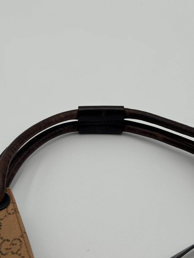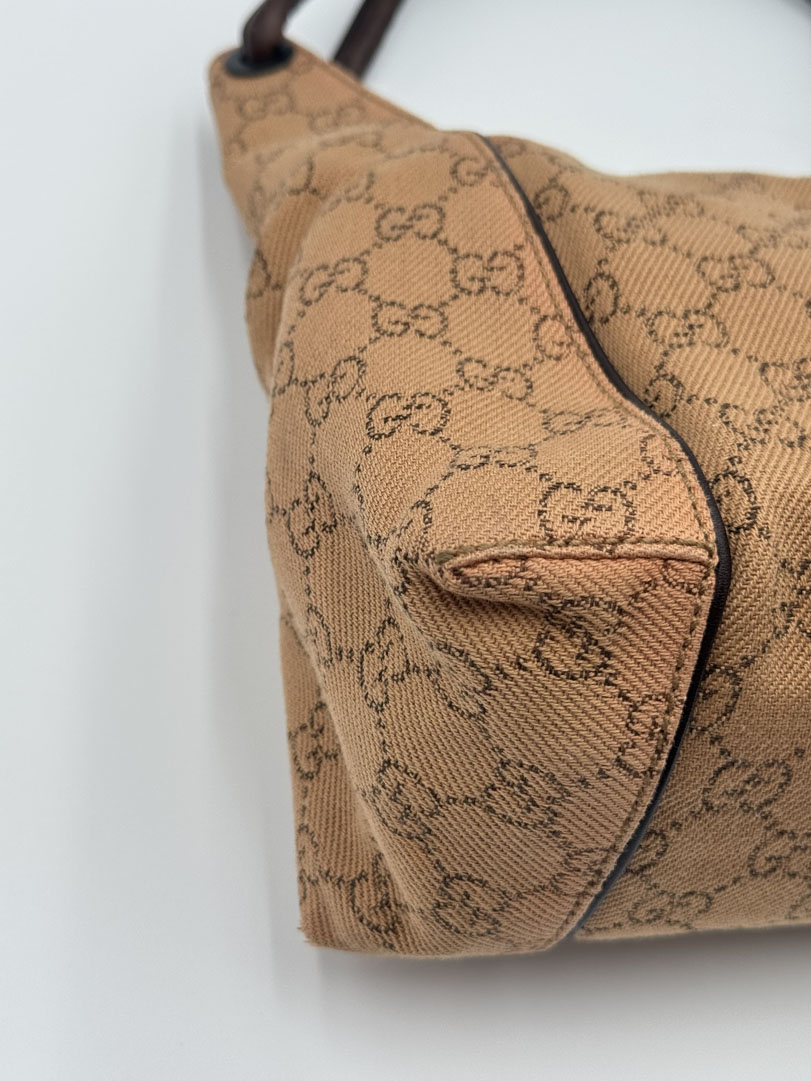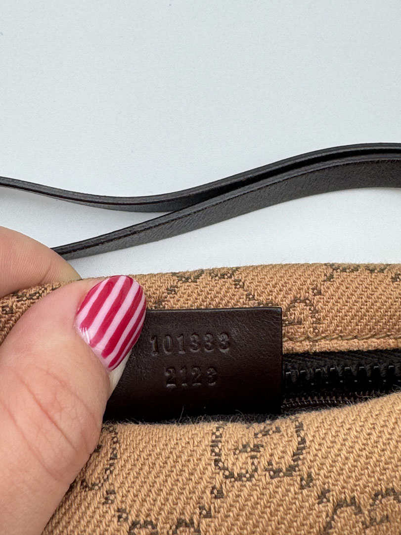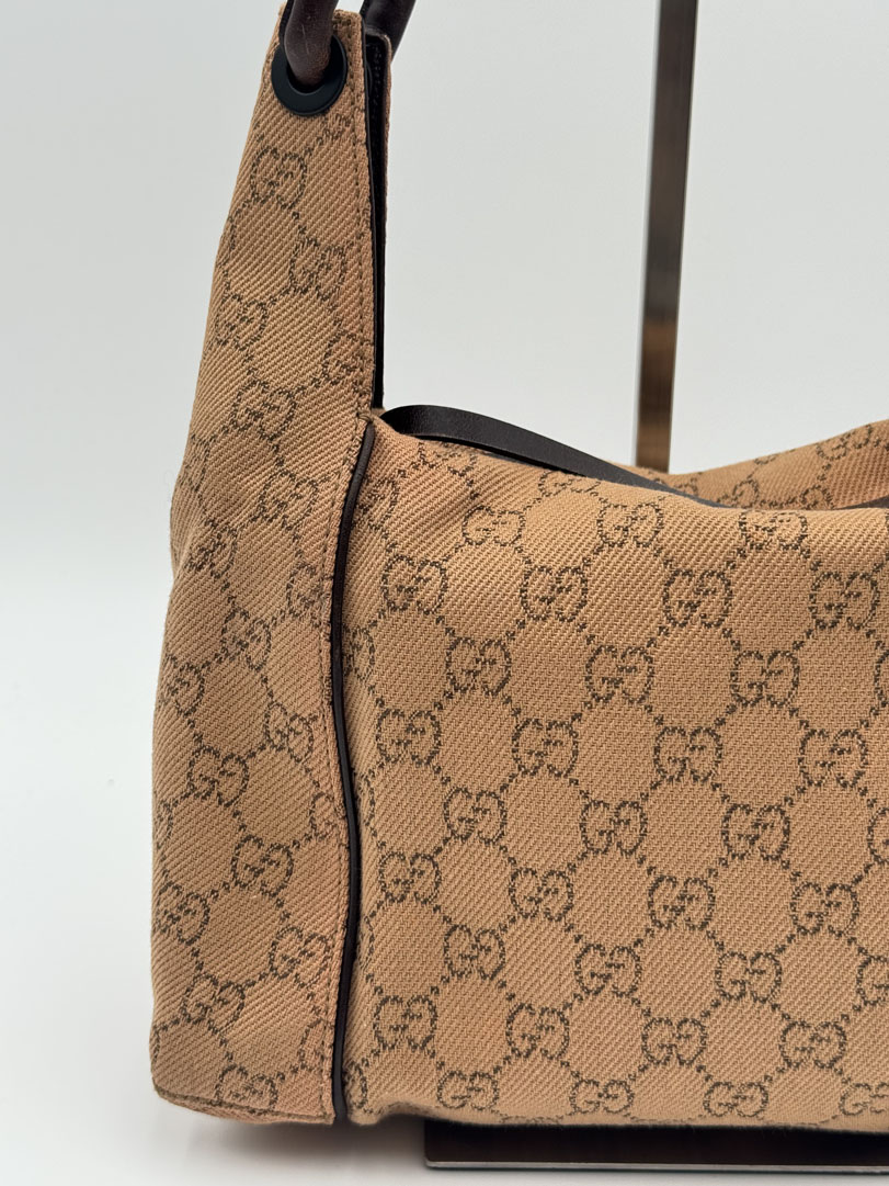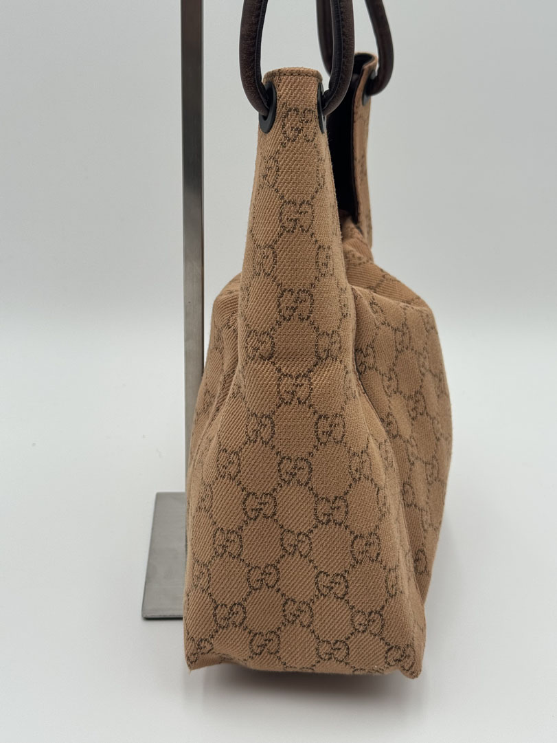 This vintage Gucci GG Canvas Hand Bag is a handbag made from brown GG canvas. The item is in very good condition, showing some user signs such as slight discoloration of the canvas and signs of use on the vachetta leather. The interior is clean and features an extra pocket. Dimensions are 25 x 17 x 7 cm. The serial number is 101333 2123.