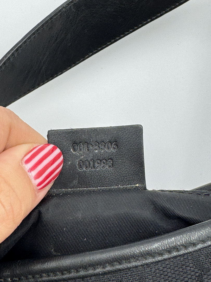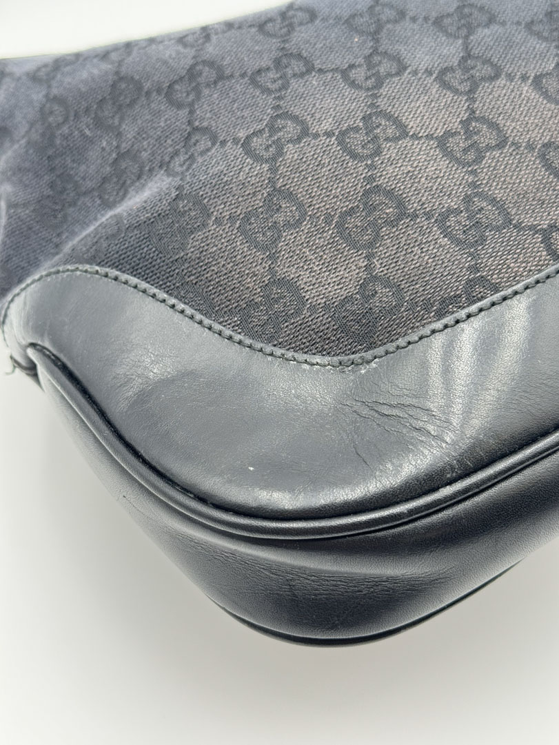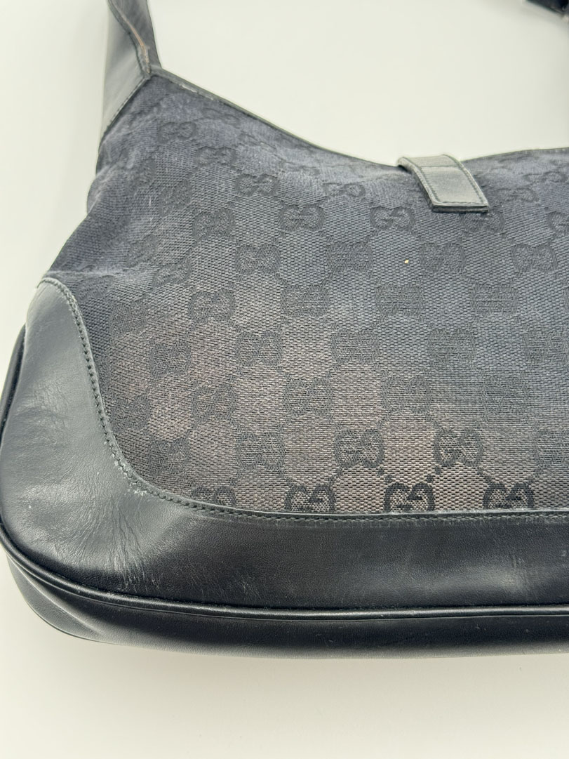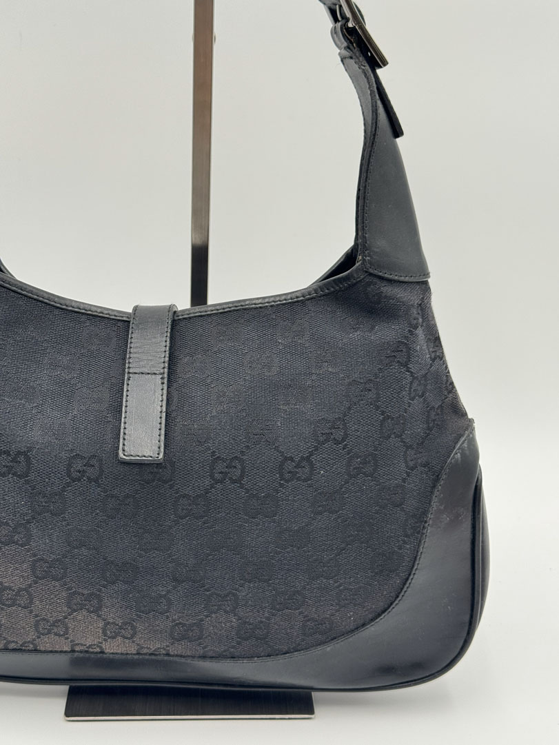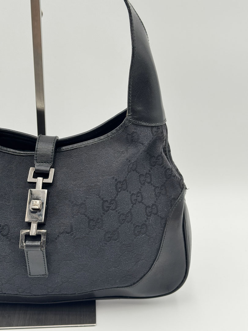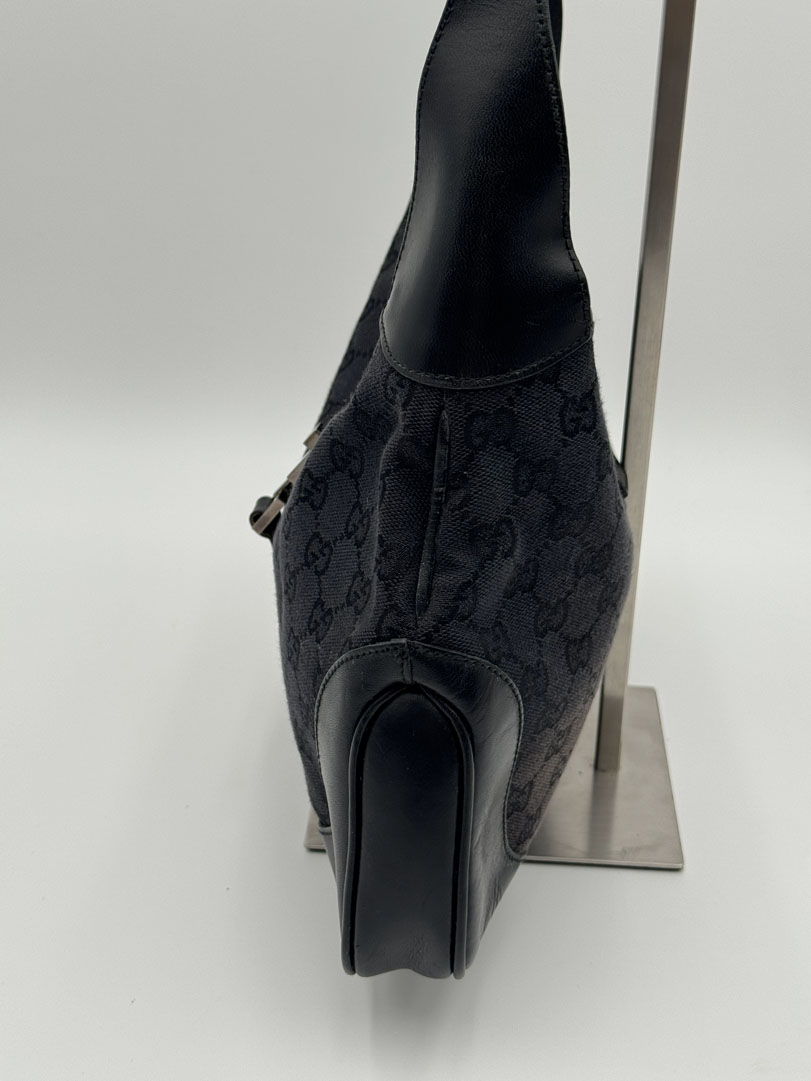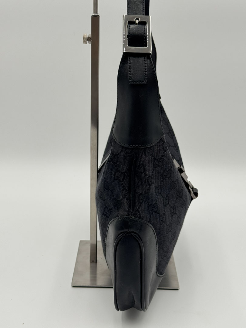 This vintage Gucci GG Canvas Jackie Shoulder Bag Black is a shoulder bag made from black GG canvas with silver-tone hardware. The item is in very good condition, showing some user signs such as small stains and discoloration, with visible discoloration on the back of the bag. The interior is clean. Dimensions are 31 x 21 x 3 cm. The serial number is 0013306 001998.