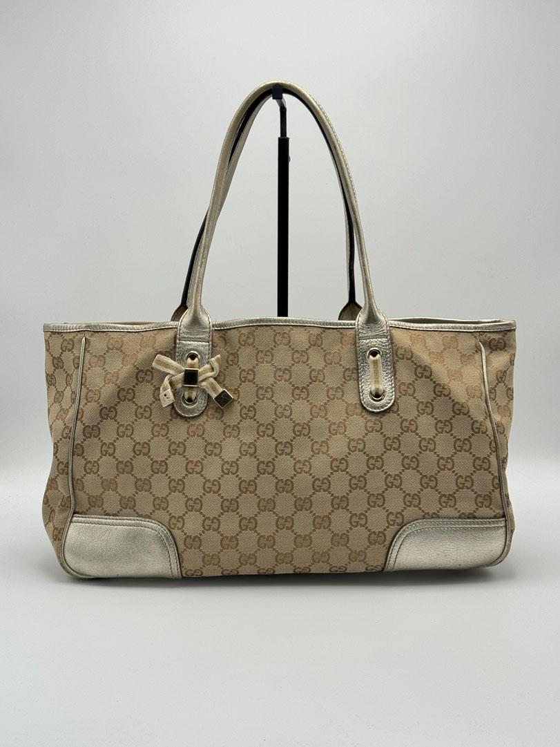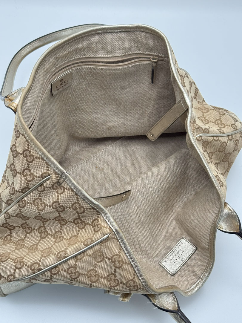 This vintage Gucci GG Canvas Shimmer Bag is crafted from GG canvas with shiny leather and champagne-tone hardware. It’s in very good condition with barely any signs of wear. The interior is clean. Serial number: 1638052123. Dimensions: 36 x 20 x 10 cm.