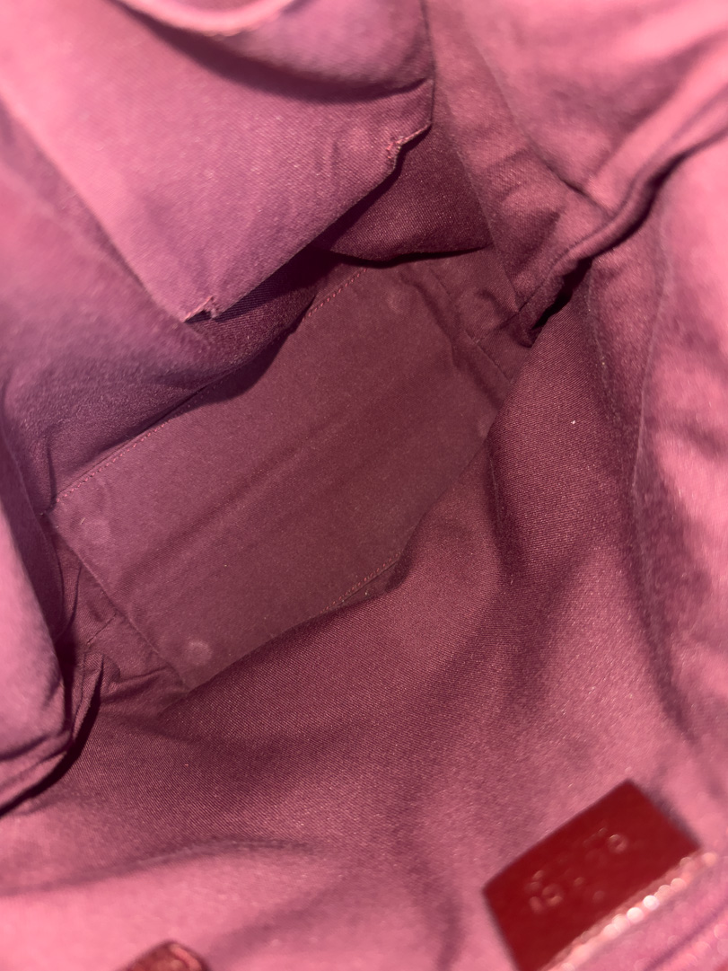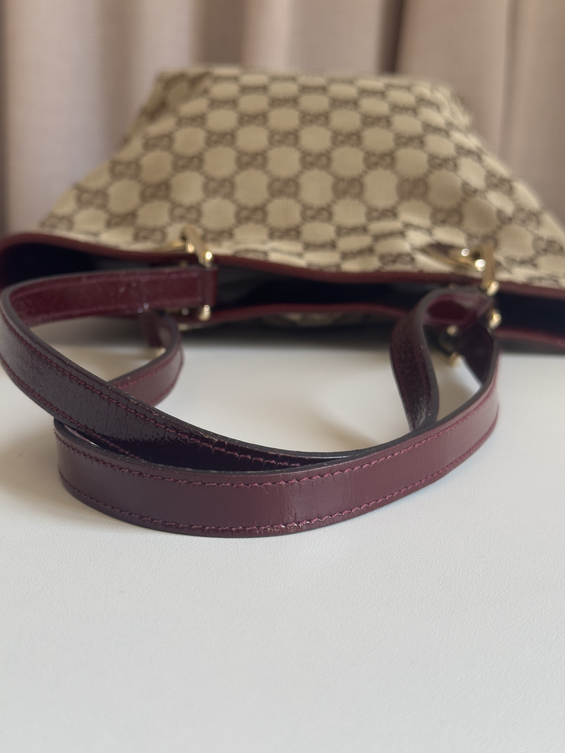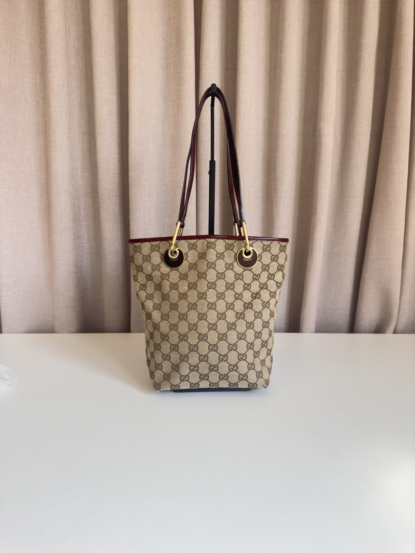 This vintage Gucci GG Canvas Small Tote is a stylish shoulder bag made from brown GG canvas with glossy dark red leather and gold-tone hardware. In very good condition, it shows some wear on the corners and minor imperfections in the canvas. The interior is clean, and the bag remains a beautiful and practical everyday piece. The serial number is 120840002404. Dimensions: 17 x 25 x 9 cm.