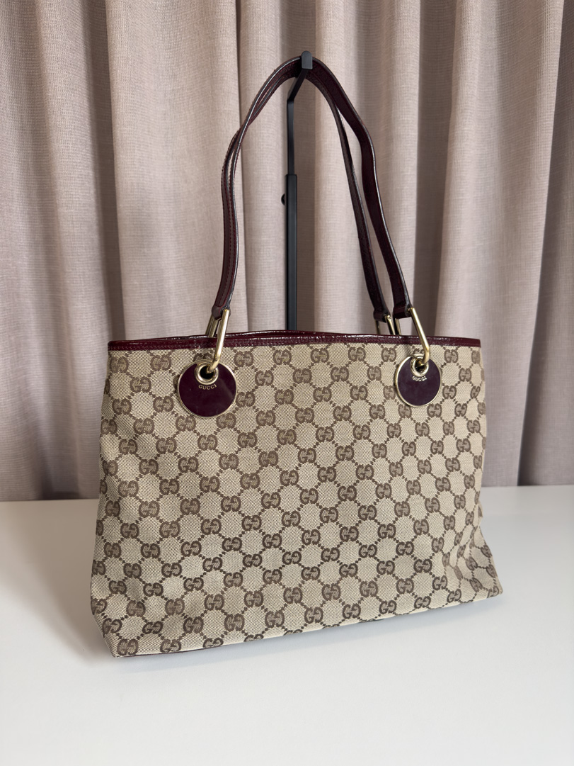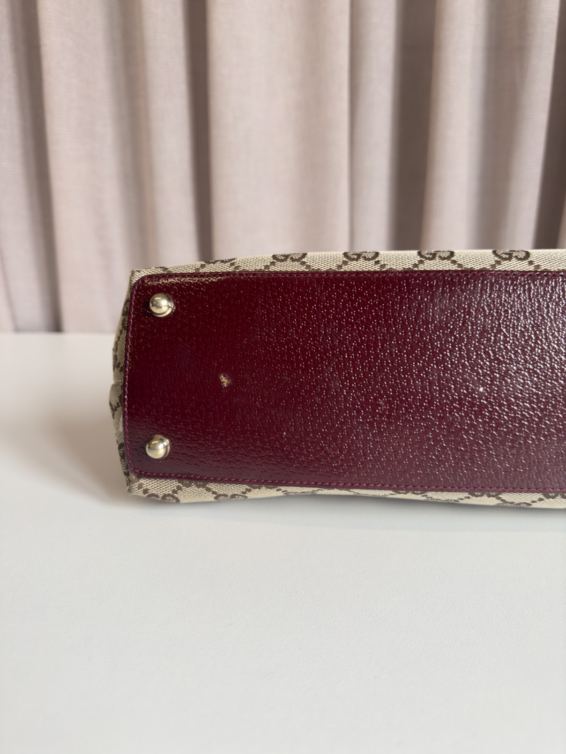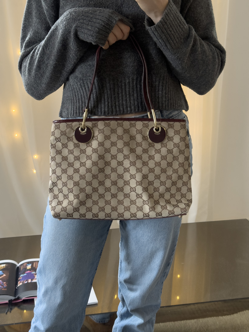 This pre-loved Gucci GG Canvas Tote in brown GG canvas is a stunning vintage piece, featuring glossy red handles for a bold contrast. The interior is lined in red and remains completely clean. The bag is in very good condition, showing some signs of use such as minor scratches on the hardware and a few marks on the bottom. Spacious and practical, this shoulder bag offers plenty of room for your essentials. The dimensions are 32 x 24 x 9 cm.