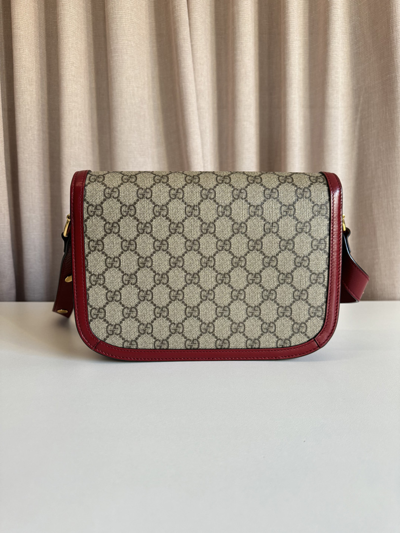 This preloved Gucci Horsebit Bag is in excellent condition. Made from supreme canvas with a beautiful deep red leather finish. The bag is lightly used with almost no visible signs of wear. You can wear it long or short crossbody thanks to the adjustable strap. Dimensions: 25 x 20 x 6 cm.