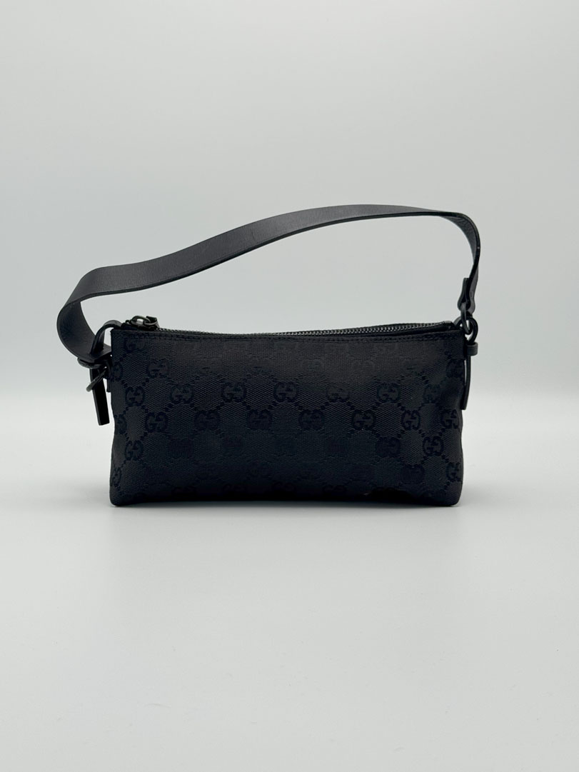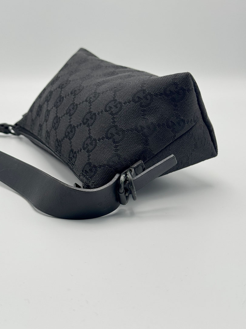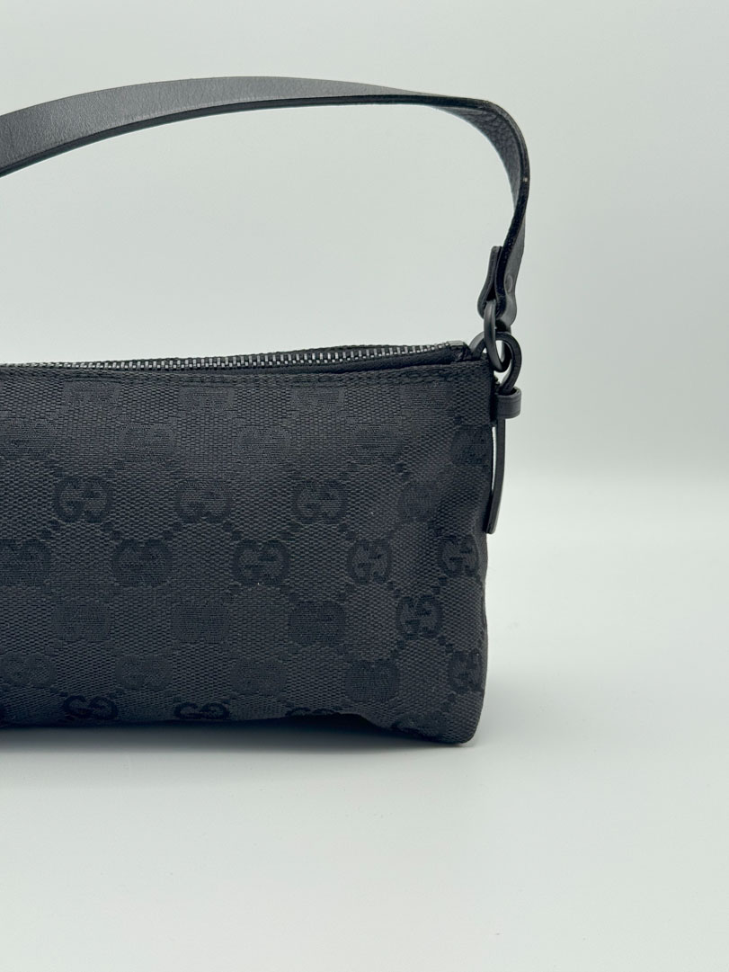 This pre-loved Gucci Mini Pochette is a chic vintage handbag, crafted from black GG canvas with black leather details and black-tone hardware. It is a small yet stylish piece, designed primarily as a handbag rather than a shoulder bag. It is in very good condition, with only light imperfections. The zipper functions smoothly, and the interior is clean. A timeless and elegant accessory. The serial number is 103399002058, and the dimensions are 20 x 12 x 6 cm.