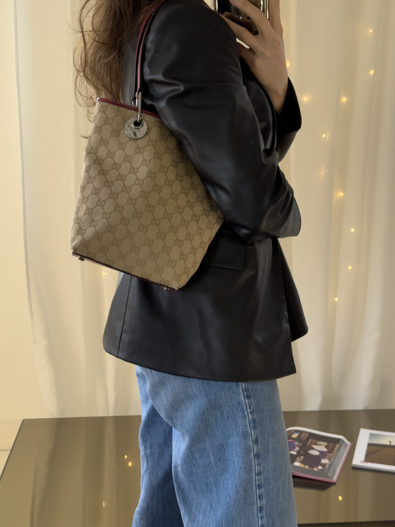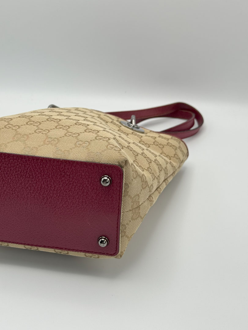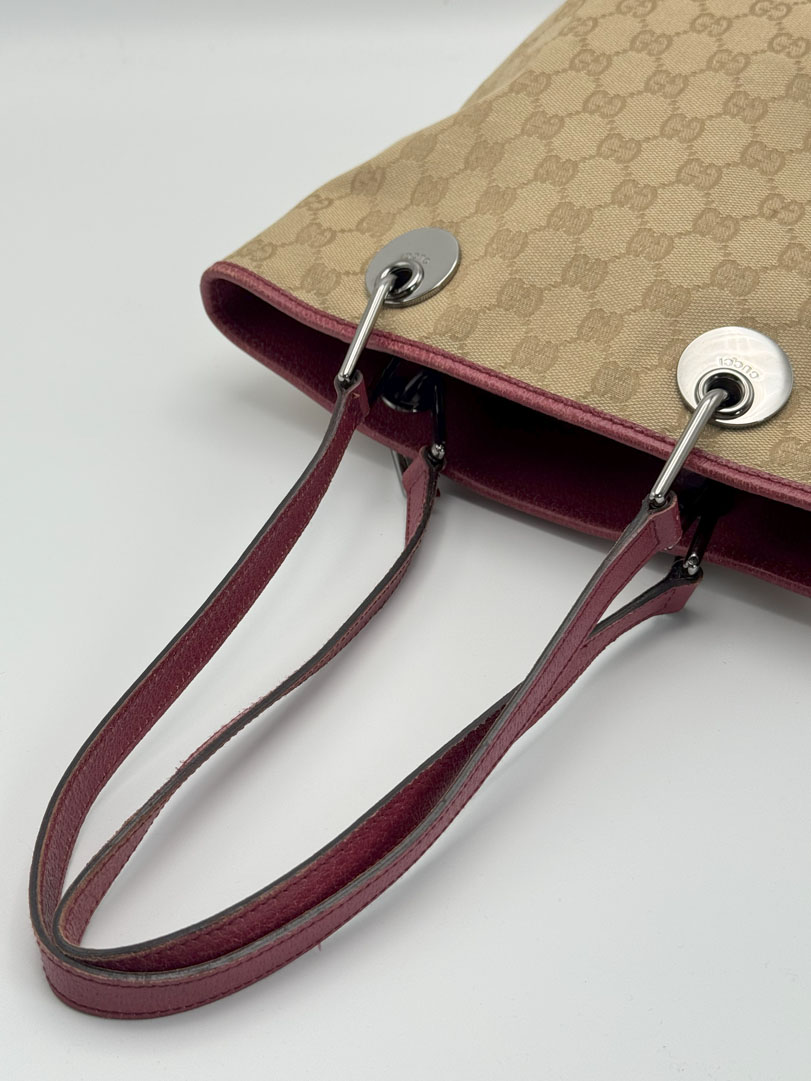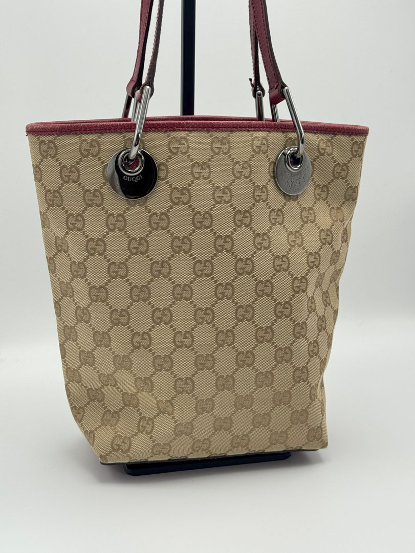 This pre-loved Gucci Mini Tote is a vintage handbag crafted from light brown GG canvas with dark pink leather trim and silver-tone hardware. It is in very good condition, with some wear and minor imperfections on the leather, while the interior remains perfectly clean. A stylish and compact accessory. The serial number is 1208403444. Dimensions: 17 x 25 x 9 cm.