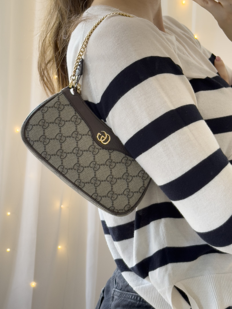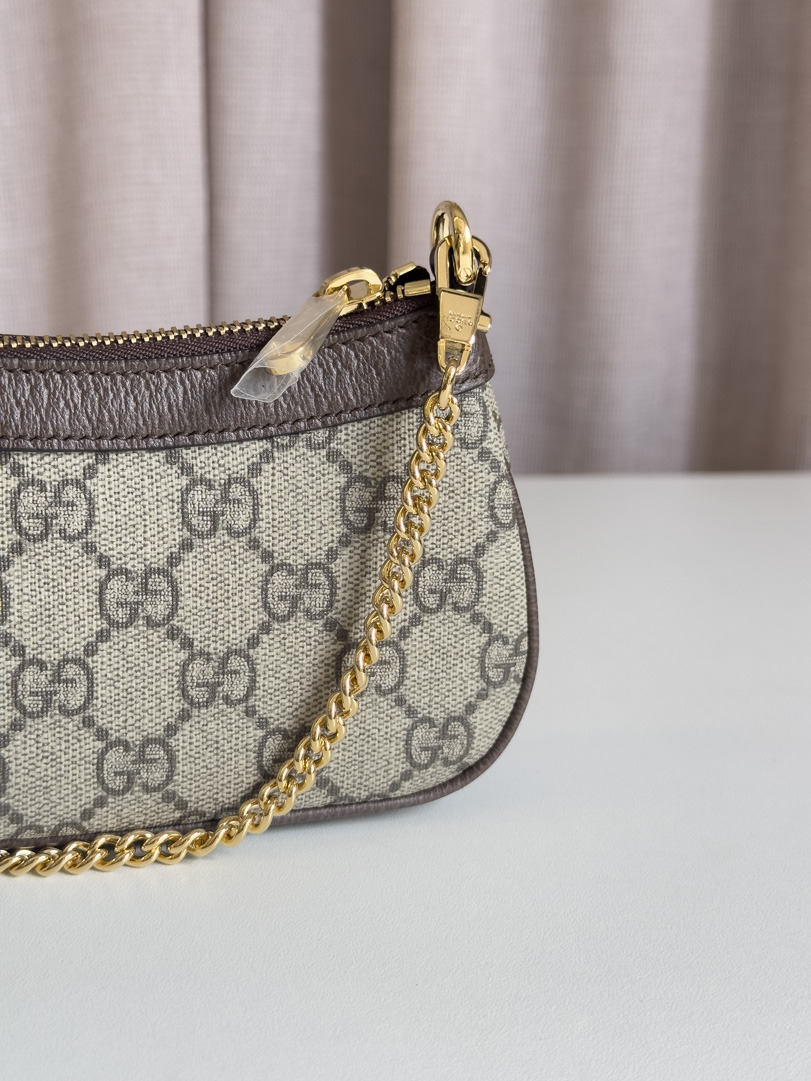 This pre-loved Gucci Ophidia Mini is an adorable mini bag in like-new condition, completely unused. Crafted from GG canvas with leather details, it’s the perfect size for a phone, keys, a cardholder, and a lipstick. A long strap can be attached for crossbody wear, making it both cute and versatile. Comes with a dustbag and box. The serial number is 7649602067. Dimensions: 19 x 10 x 3.5 cm.