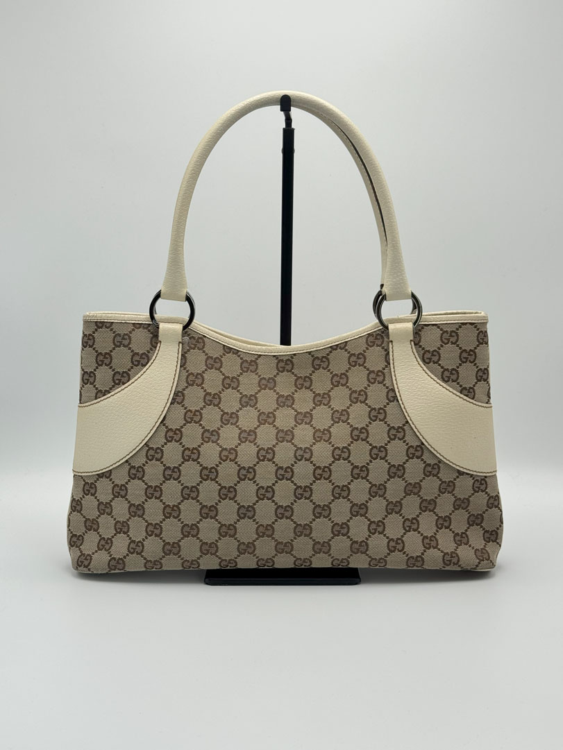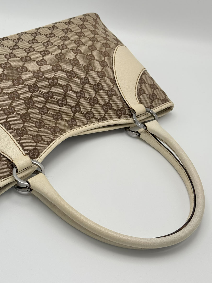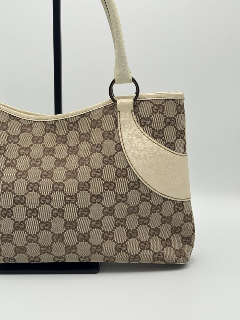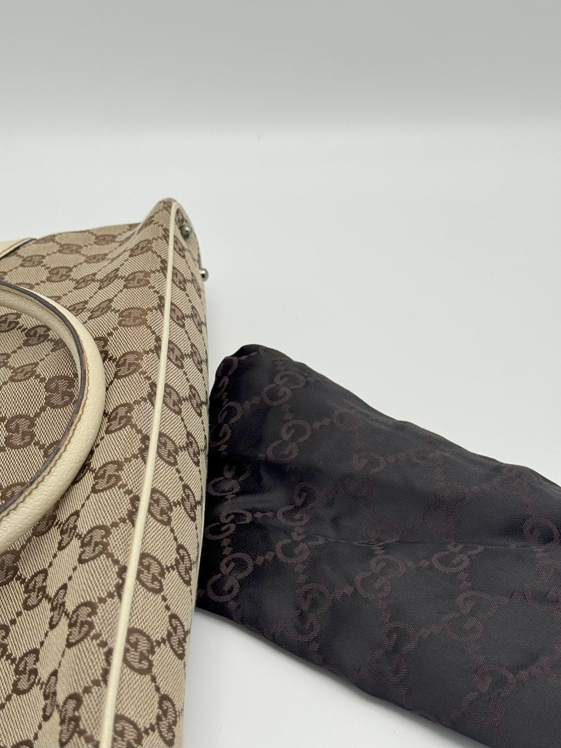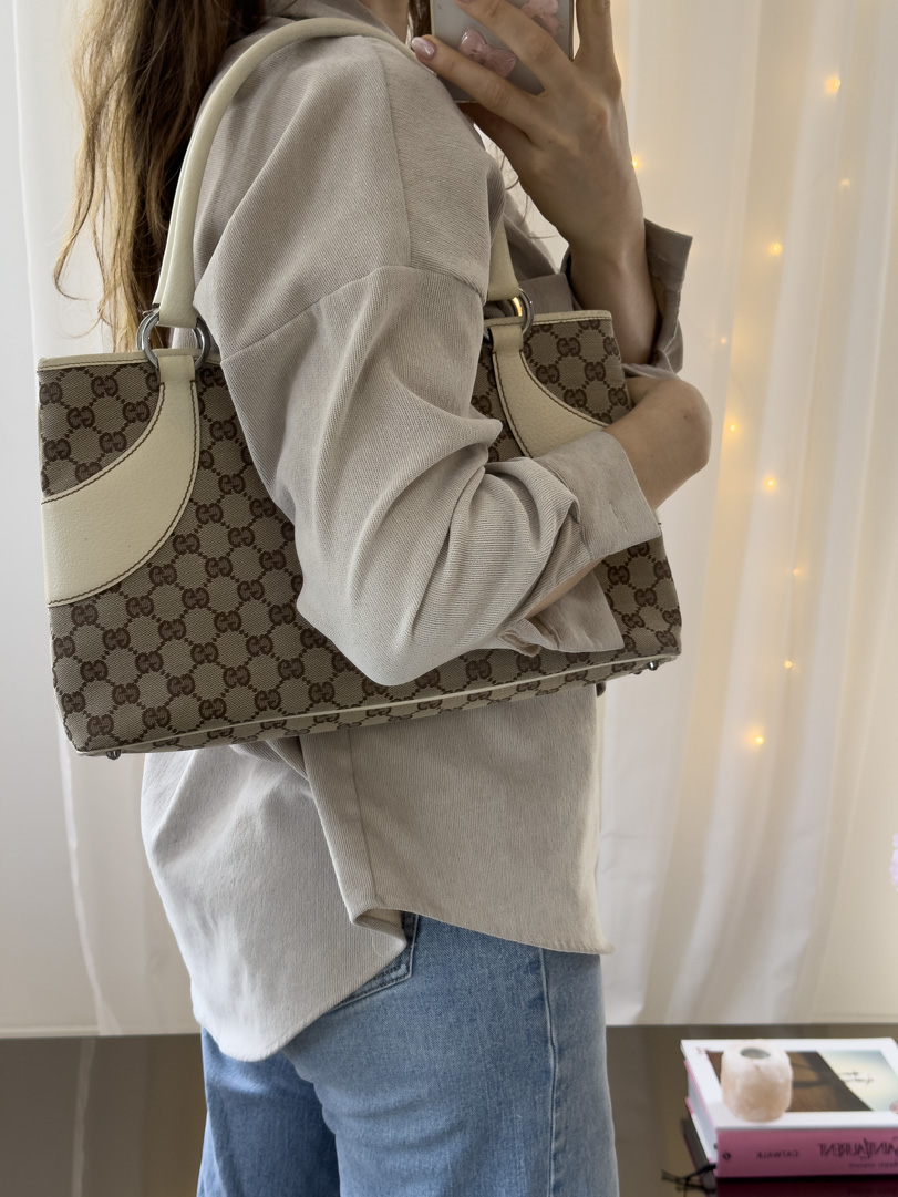 This vintage Gucci Shoulder Bag is crafted from brown GG canvas with light leather details and silver-tone hardware. It is in very good condition, showing light wear on the leather and corners. The canvas is clean and firm, with no stains. The interior is clean and features an extra zip pocket. The bag closes with a magnetic button. Comes with a dustbag. The serial number is 11301500103. Dimensions: 36 x 22 x 6 cm.