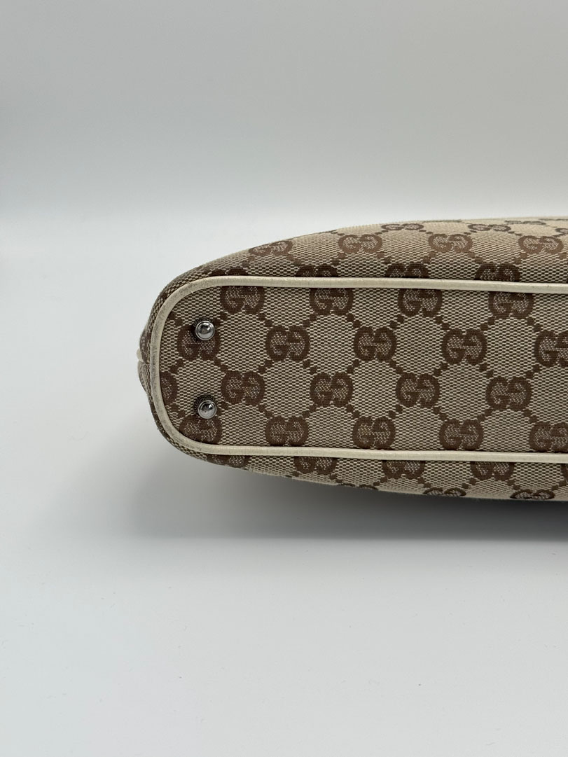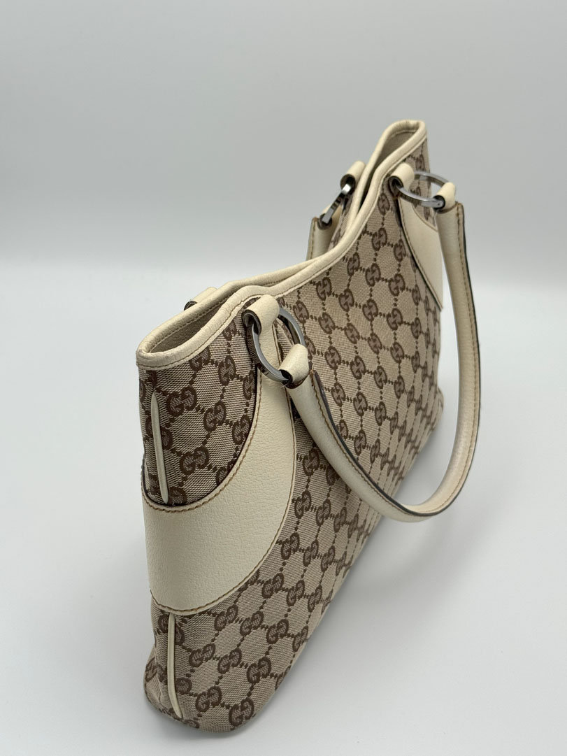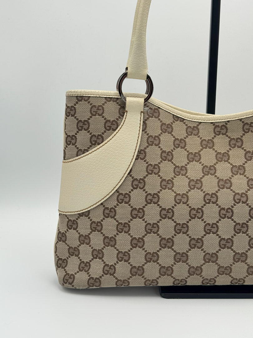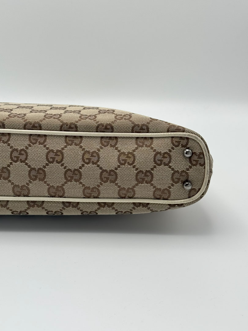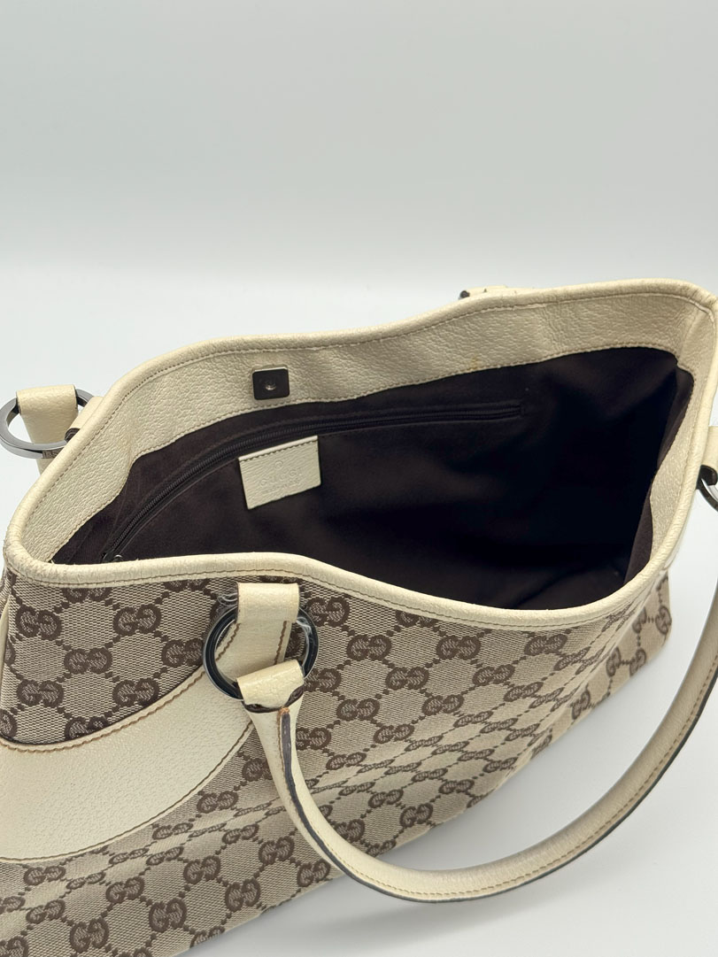 This vintage Gucci Shoulder Bag is crafted from brown GG canvas with light leather details and silver-tone hardware. It is in very good condition, showing light wear on the leather and corners. The canvas is clean and firm, with no stains. The interior is clean and features an extra zip pocket. The bag closes with a magnetic button. Comes with a dustbag. The serial number is 11301500103. Dimensions: 36 x 22 x 6 cm.