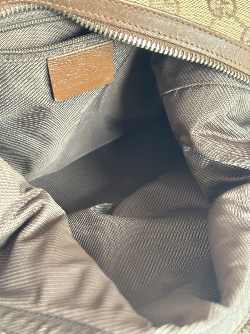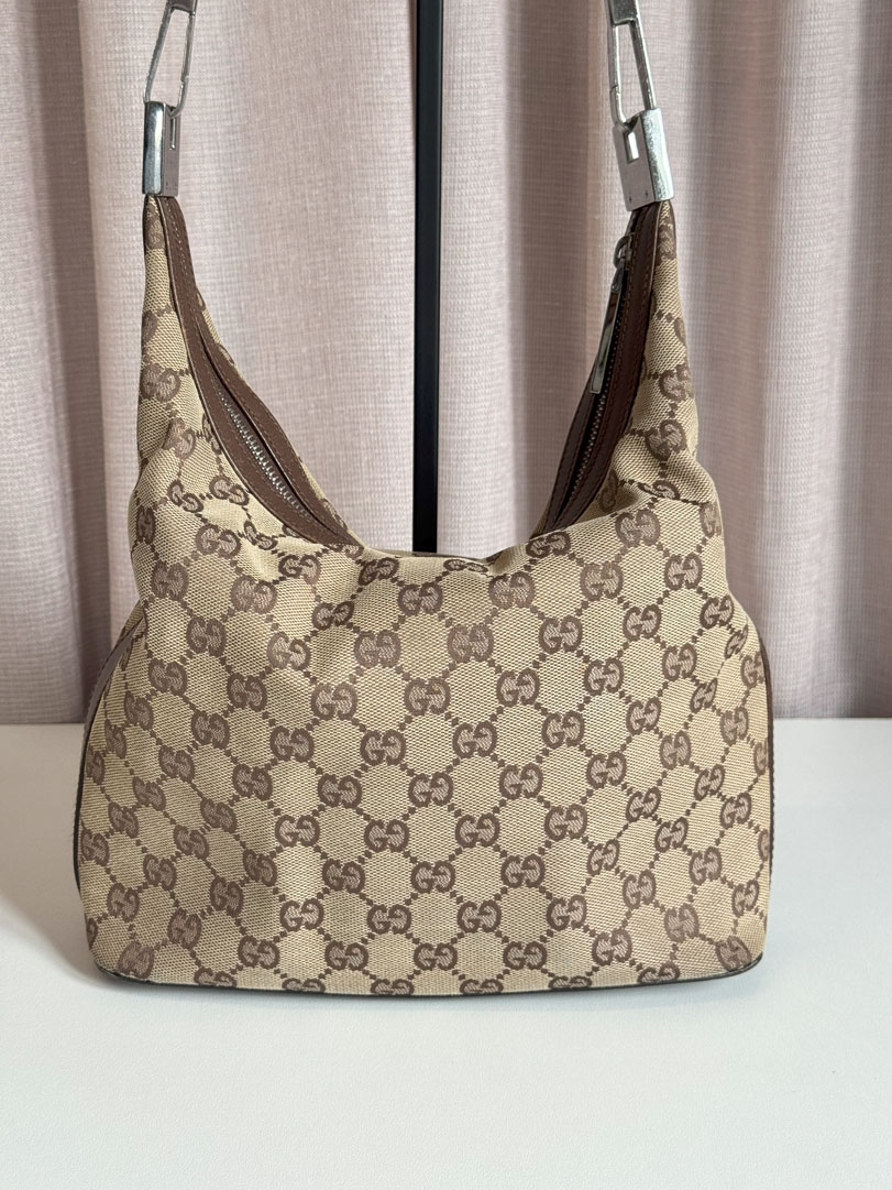 This vintage Gucci Shoulder Bag is a shoulder bag crafted from brown GG canvas with silver-tone hardware. It is in very good condition, with a clean interior featuring an additional zippered pocket. The zipper works well and there are minimal signs of use. The serial number is 1381402026. Dimensions: 25 x 20 x 12 cm.