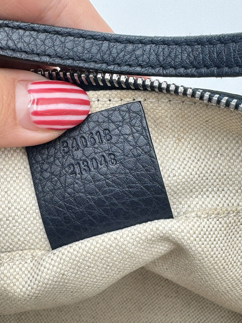 This vintage Gucci Soho Hand Bag Leather Black is a handbag made from black leather with silver-tone hardware. The item is in very good condition, showing some user signs such as minimal general imperfections. The interior is clean and features an extra pocket. The serial number is 340618 213046, and the dimensions are 28 x 16 x 10 cm