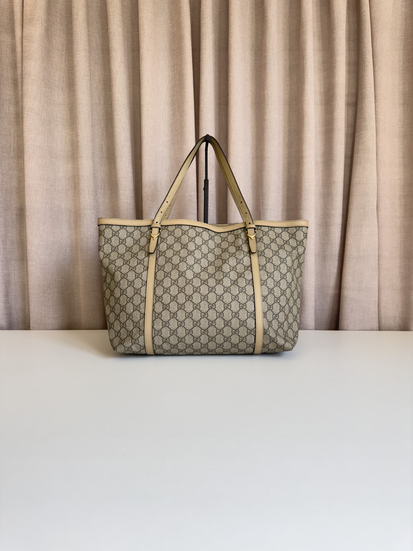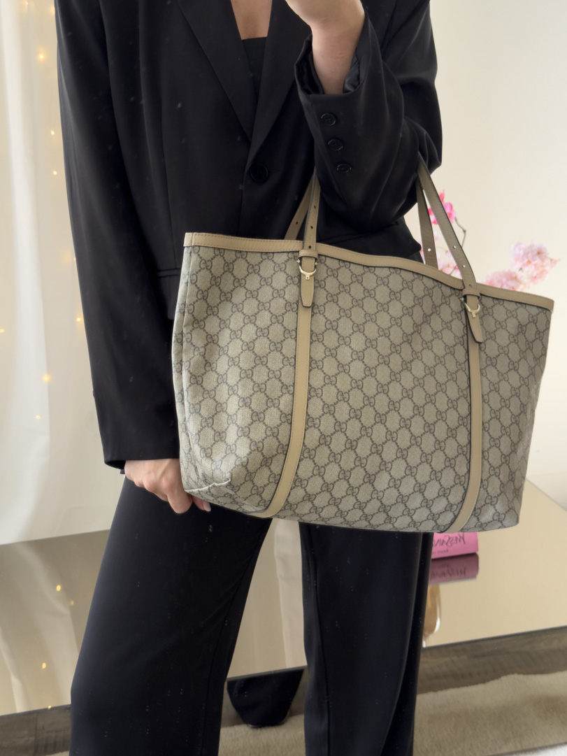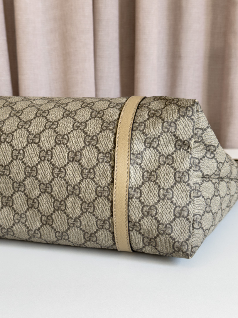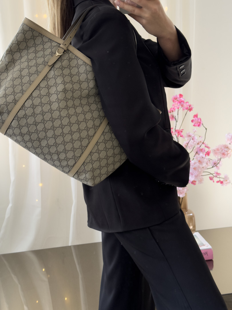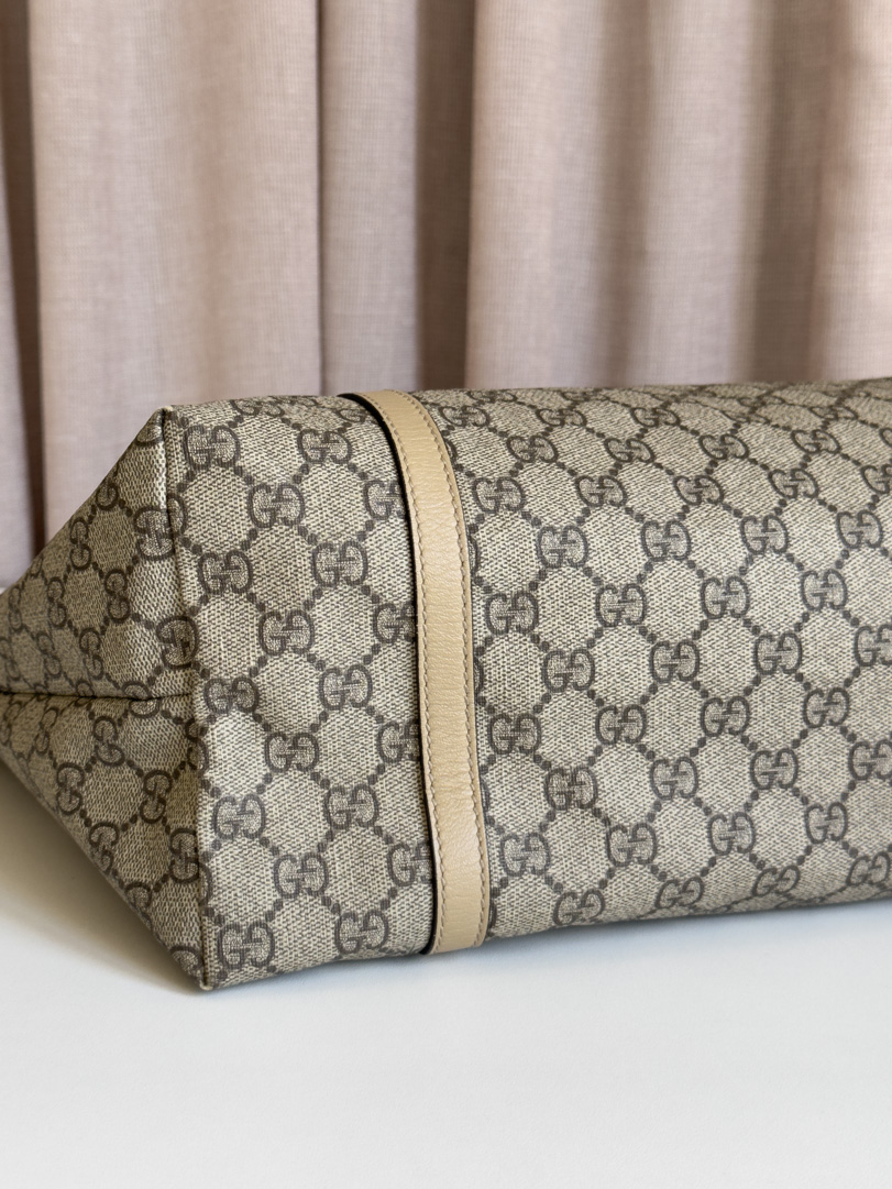 This vintage Gucci Supreme Shoulder Bag is a spacious shoulder bag made from GG Supreme canvas with light brown leather and champagne-tone hardware. Perfect for work or school, it is in very good condition, with some light corner wear and a few small imperfections on the canvas. The interior is clean and features an extra zippered pocket. Comes with a dustbag. The serial number is 309613002123. Dimensions: 33 x 28 x 15 cm.