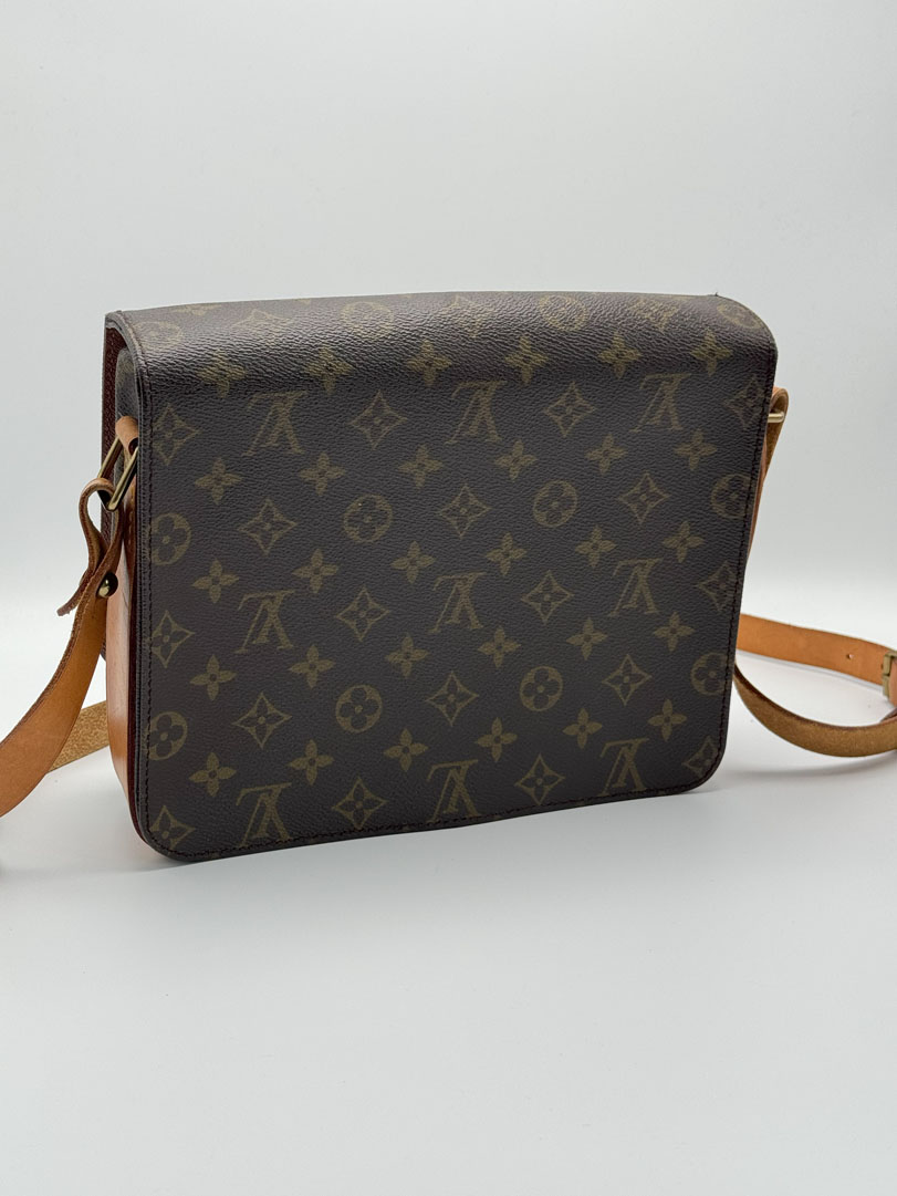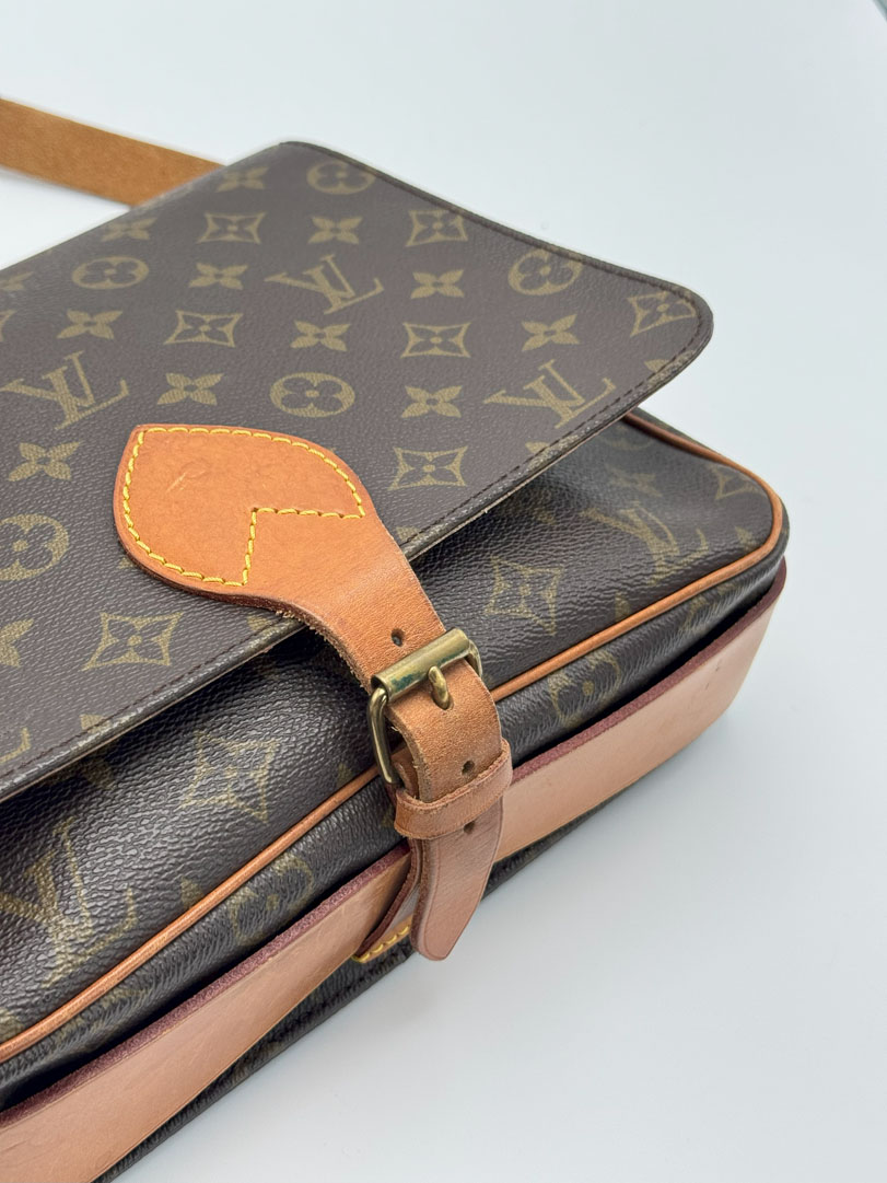 This vintage Louis Vuitton Cartouchière is a crossbody bag crafted from brown Monogram canvas with gold-tone hardware. It is in very good condition, showing some small imperfections on the vachetta and canvas. The interior is clean, and the strap is adjustable. The datacode is SL0921. Dimensions: 26 x 21 x 8 cm.