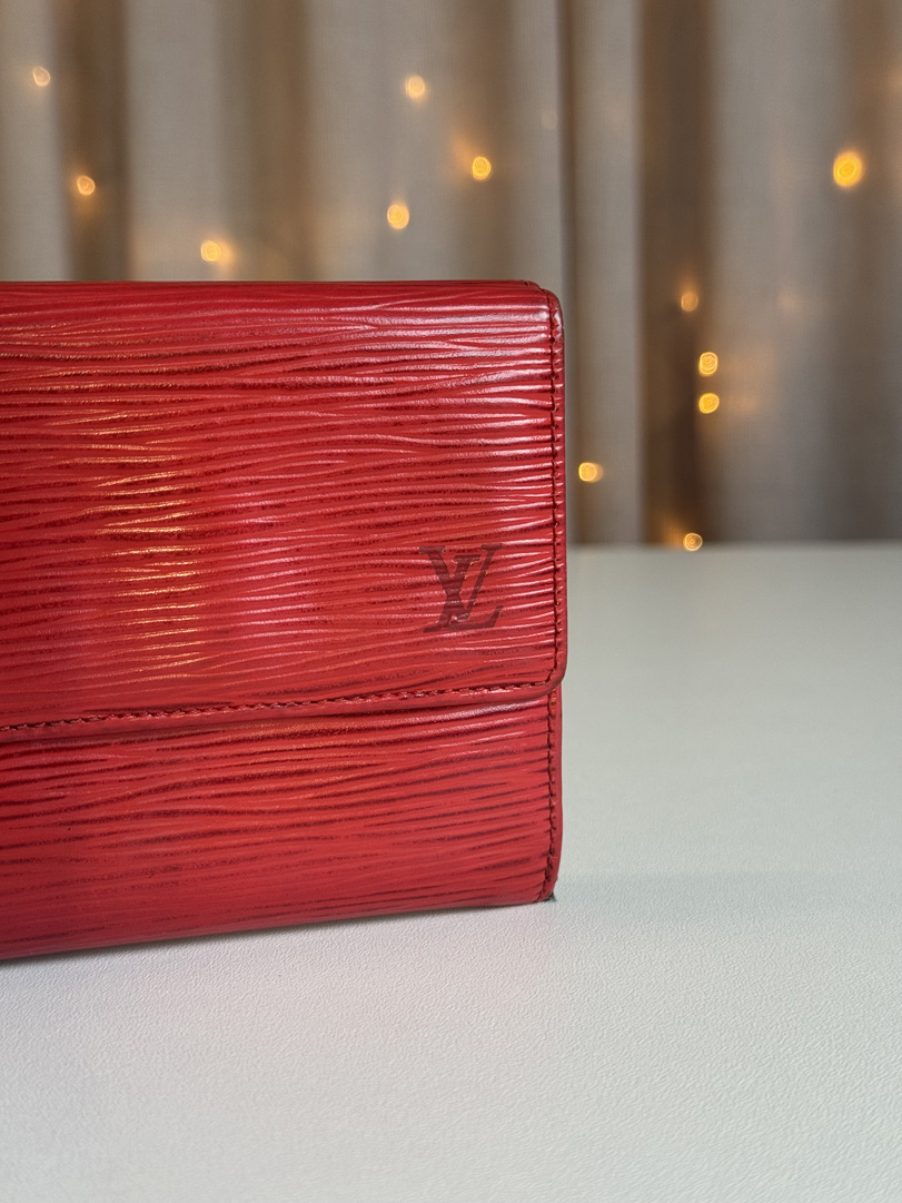 The Louis Vuitton Epi Leather Red Wallet is in good condition with light signs of use, such as wear on the corners. The interior remains in good condition, with space for cards, coins, and cash. There is some light peeling, but overall, the wallet is in great shape. The dimensions are 10 x 11 cm. This wallet comes with a Louis Vuitton dustbag.