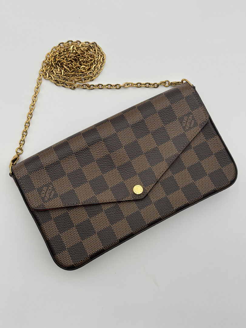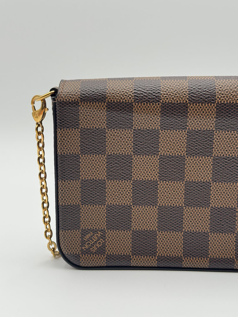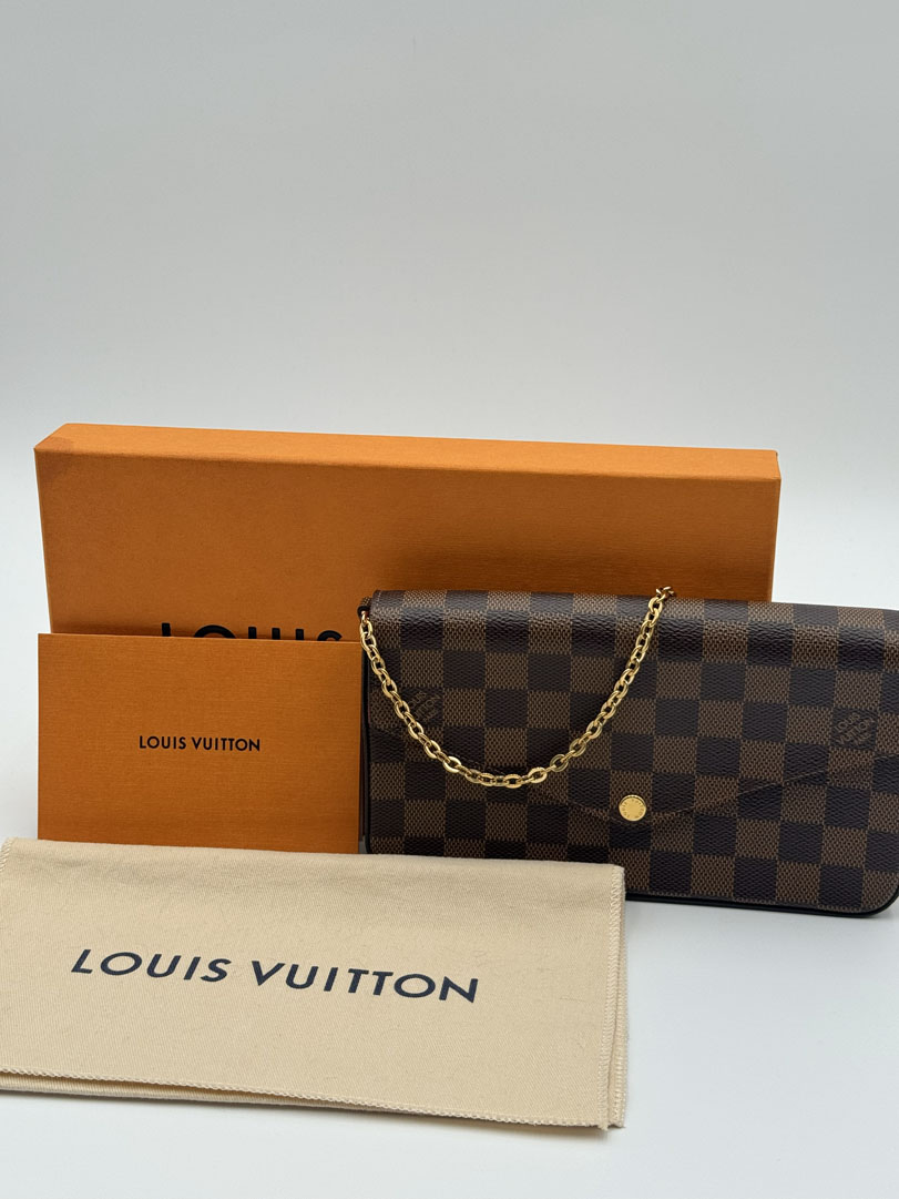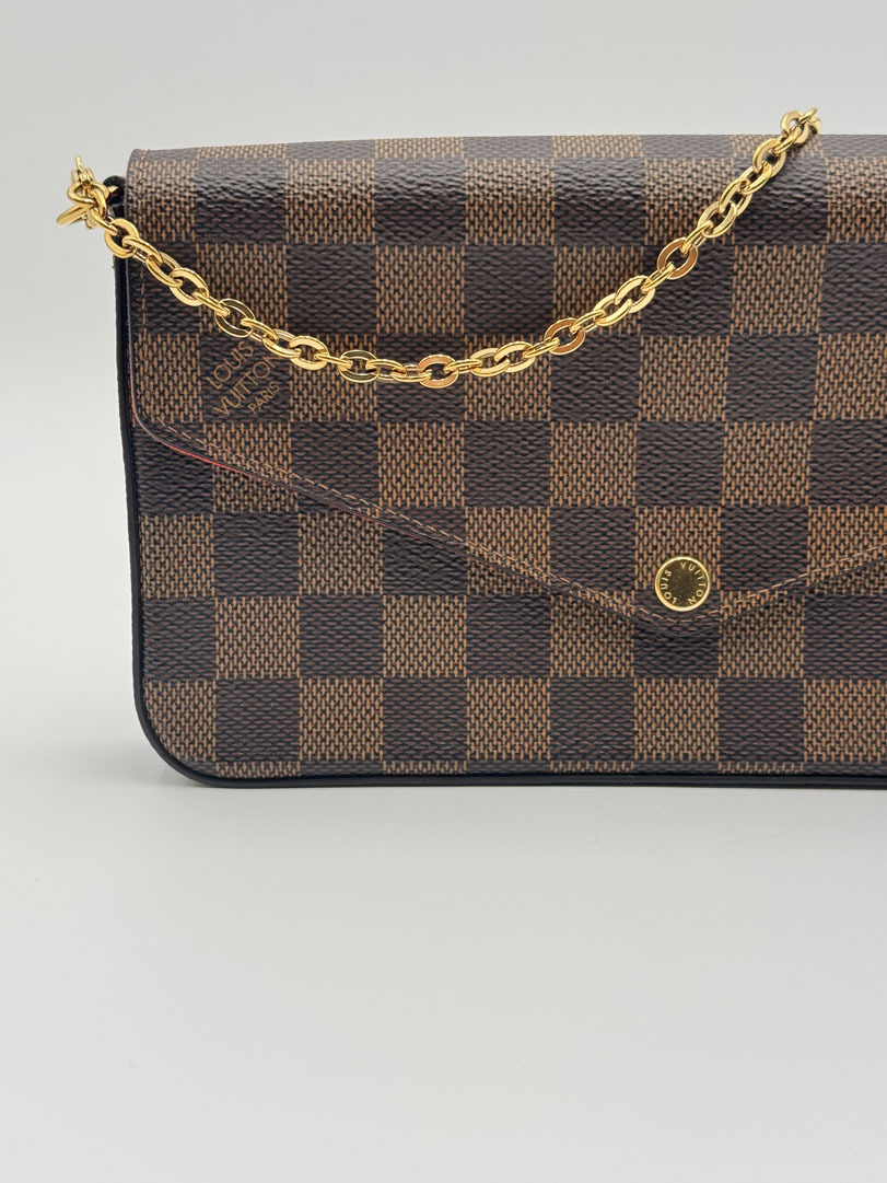 This vintage Louis Vuitton Félicie Damier Ebene is a crossbody bag crafted from brown Damier Ebene canvas with gold-tone hardware. It is in like new condition, there are only very fine scratches on the closure and some small imperfections on the leather and corners. The interior is clean and features an extra pocket, and the bag comes with two inserts. This is a compact crossbody bag that fits a phone, and the strap can be detached. It comes with a dustbag and box. The datacode is FH2280 from 2020. Dimensions are 21 x 12 x 3 cm.