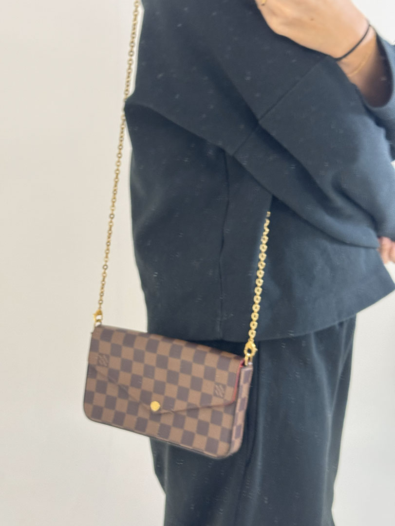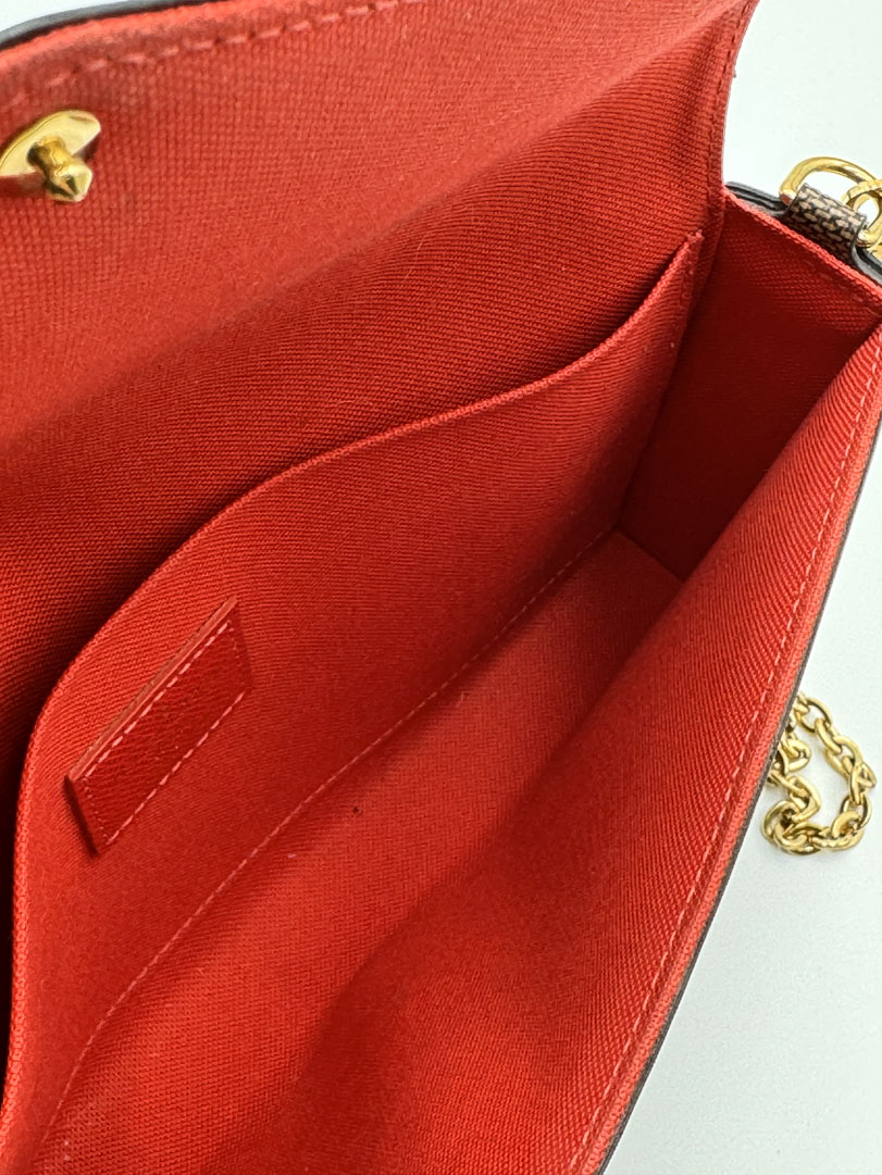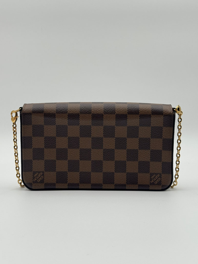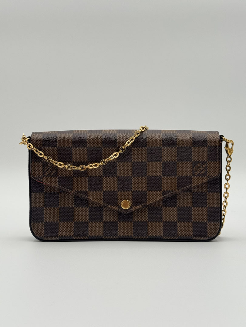 This vintage Louis Vuitton Félicie Damier Ebene is a crossbody bag crafted from brown Damier Ebene canvas with gold-tone hardware. It is in like new condition, there are only very fine scratches on the closure and some small imperfections on the leather and corners. The interior is clean and features an extra pocket, and the bag comes with two inserts. This is a compact crossbody bag that fits a phone, and the strap can be detached. It comes with a dustbag and box. The datacode is FH2280 from 2020. Dimensions are 21 x 12 x 3 cm.