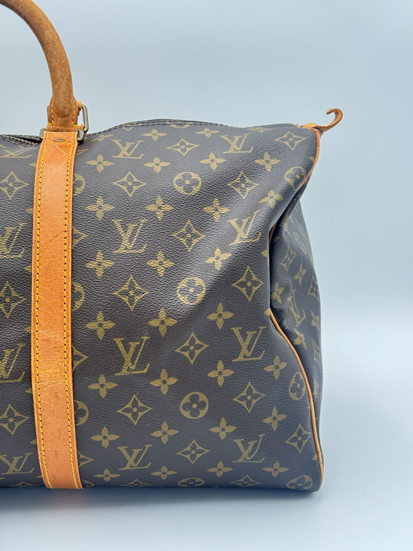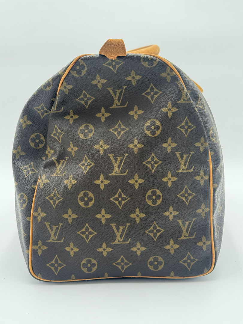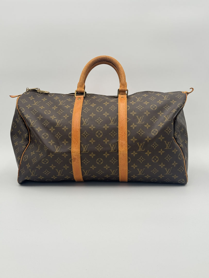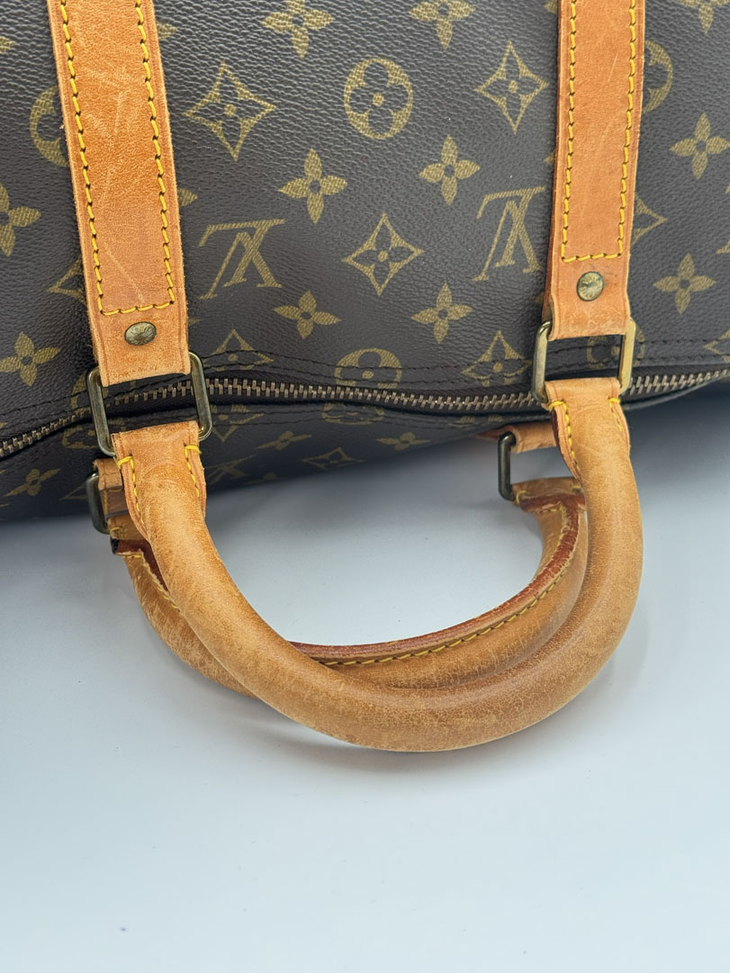 This vintage Louis Vuitton Keepall 50 is a travel bag made from brown Monogram Canvas with gold-tone hardware. The item is in very good condition, showing some user signs such as small stains on the leather and wear on the corners. This is a classic spacious travel bag in carry-on size and can be taken as hand luggage on an airplane. The datacode is VI882, and the dimensions are 50 x 29 x 22 cm.