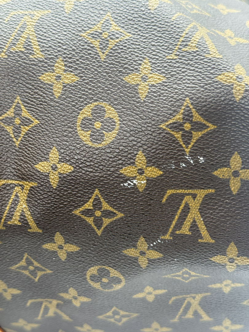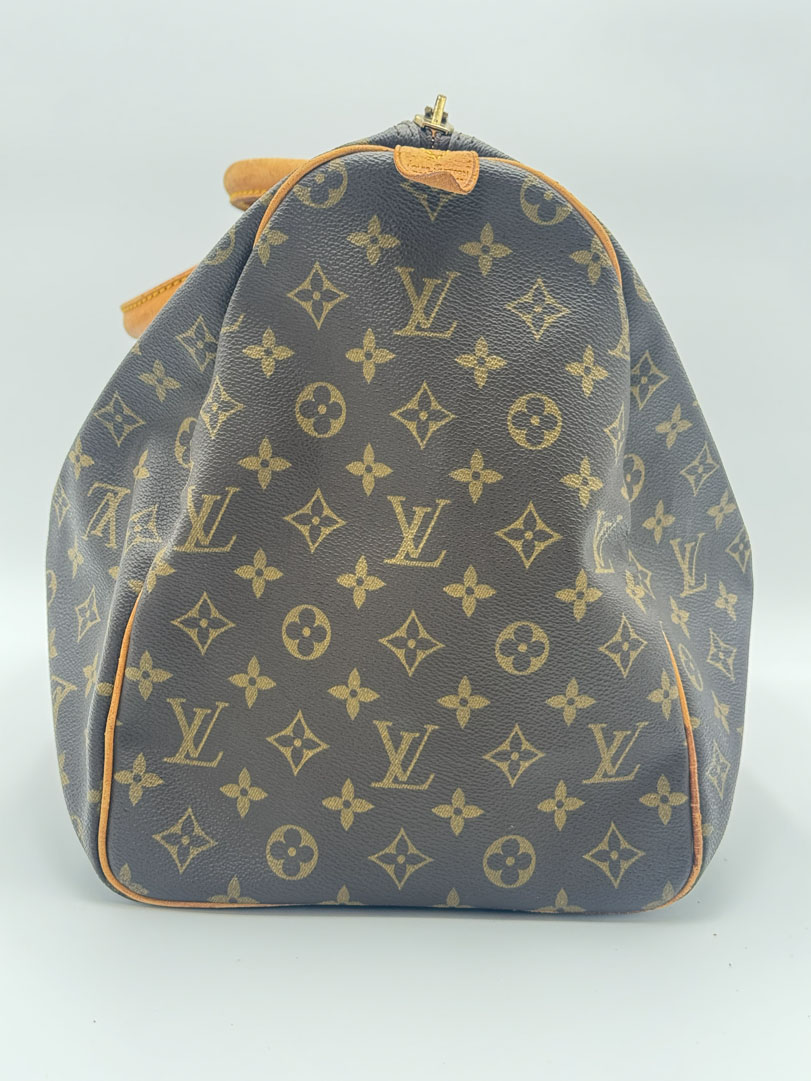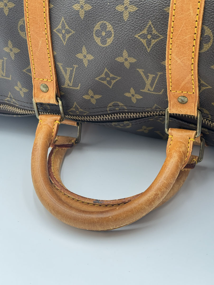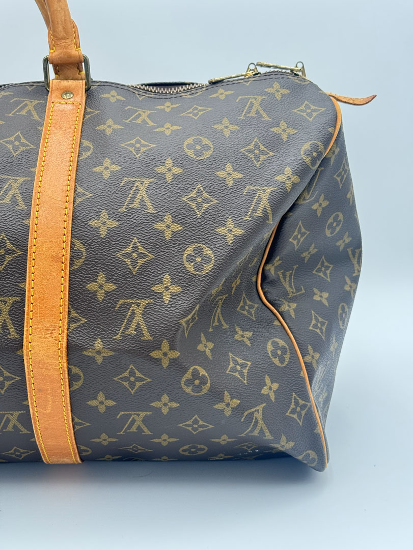 This vintage Louis Vuitton Keepall 50 is a travel bag made from brown Monogram Canvas with gold-tone hardware. The item is in very good condition, showing some user signs such as small stains on the leather and wear on the corners. This is a classic spacious travel bag in carry-on size and can be taken as hand luggage on an airplane. The datacode is VI882, and the dimensions are 50 x 29 x 22 cm.