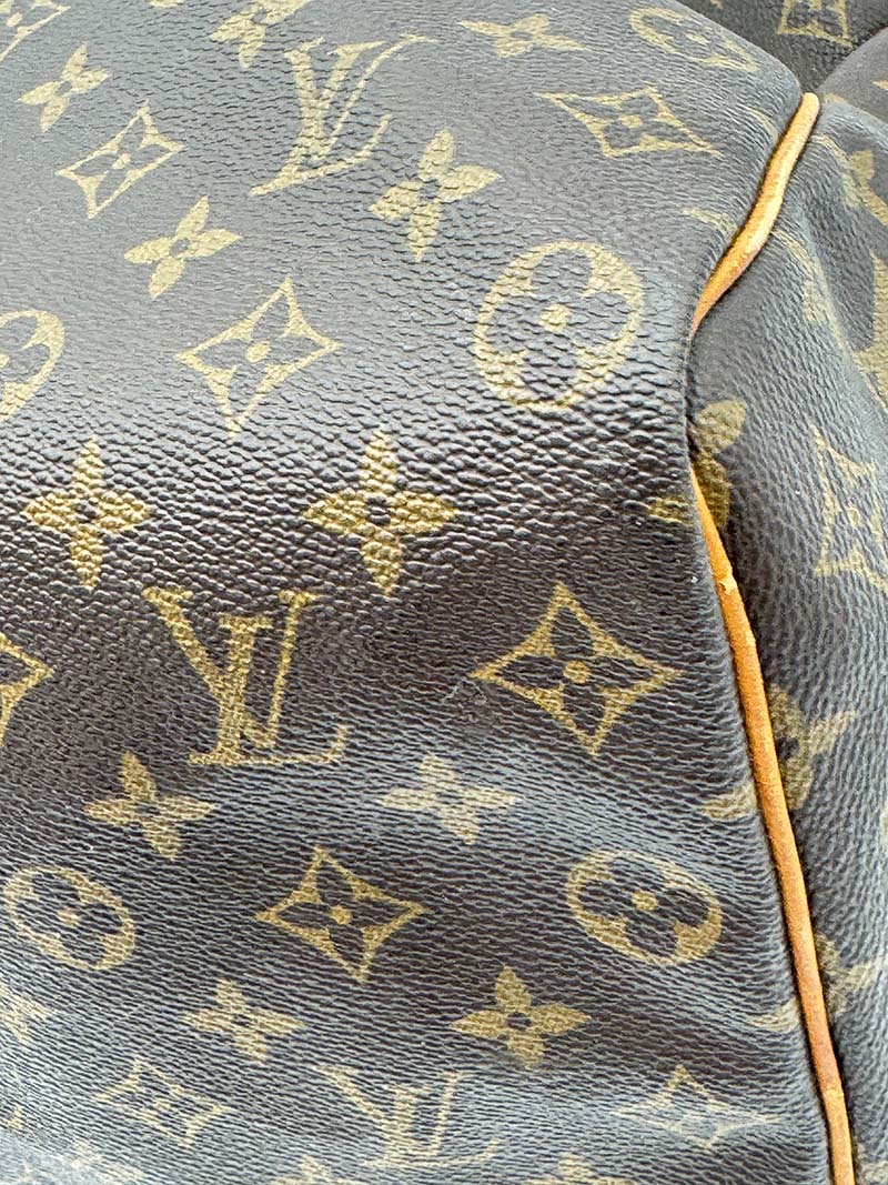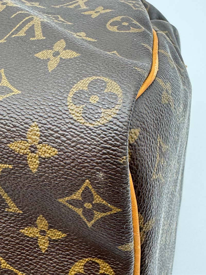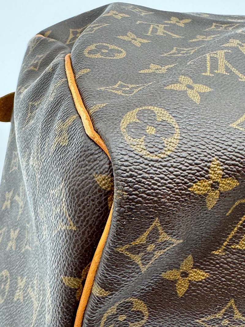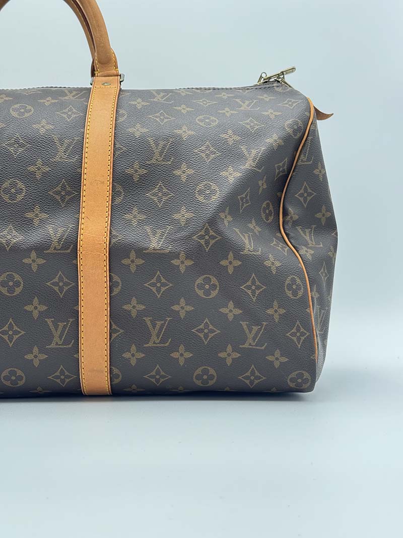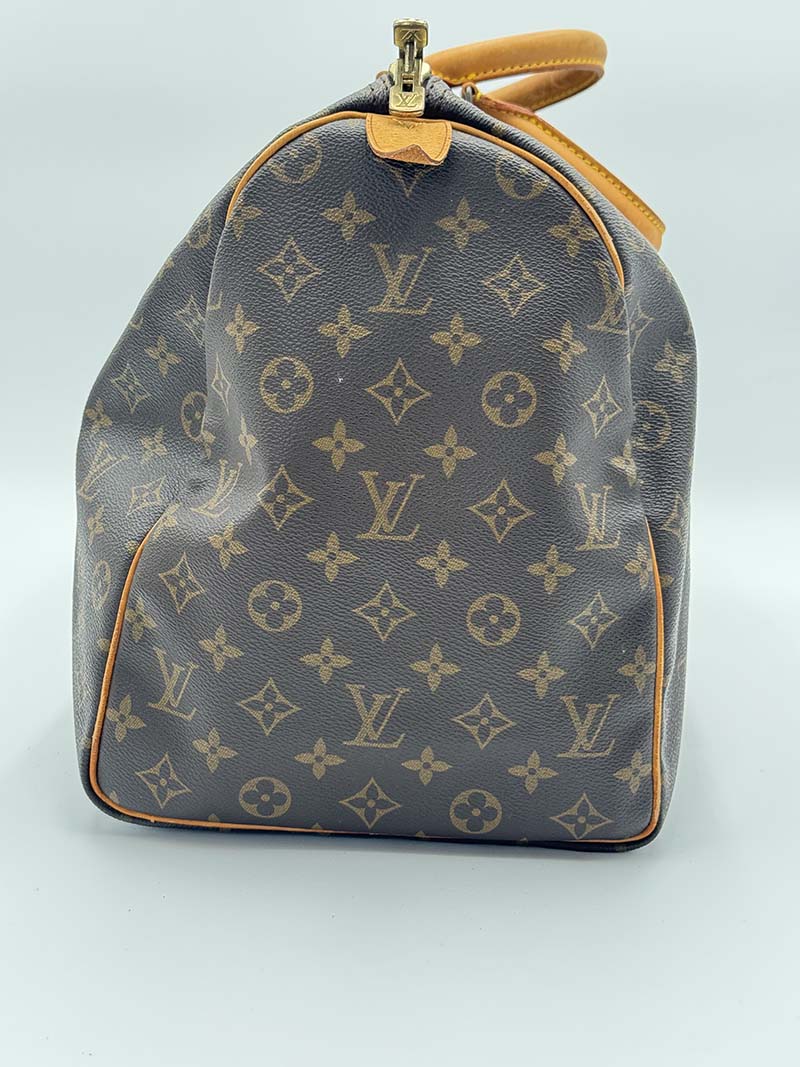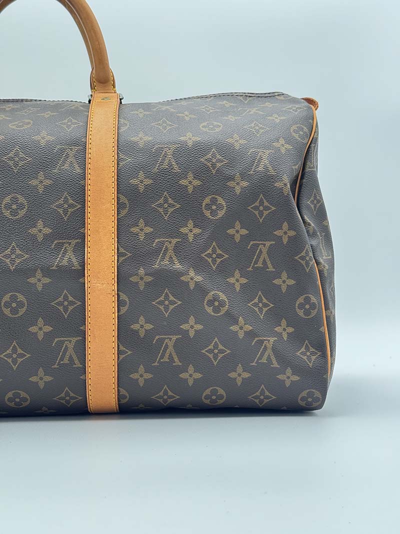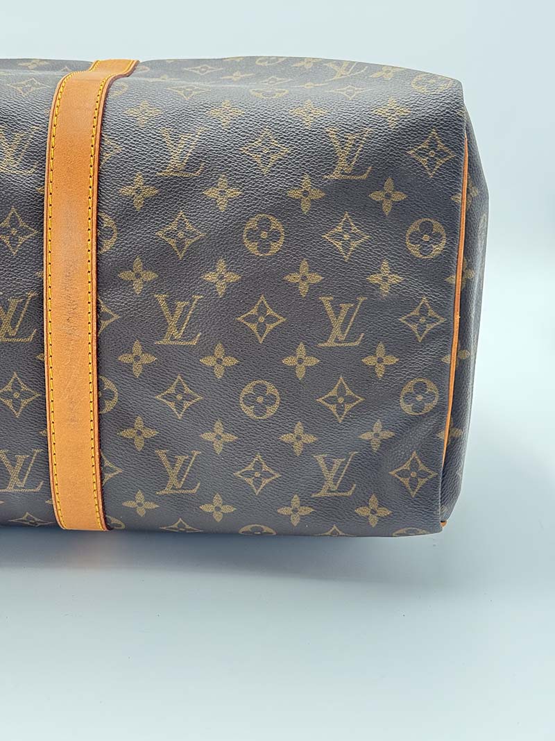 This vintage Louis Vuitton Keepall 50 Bag is a travel bag made from brown Monogram canvas with gold-tone hardware. The item shows some user signs but is still in a very good condition, with light signs of use, including wear on the corners and a minimal stain on the bottom of the bag. The interior is clean, and the bag closes with a zipper. Dimensions: 50 x 29 x 22 cm. The date code is MB1900, indicating the year 1990. It is a classic spacious travel bag in carry-on size and may be taken as hand luggage on the airplane.