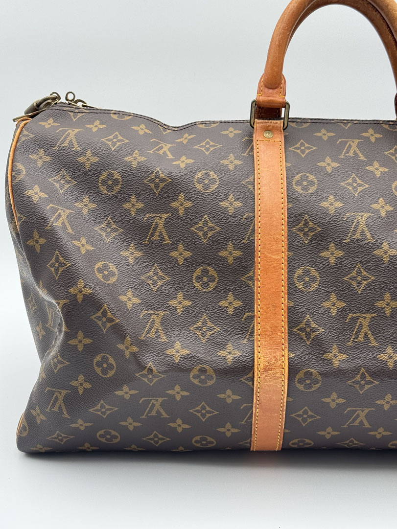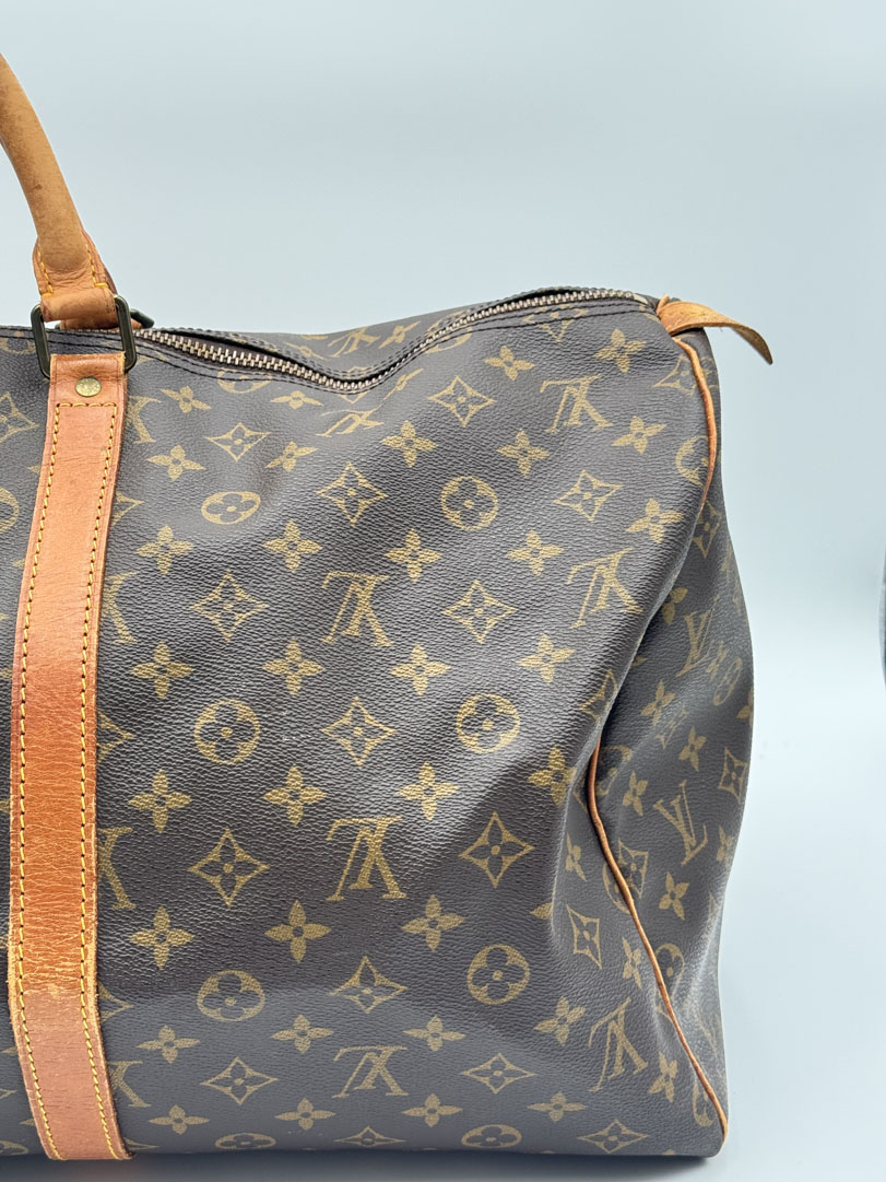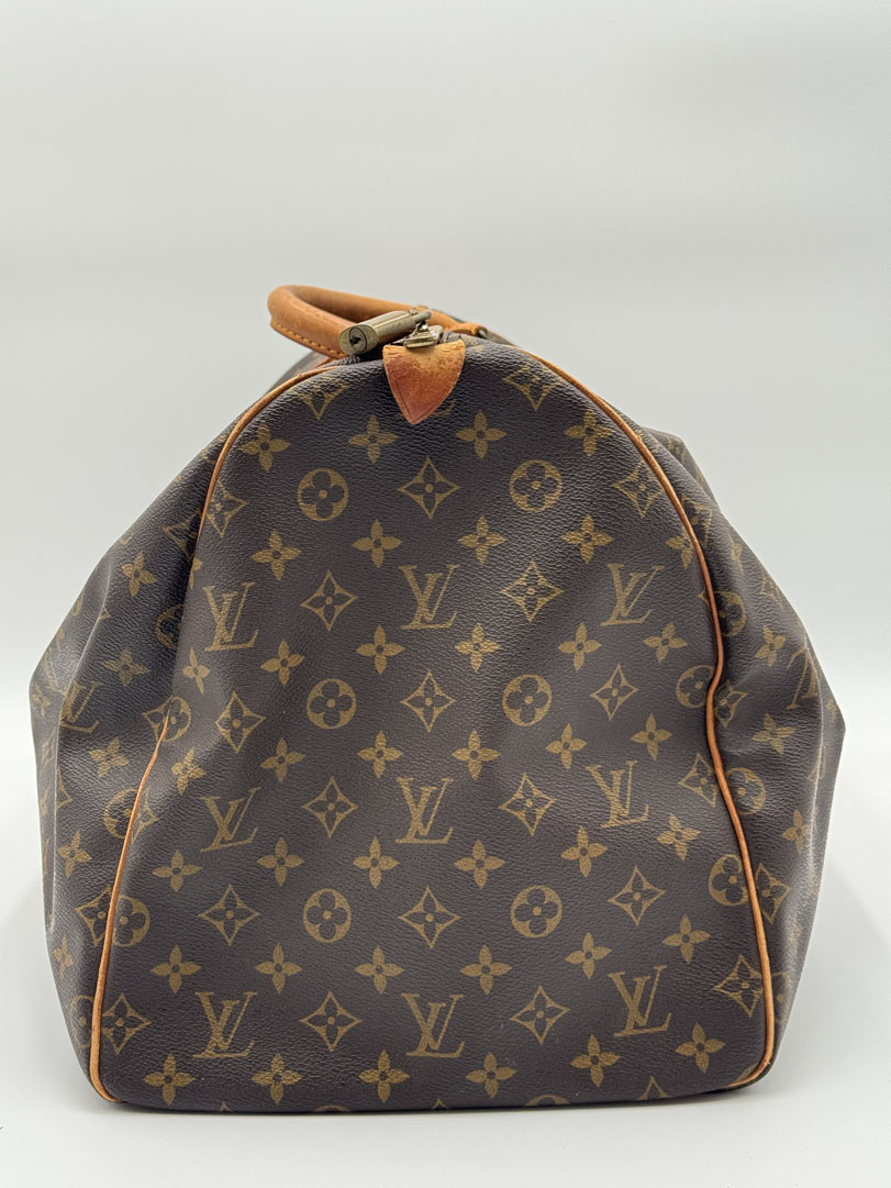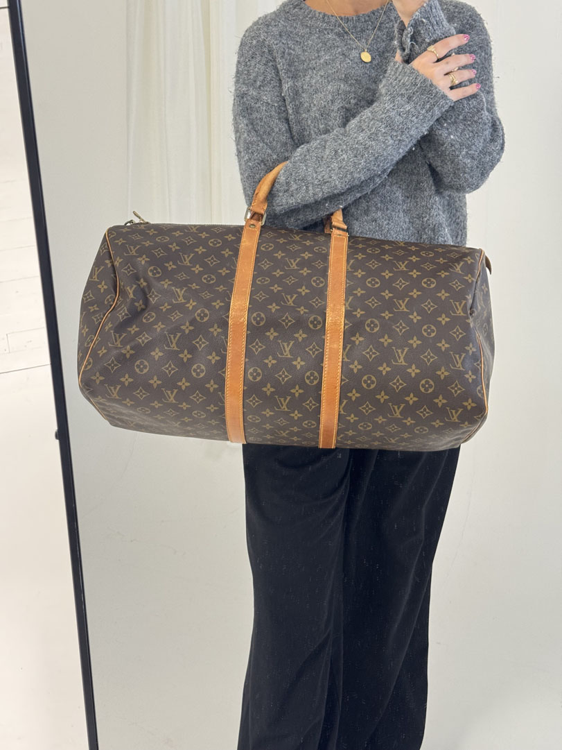 This vintage Louis Vuitton Keepall 55 is a travel bag made from brown Monogram Canvas with gold-tone hardware. The item is in very good condition, showing some user signs such as discoloration, scratches on the hardware, and some small stains. The interior is clean. Dimensions are 55 x 31 x 24 cm. The datacode is no longer readable. This is a large travel bag commonly used for short trips and can still be taken as carry-on luggage on an airplane.