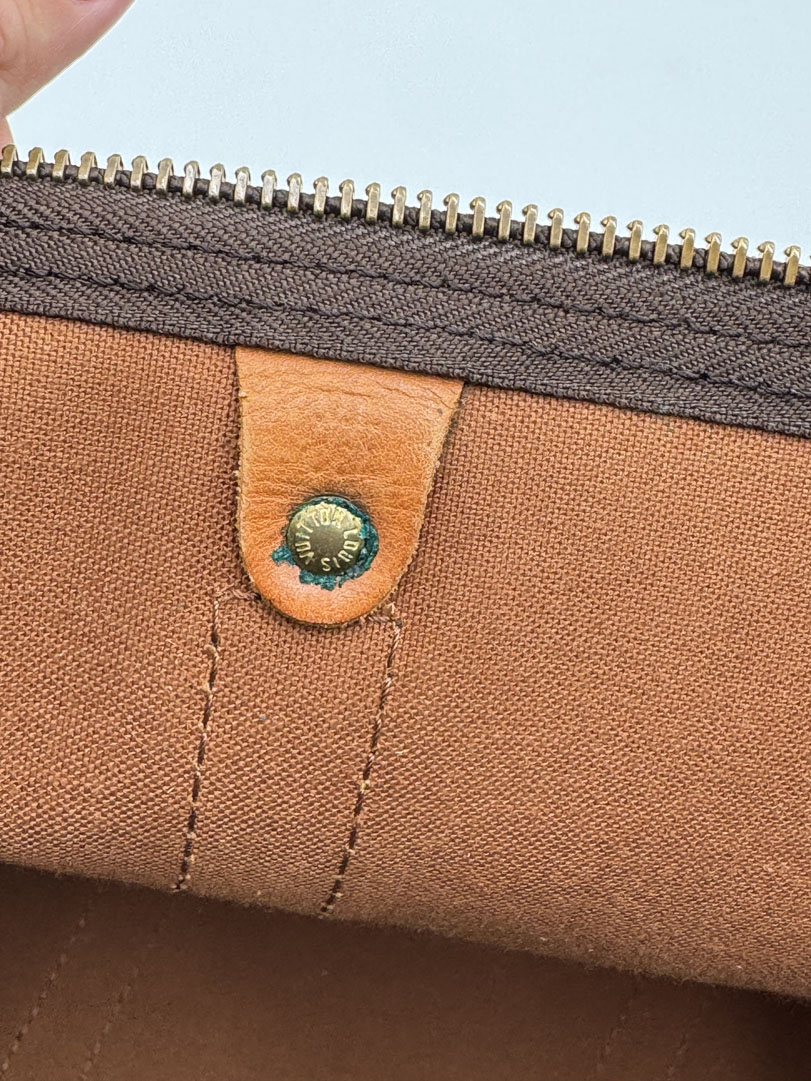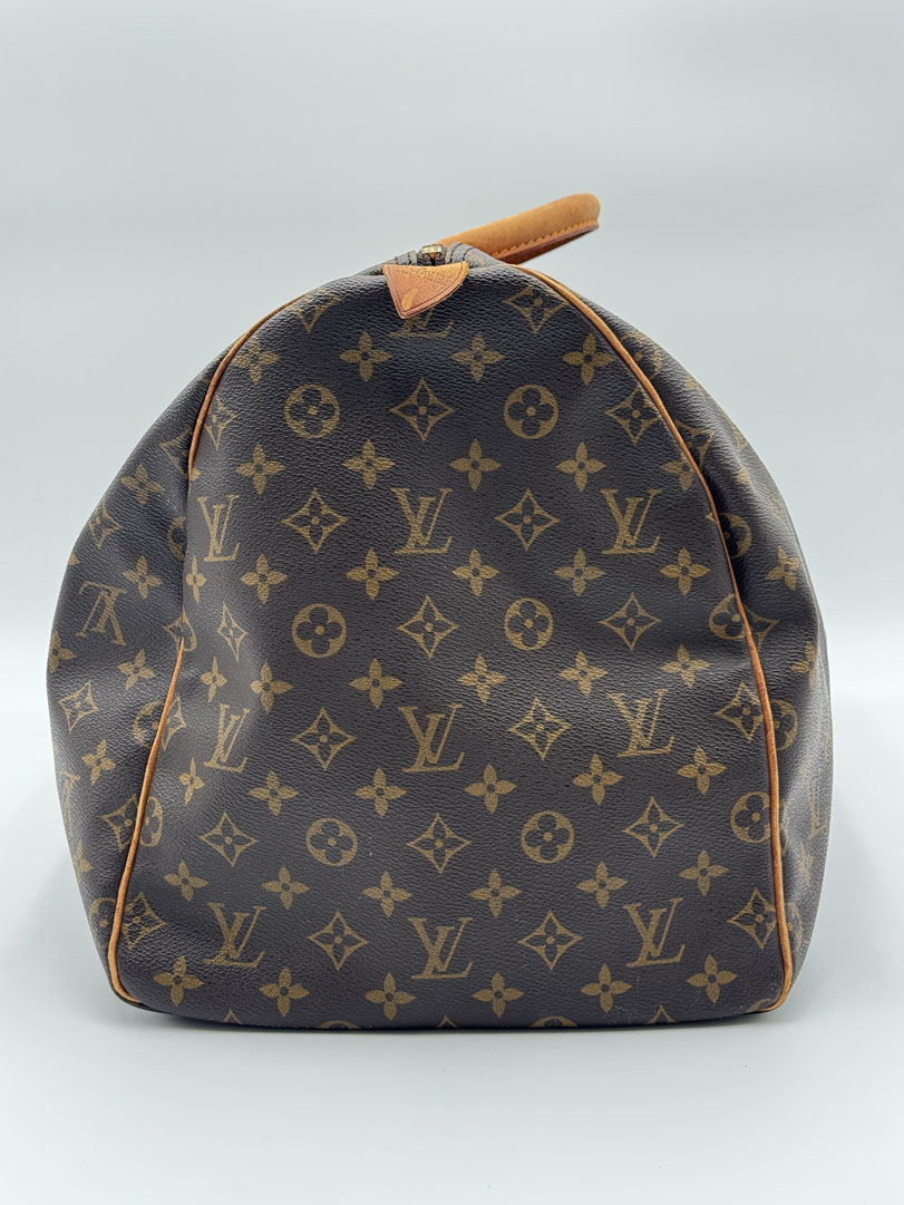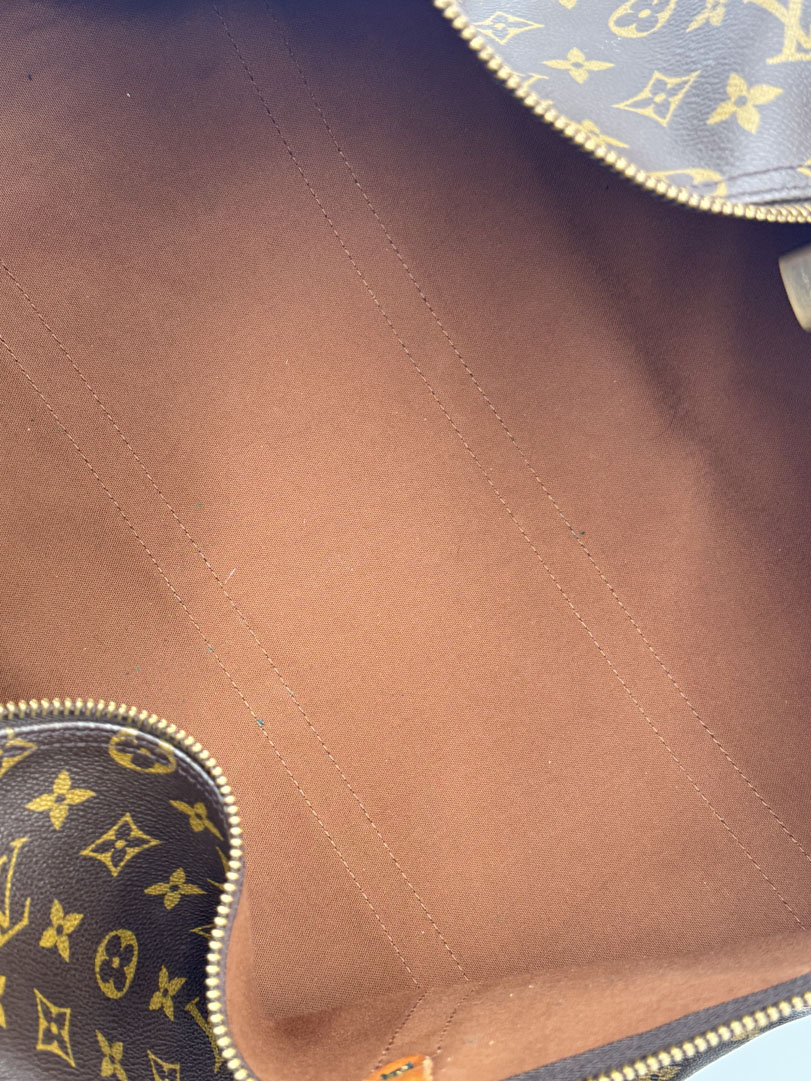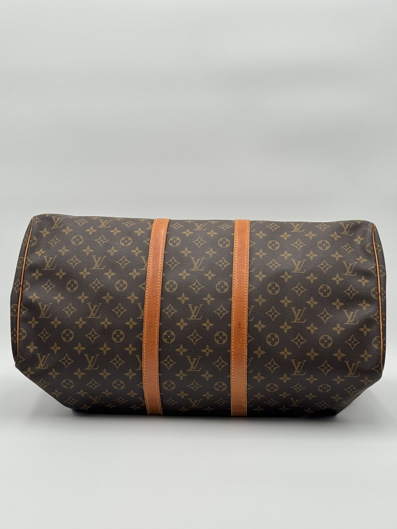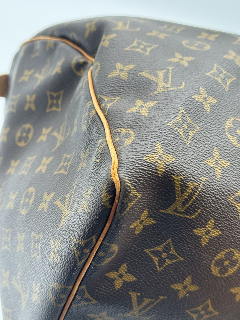 This vintage Louis Vuitton Keepall 55 is a travel bag made from brown Monogram Canvas with gold-tone hardware. The item is in very good condition, showing some user signs such as discoloration, scratches on the hardware, and some small stains. The interior is clean. Dimensions are 55 x 31 x 24 cm. The datacode is no longer readable. This is a large travel bag commonly used for short trips and can still be taken as carry-on luggage on an airplane.
