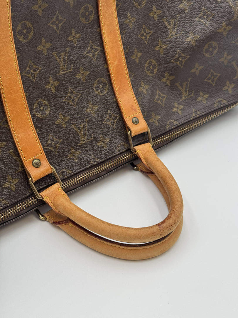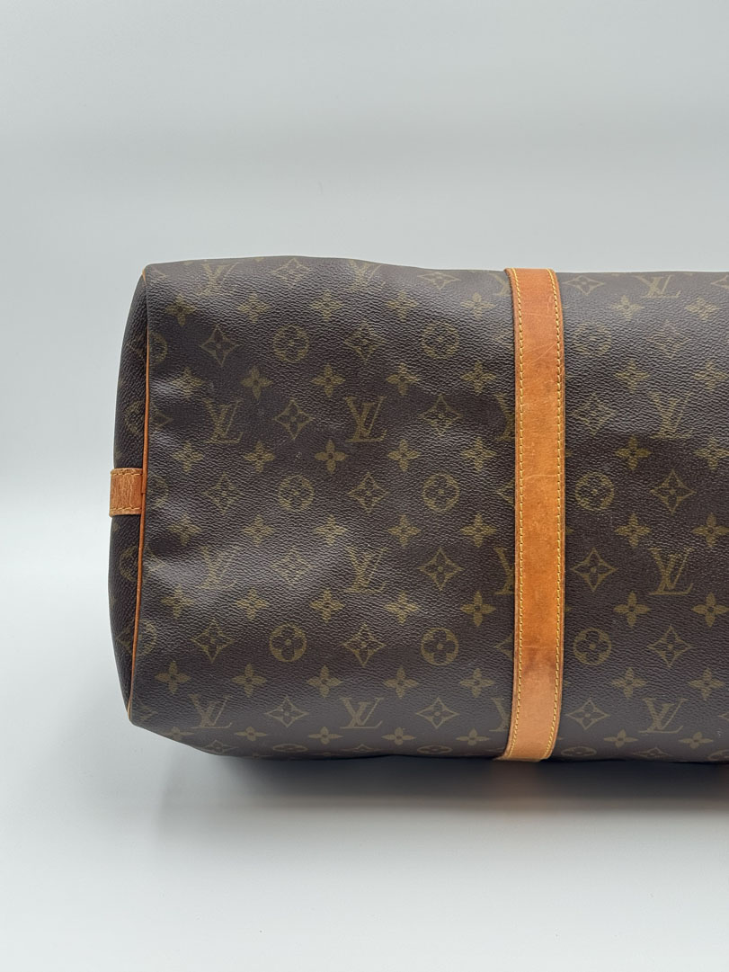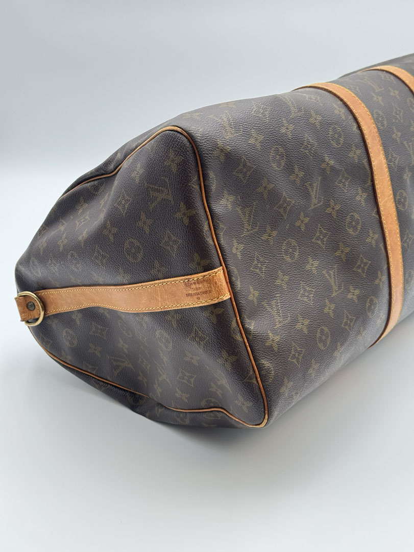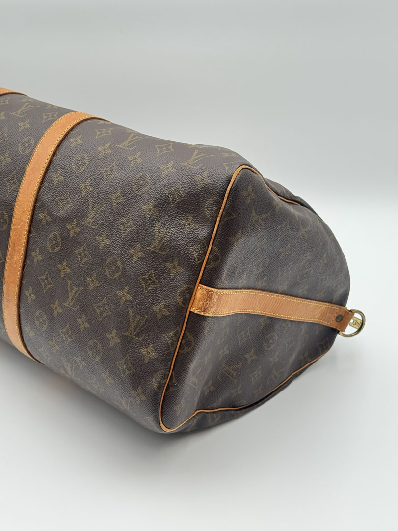 This vintage Louis Vuitton Keepall Bandoulière 55 is a travel bag crafted from brown Monogram canvas with gold-tone hardware. It is in very good condition, with a clean interior showing a few small marks. The vachetta leather is beautifully darkened with minor imperfections, while the zipper works smoothly. Comes with a long strap for shoulder or crossbody wear. A fantastic vintage piece that still qualifies as carry-on luggage. The datacode is SD1924 (1994). Dimensions: 55 x 31 x 24 cm.