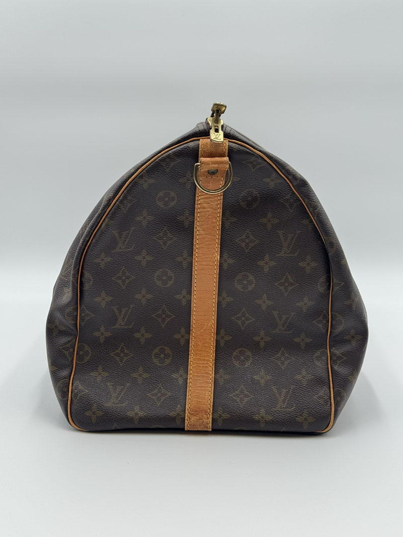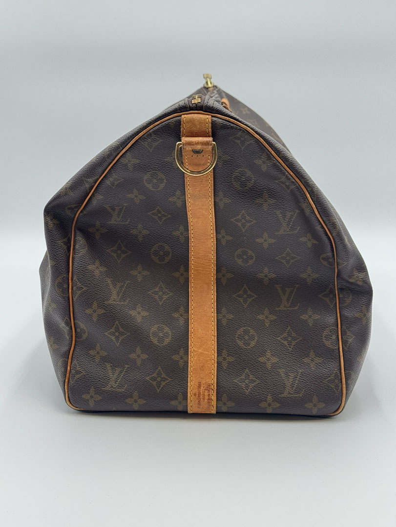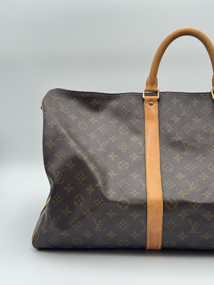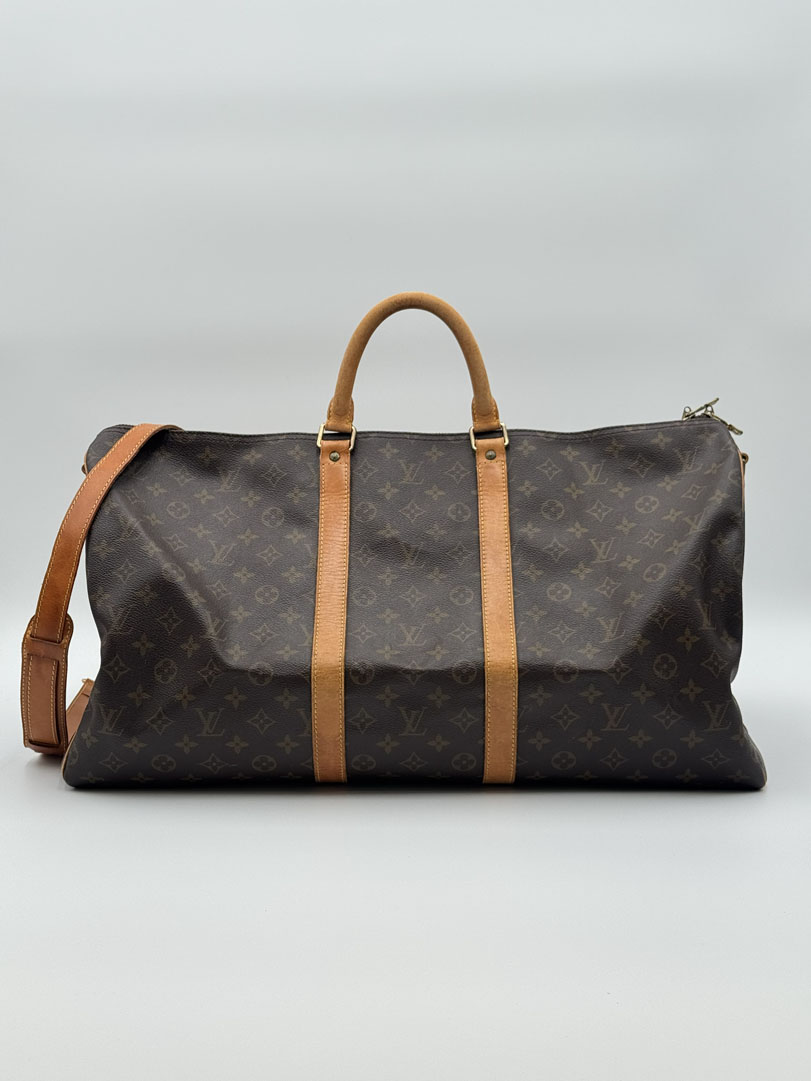 This vintage Louis Vuitton Keepall Bandoulière 55 is a travel bag crafted from brown Monogram canvas with gold-tone hardware. It is in very good condition, with a clean interior showing a few small marks. The vachetta leather is beautifully darkened with minor imperfections, while the zipper works smoothly. Comes with a long strap for shoulder or crossbody wear. A fantastic vintage piece that still qualifies as carry-on luggage. The datacode is SD1924 (1994). Dimensions: 55 x 31 x 24 cm.