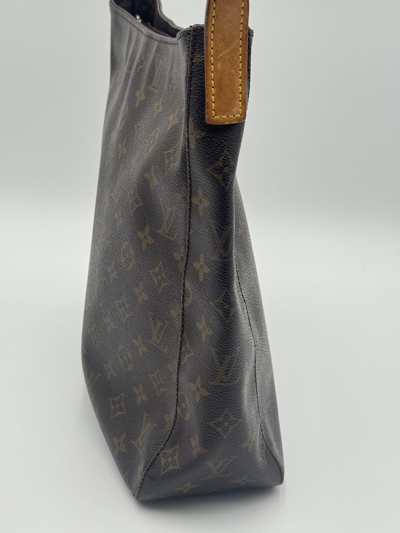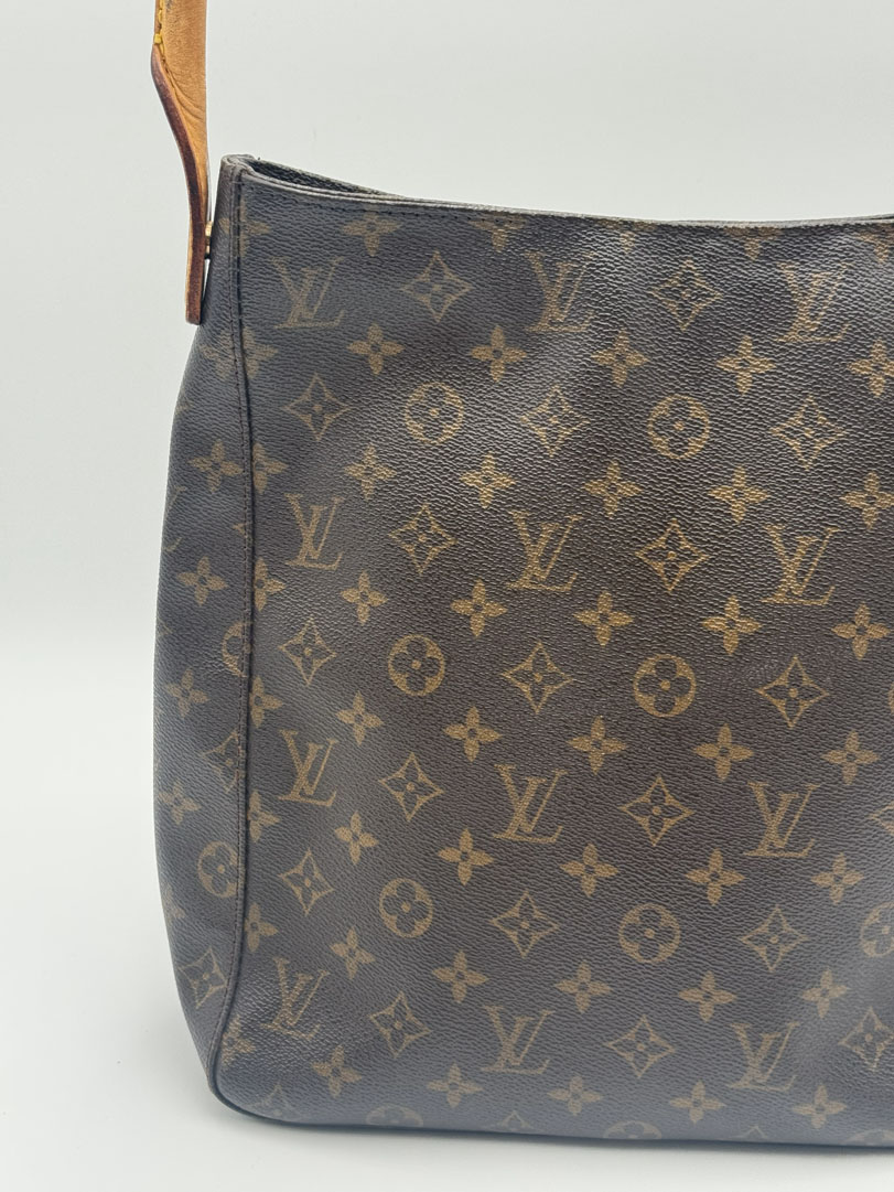 This vintage Louis Vuitton Looping GM Shoulder Bag is a shoulder bag crafted from brown monogram canvas with gold-tone hardware. It is in very good condition, showing some light imperfections and signs of use, such as some stains on the strap. The interior is clean with an extra pocket. This is the largest size of the Looping, a hobo-style bag with a magnetic closure. The datacode is MI0989 from 1999. Dimensions are 28 x 30 x 11 cm.