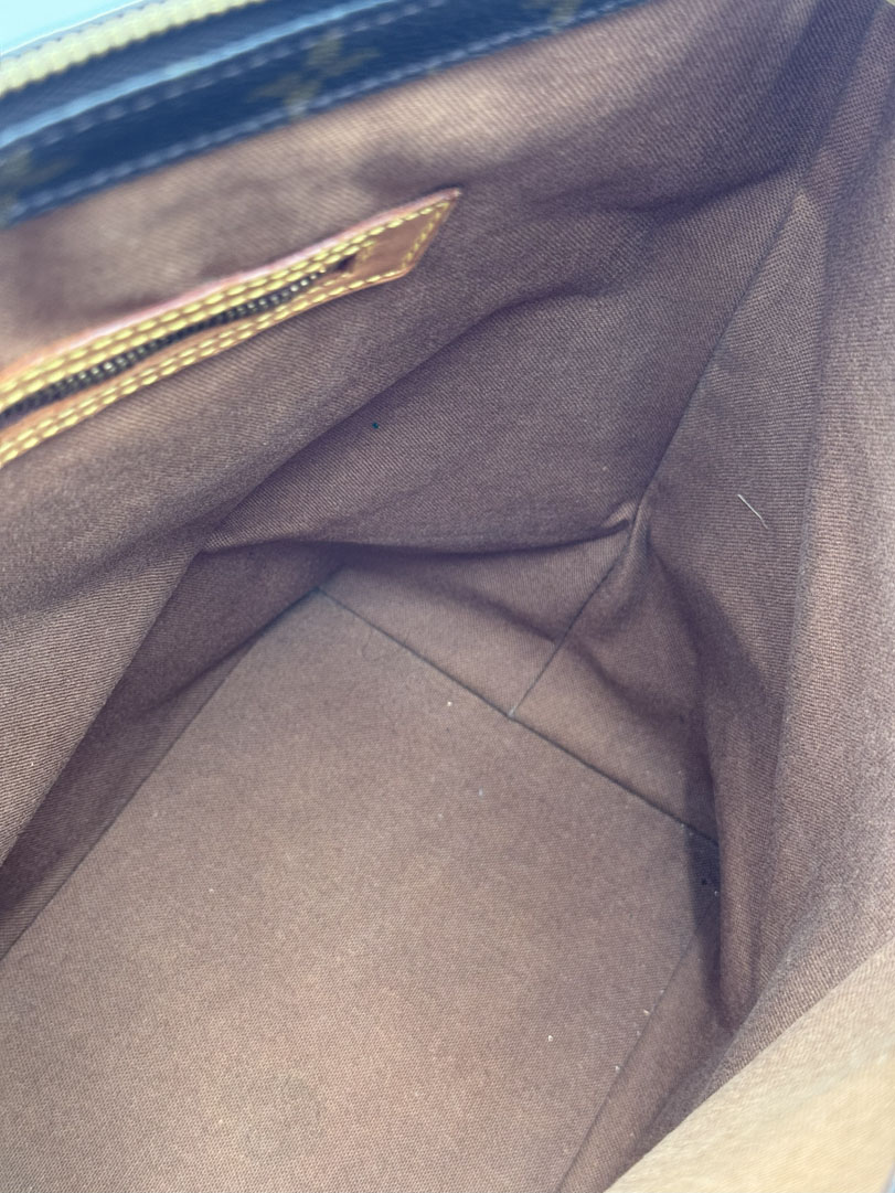 This vintage Louis Vuitton Monogram Cabas Mezzo Tote is a shoulder bag crafted from brown Monogram canvas with gold-tone hardware. It is in very good condition, with slight discoloration on the bottom and minor wear on the corners. The zipper works well, and the interior is clean with an extra pocket and a small additional pocket. Dimensions: 42 x 32 x 17 cm. The datacode is AR1929, from 1999.