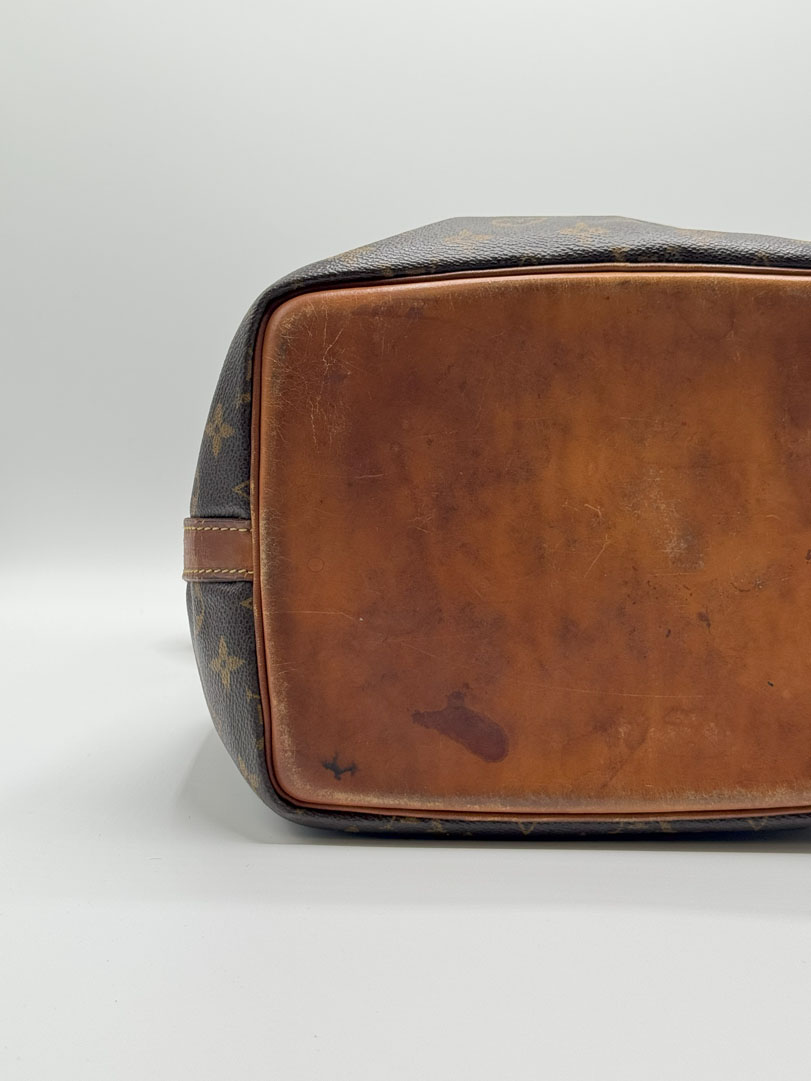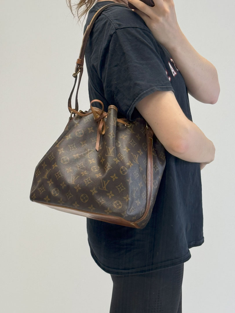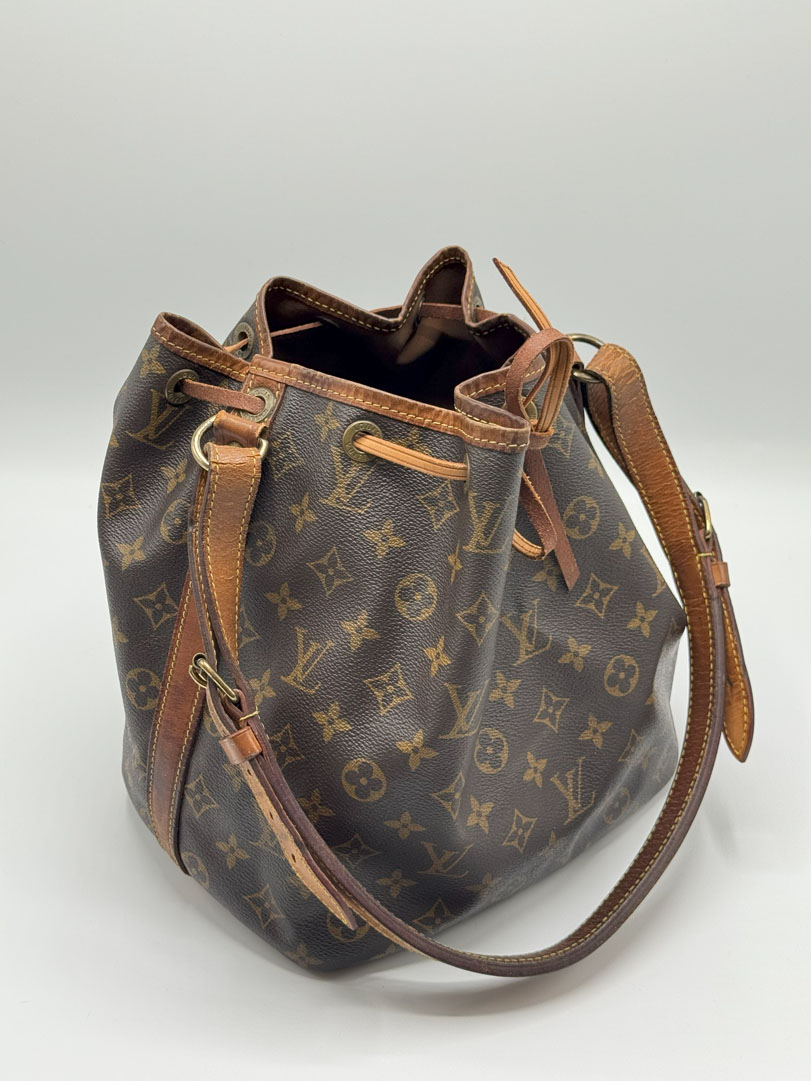 This vintage Louis Vuitton Monogram Petit Noé Shoulder Bag is a shoulder bag crafted from brown Monogram canvas with gold-tone hardware. It is in good condition, with the vachetta darkened and dry, showing cracks. The hardware remains in good shape, the interior is clean with an additional pocket, and the strap is adjustable. The datacode is AR0378. Dimensions: 25 x 28 x 20 cm.