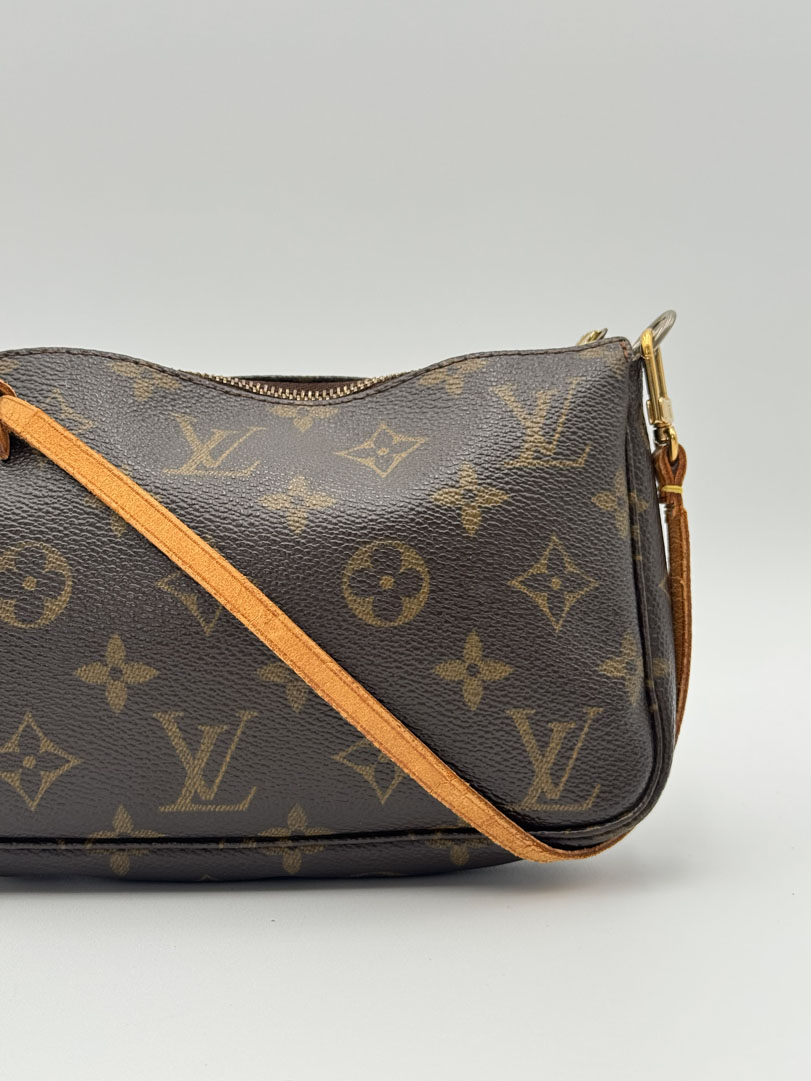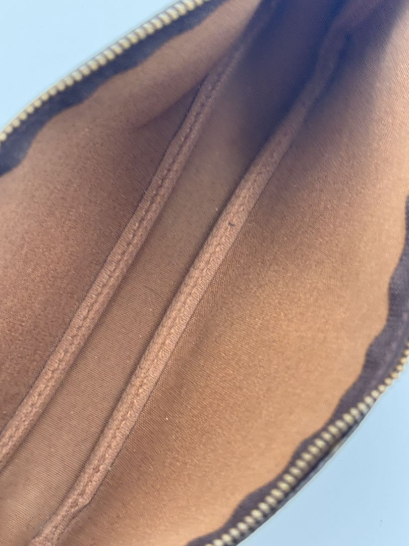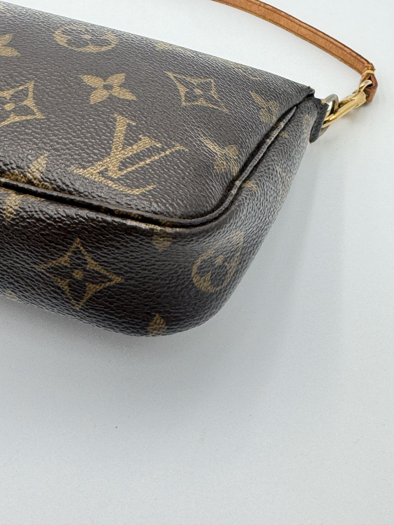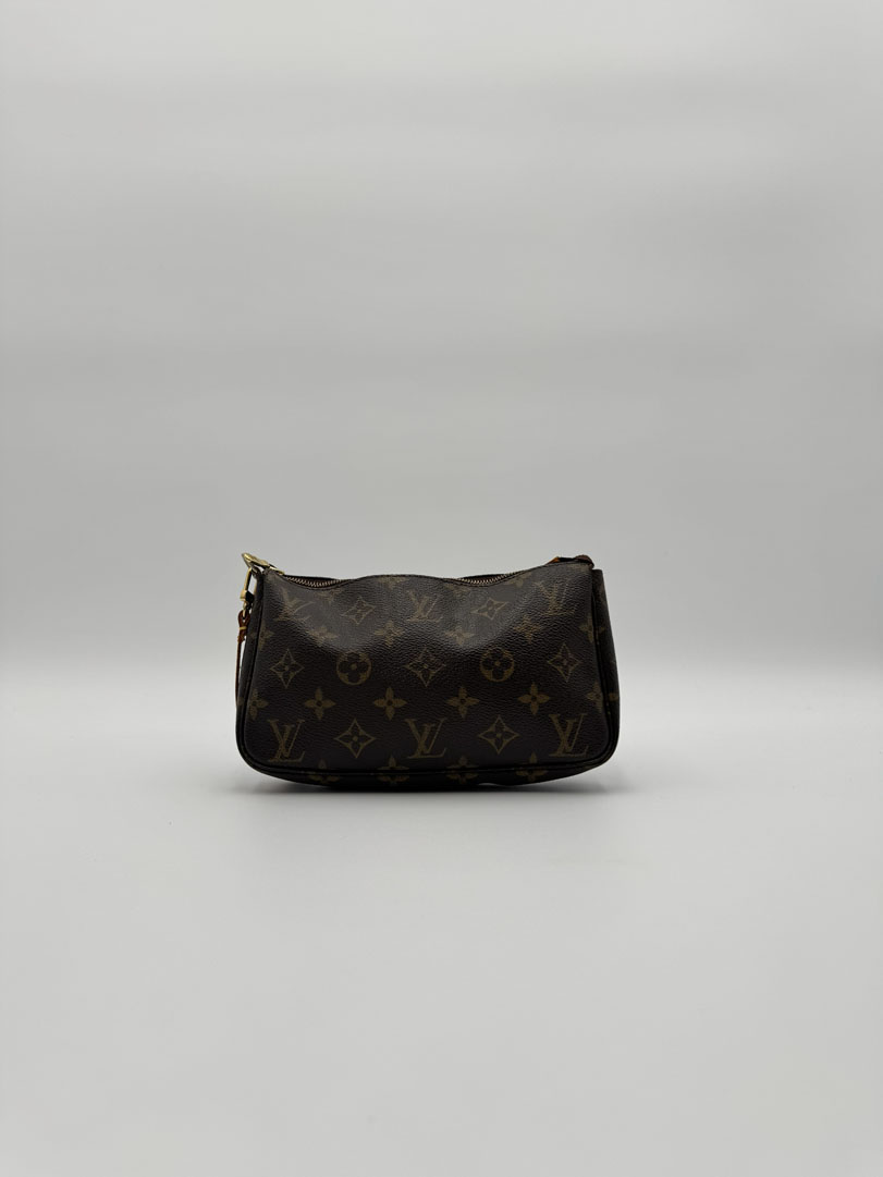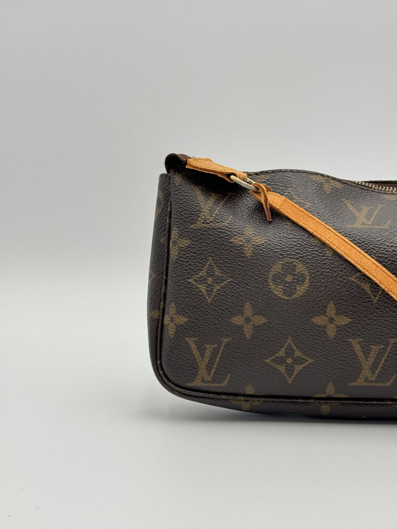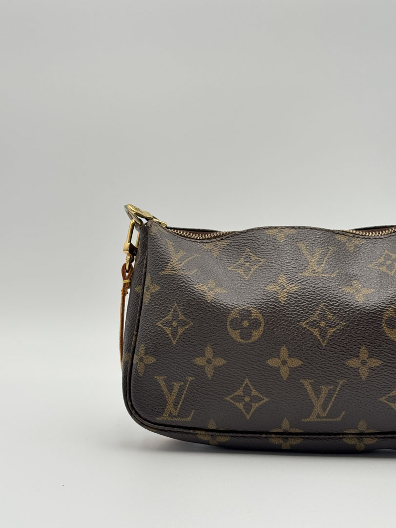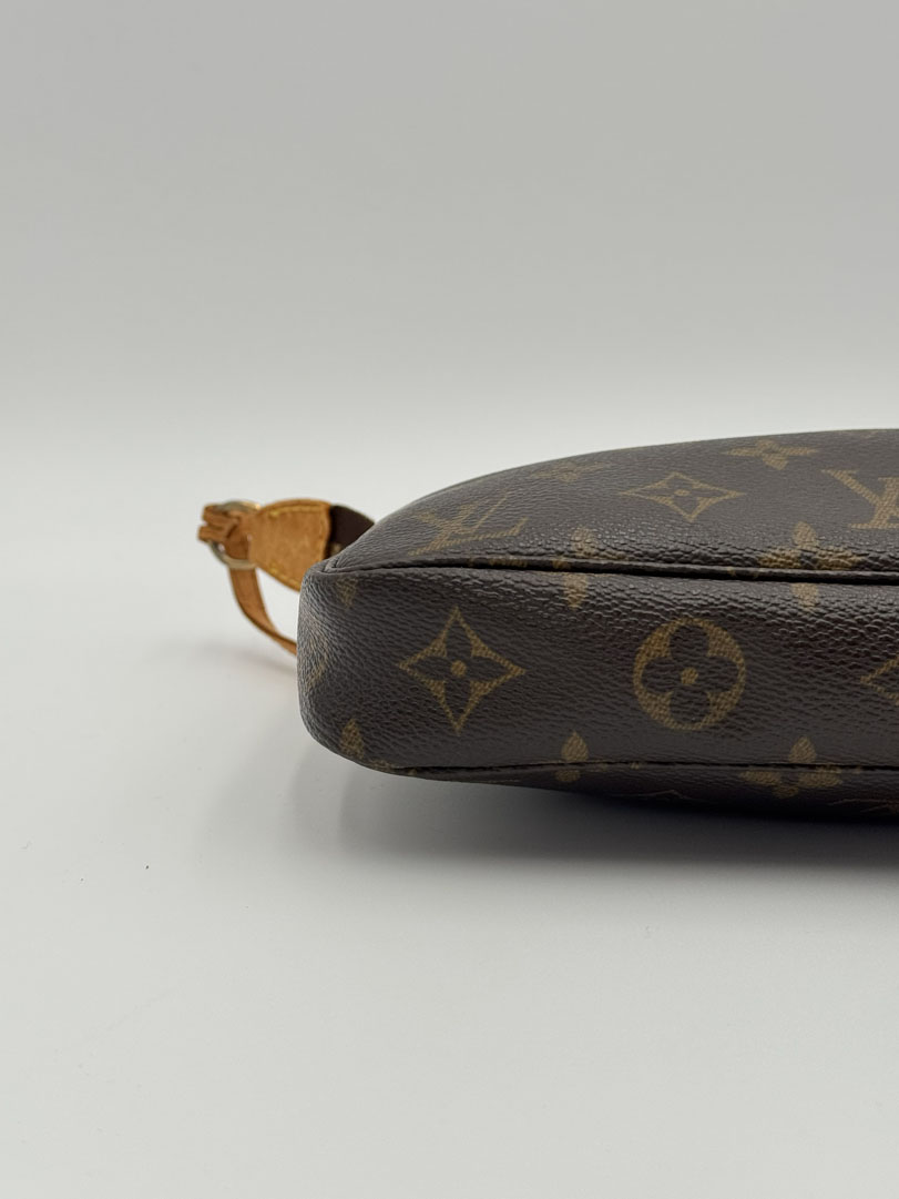This vintage Louis Vuitton Monogram Pochette Accessoires is a handbag made from brown Monogram canvas with gold-tone hardware. The item is in very good condition, showing some user signs such as wear on the strap. The interior is clean. This is a small pochette with a detachable wrist strap and can also be used as a clutch. The datacode is AR1022, from the year 2002, and the dimensions are 21 x 12 x 4 cm.