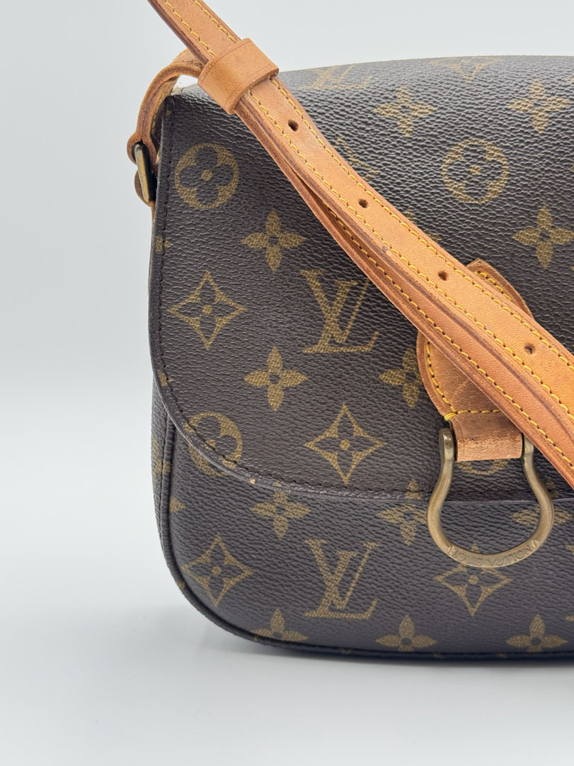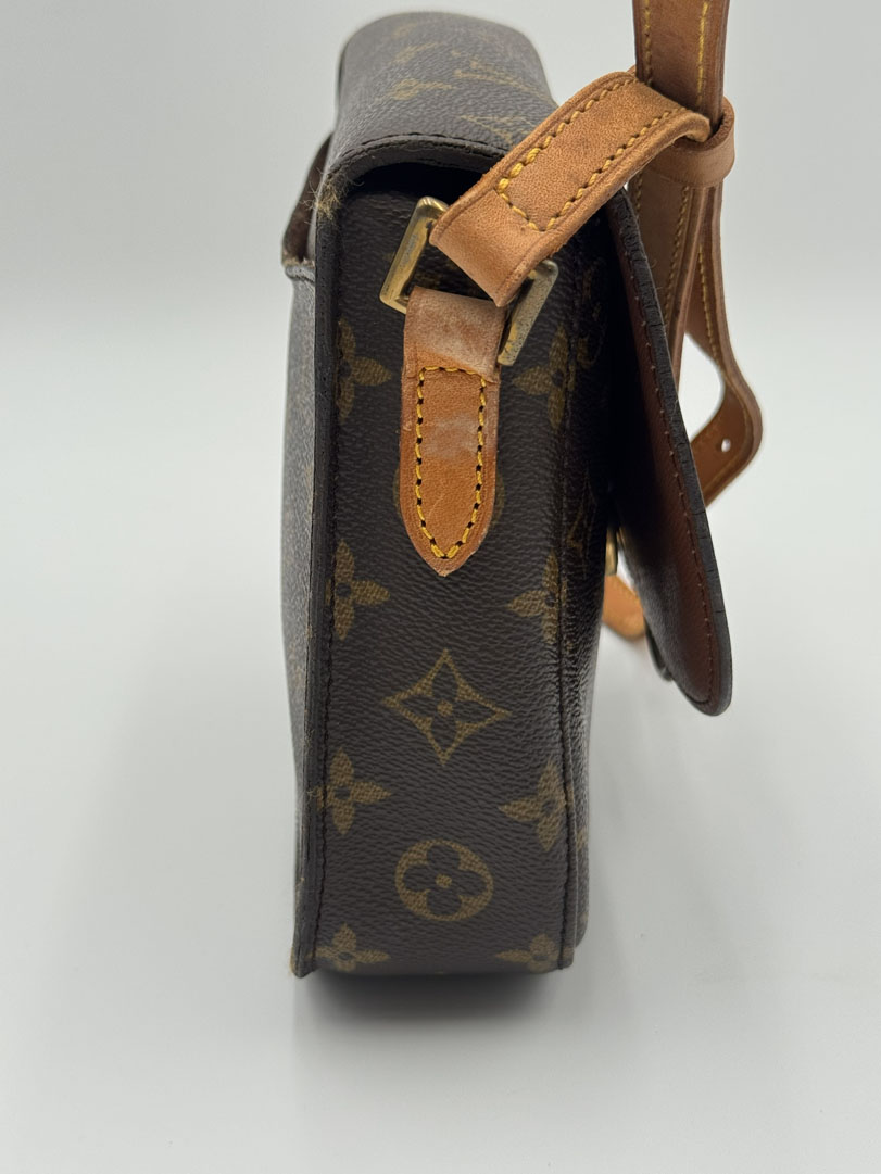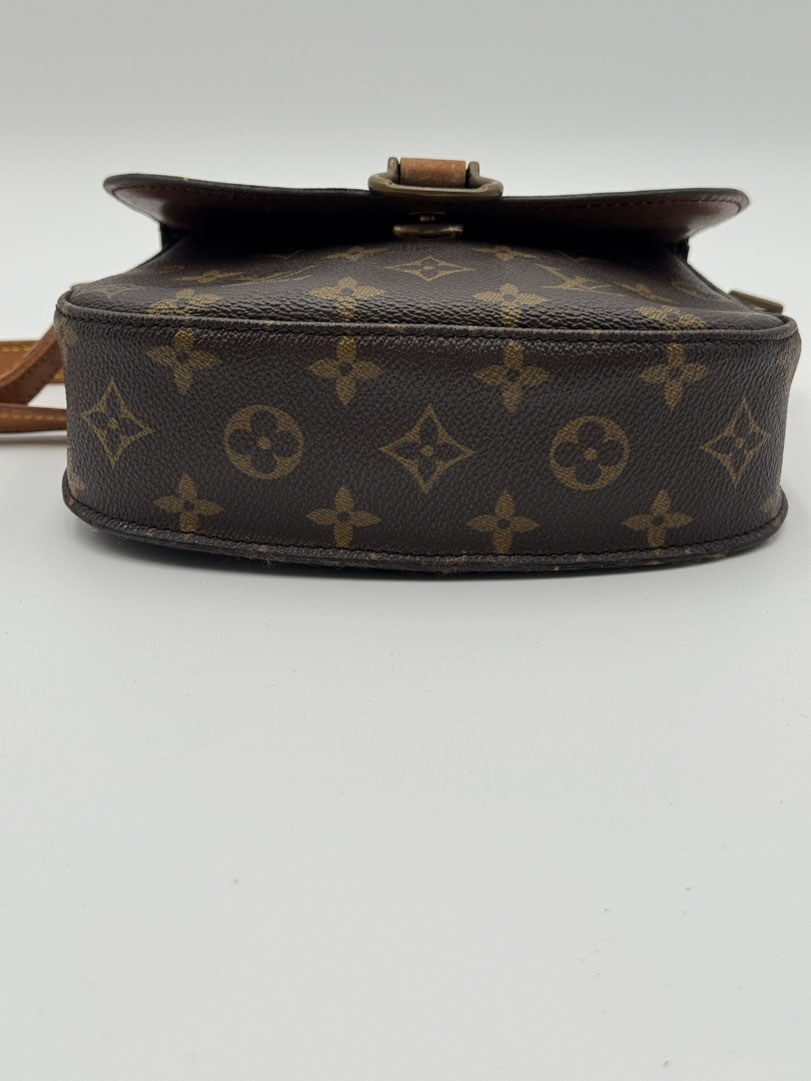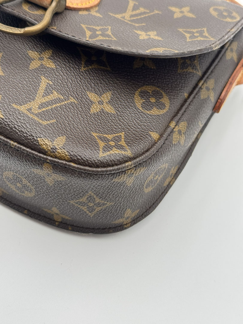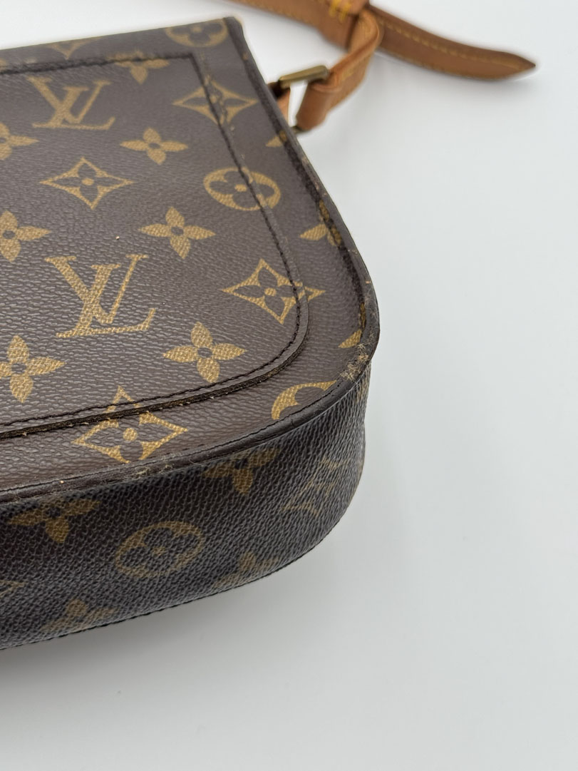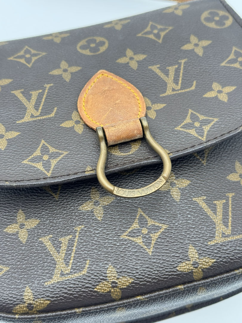 This vintage Louis Vuitton Monogram Saint Cloud MM is a crossbody bag made from brown Monogram Canvas with gold-tone hardware. The item is in very good condition, showing some user signs such as discoloration of the hardware and some small stains. The interior shows scratches, and the inner pocket shows peeling. Dimensions are 20 x 18 x 6 cm. The datacode is MI 881, from the year 1988. The strap is adjustable.