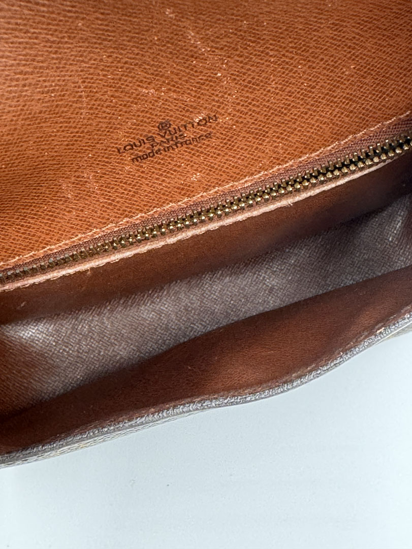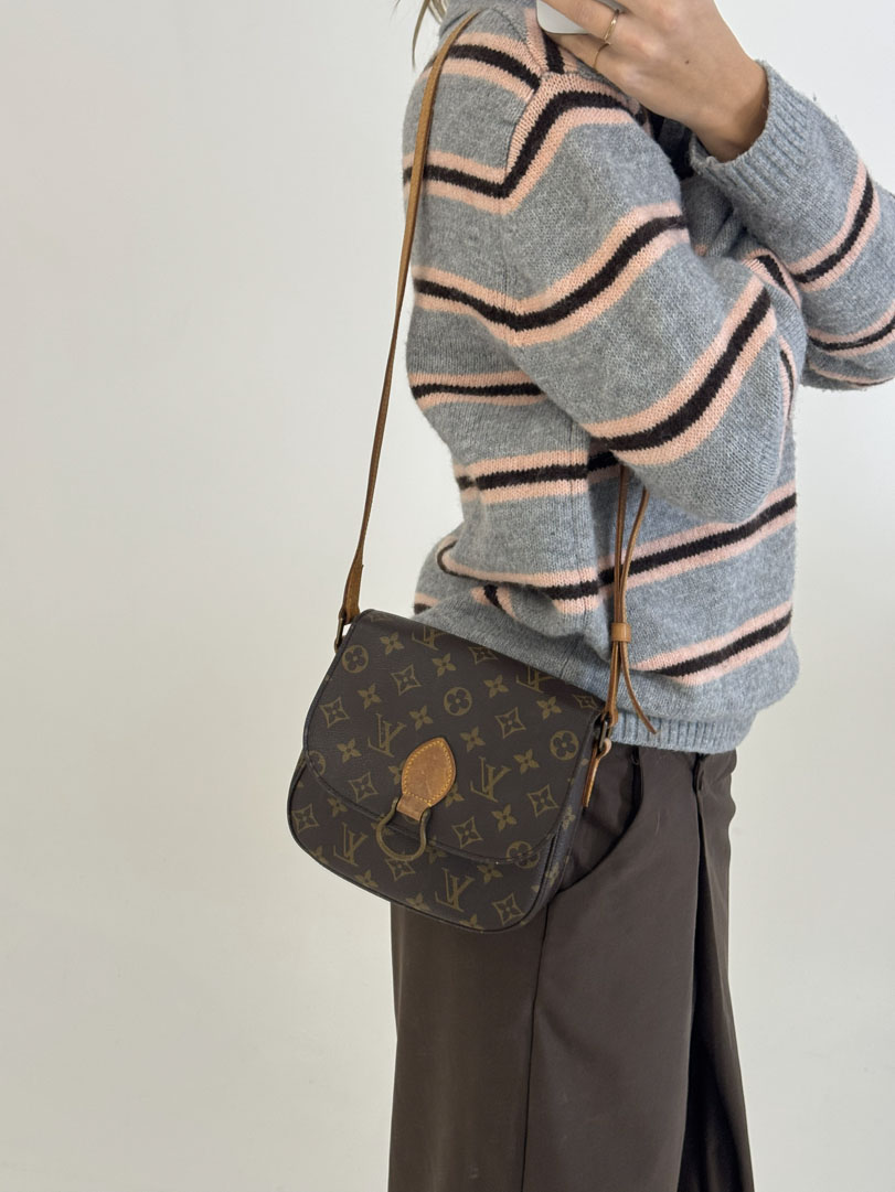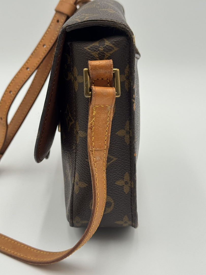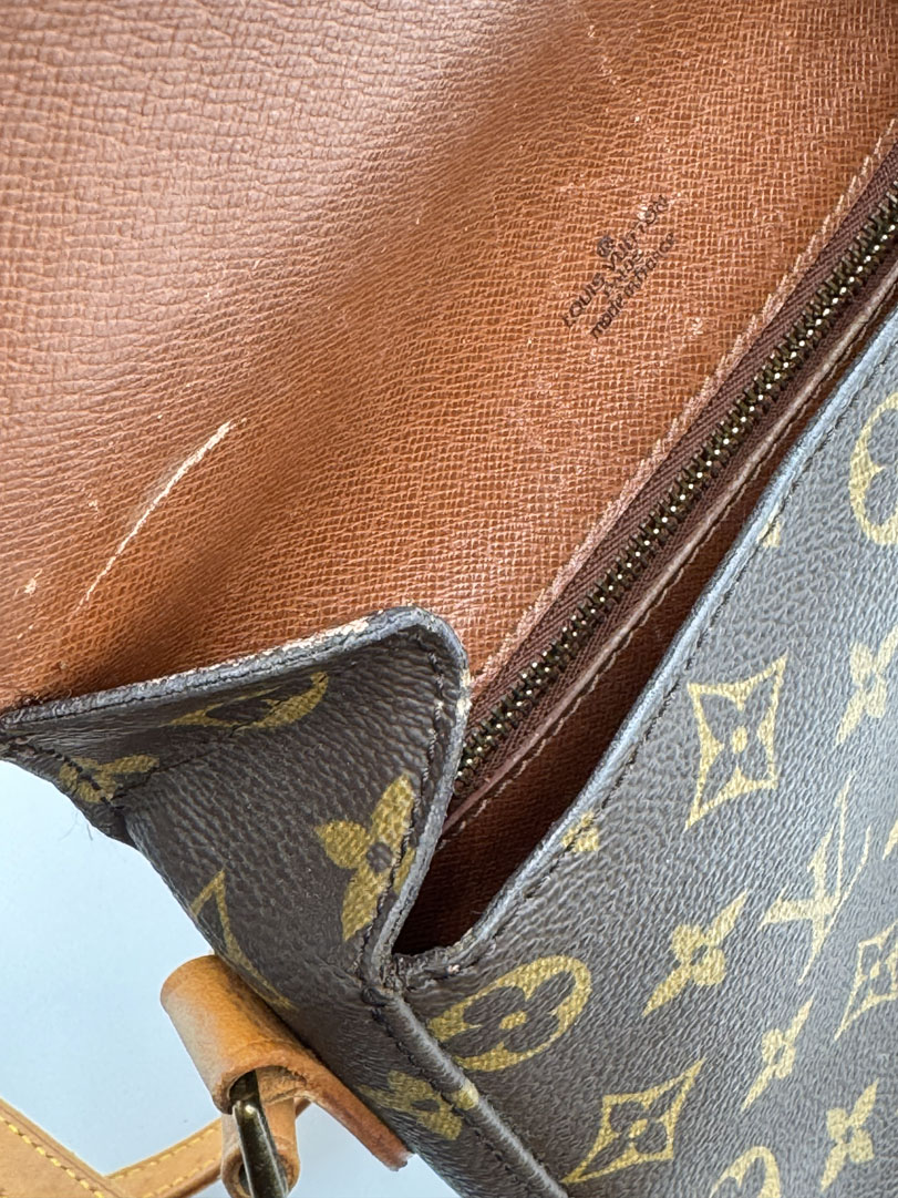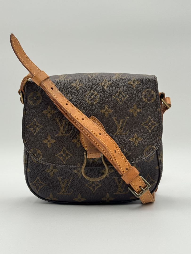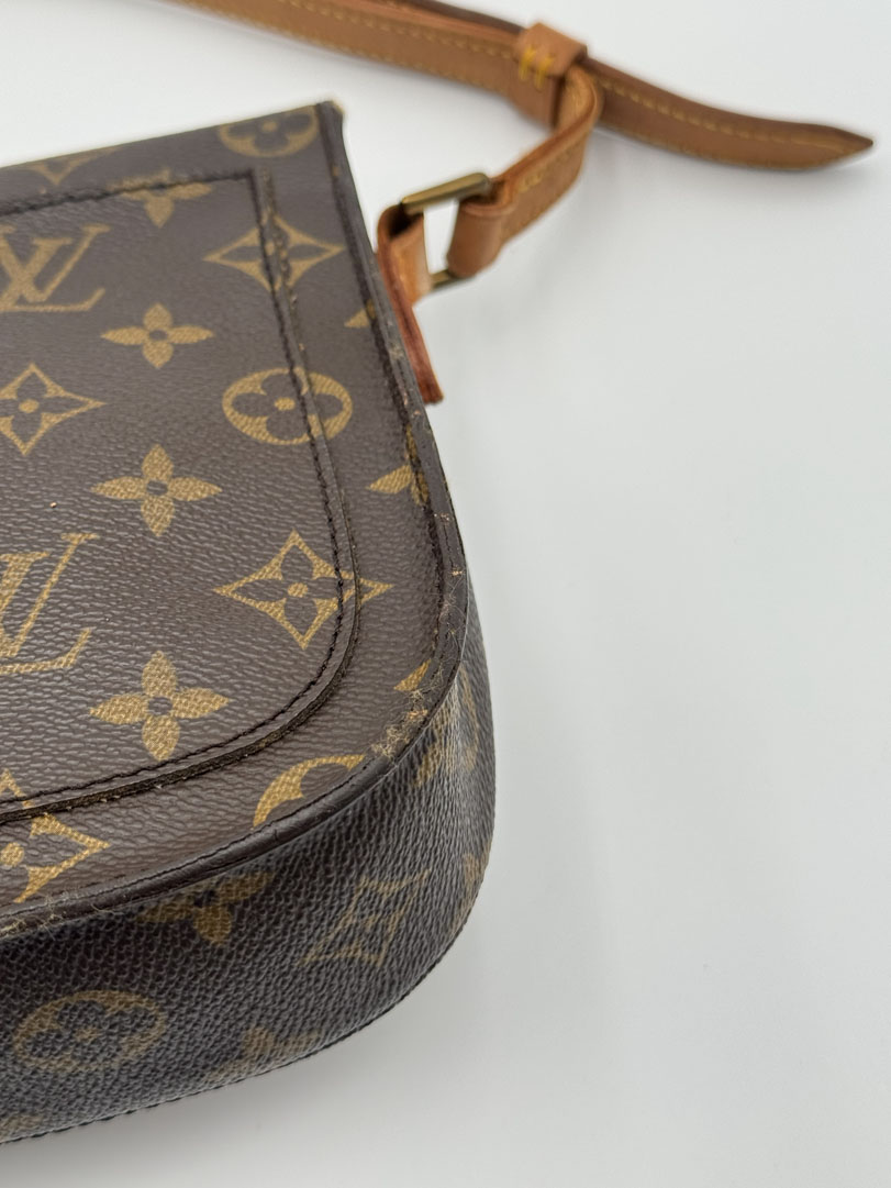 This vintage Louis Vuitton Monogram Saint Cloud MM is a crossbody bag made from brown Monogram Canvas with gold-tone hardware. The item is in very good condition, showing some user signs such as discoloration of the hardware and some small stains. The interior shows scratches, and the inner pocket shows peeling. Dimensions are 20 x 18 x 6 cm. The datacode is MI 881, from the year 1988. The strap is adjustable.