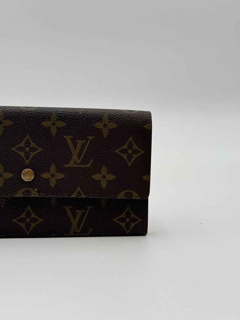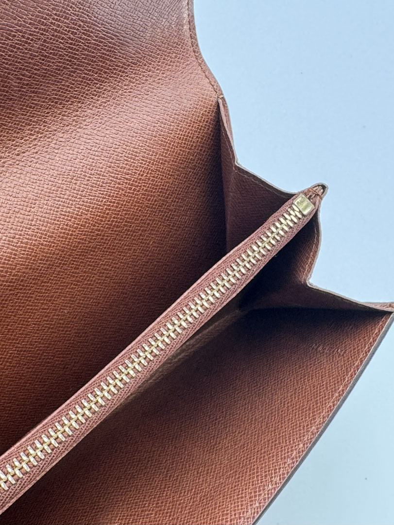 This vintage Louis Vuitton Monogram Wallet is a wallet crafted from brown Monogram canvas with gold-tone hardware. It is in very good condition, showing minimal signs of use. The hardware is slightly discolored, and the interior has minor scratches. The interior is clean with a zippered extra pocket. Dimensions: 19 x 10 cm. The datacode is AN0911, from 1991.